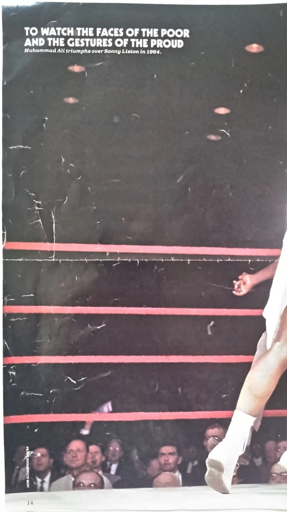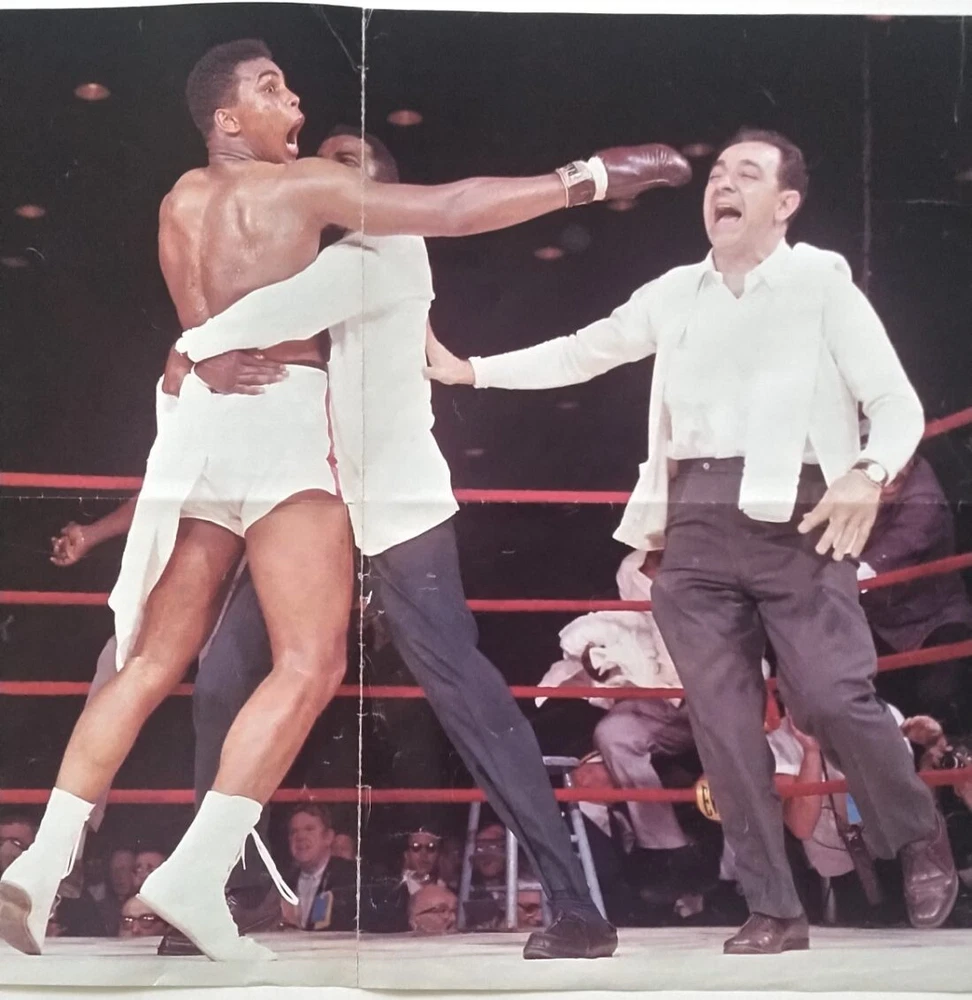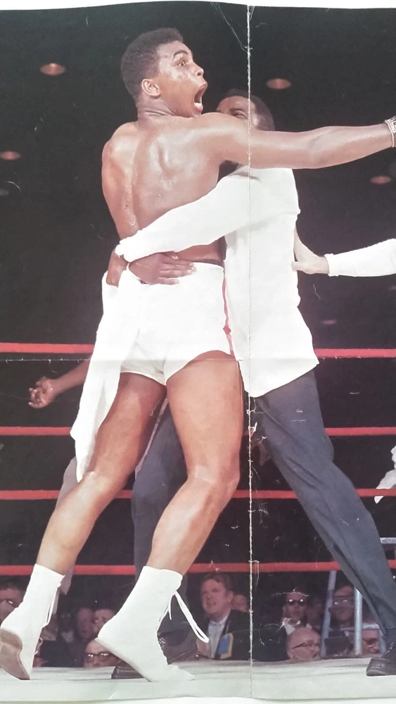 Vintage centerfold from a life magazine article" photo shows Ali's excitement over beating the Heavyweight Champion Sonny Liston in 1964, features in photo his trainers Drew Bundini Brown & Angelo Dundee" Its in good condition for age" Just see the photo's" center has been reinforced with tape was in two pieces when removed from magazine" measures 20"s x 15"s'' So if your into Boxing memorabilia this is for you" & makes a great edition for you wall room, shop, Bar, garage, mancave, etc... Well what more can I tell you"... and this can be yours" If the price is right" ("They say a Mirror can show what's on your Face" "But your Art Shows what's in your Soul") Comes shipped carefully rolled in a poster tube"... # Is too identify in tube