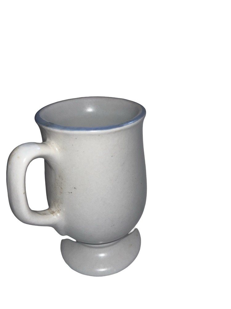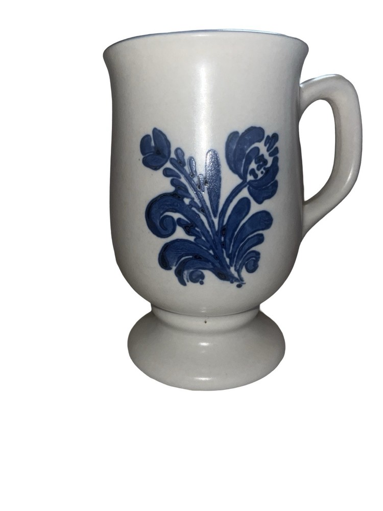 This vintage Pfaltzgraff Yorktowne stoneware mug from 1976 features a round shape with a Dutch Colonial style. It has a capacity of 9 oz and stands at 5 inches tall with a matte finish. The mug is decorated with a blue and white floral pattern, suitable for all occasions. It is dishwasher safe, has a handle, and is part of the American-themed production line.