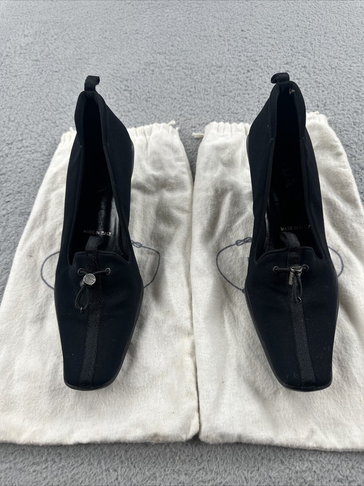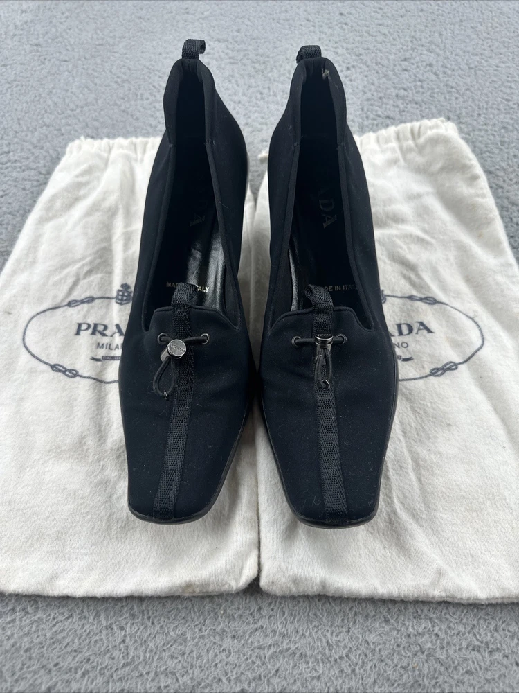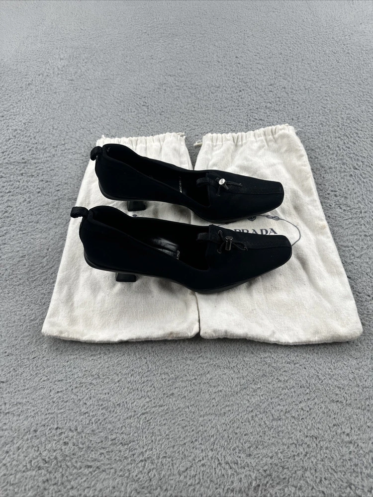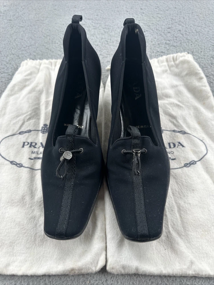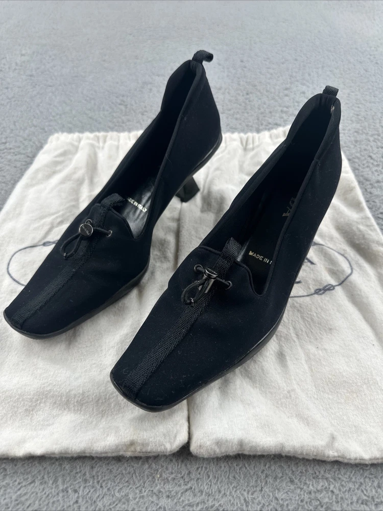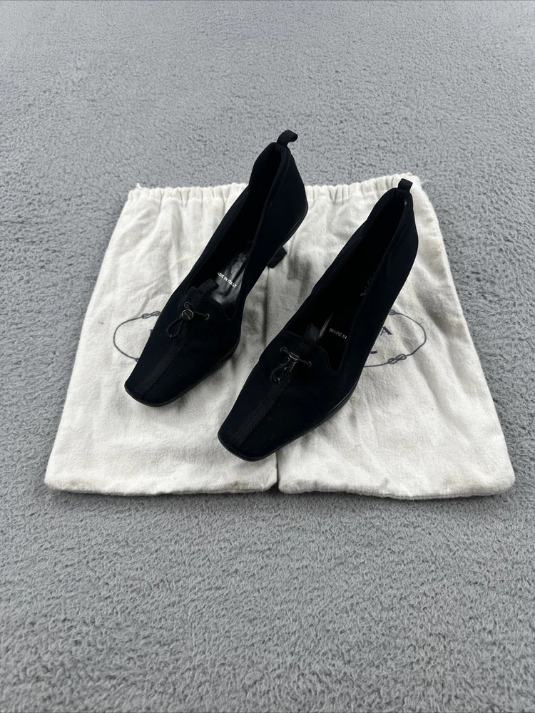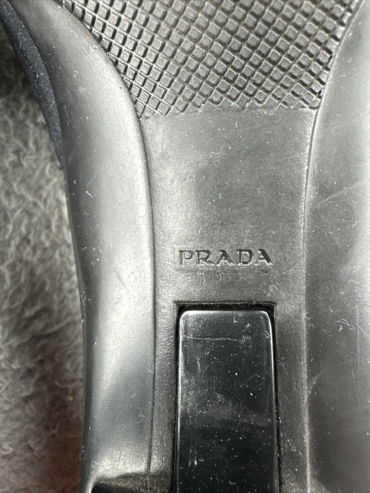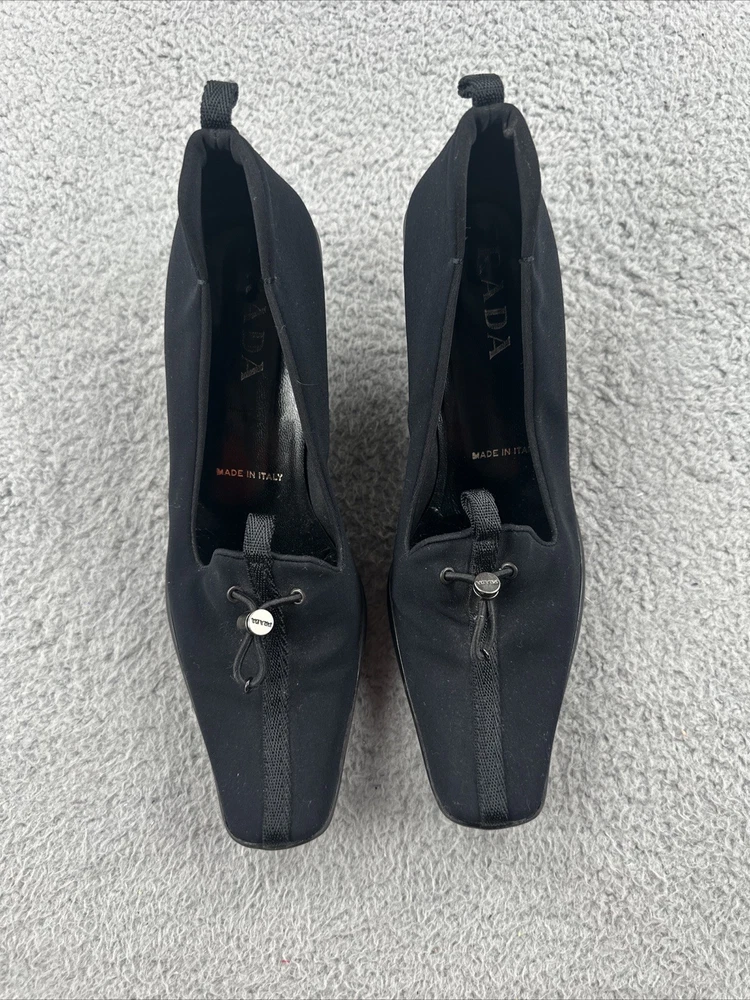 These vintage Prada heels from the 2000s are a stylish and rare find for any fashion-forward woman. Made in Italy, these black heels exude a sense of high fashion with a Y2K designer flair. The size 39 1/2 translates to a US women's size 8.5, making them perfect for special occasions like cocktail events. With their original design and high-quality craftsmanship, these Prada heels are a unique addition to any wardrobe for those who appreciate vintage luxury fashion.