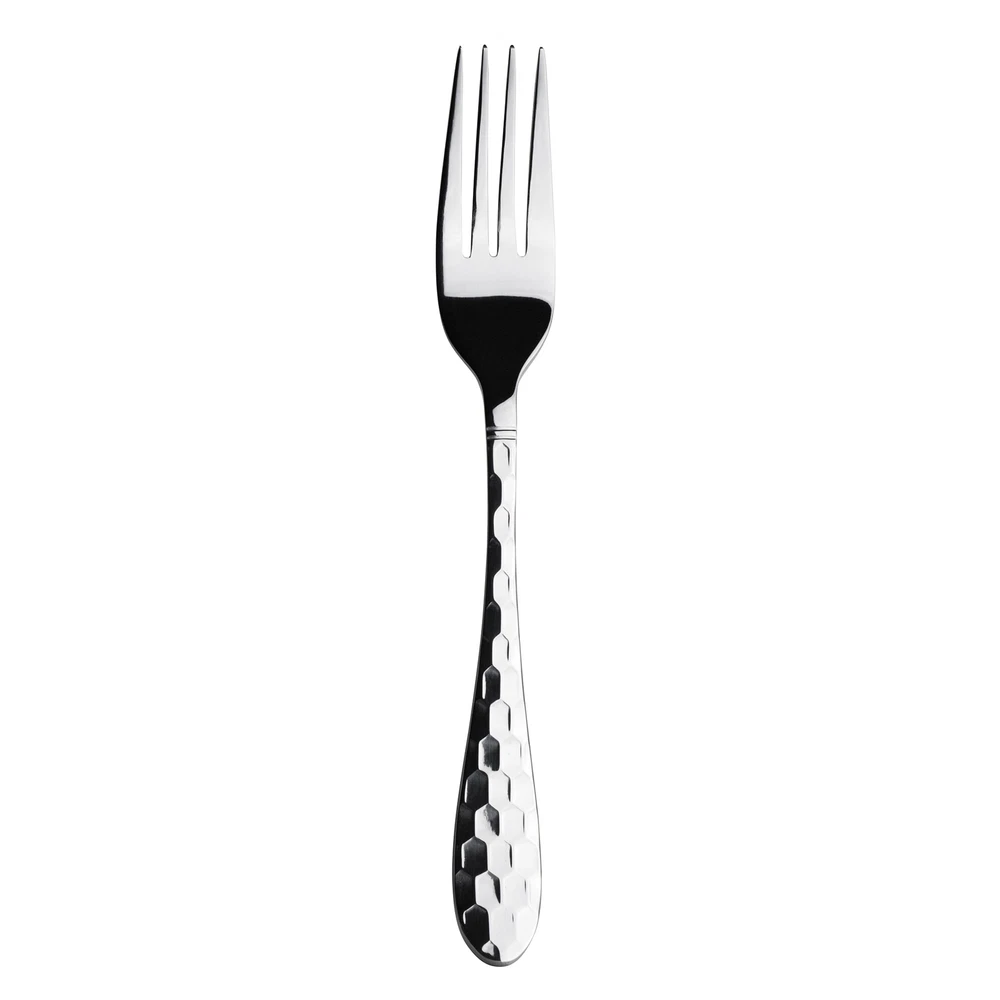 This 8" table fork from Varick is part of the Crystal Collection and features a honeycomb hammered finish that communicates class but is big on value. Model #: 5714SX021 18/0 stainless steel Heavyweight High quality mirror finish Faceted embossment with glistening effect "