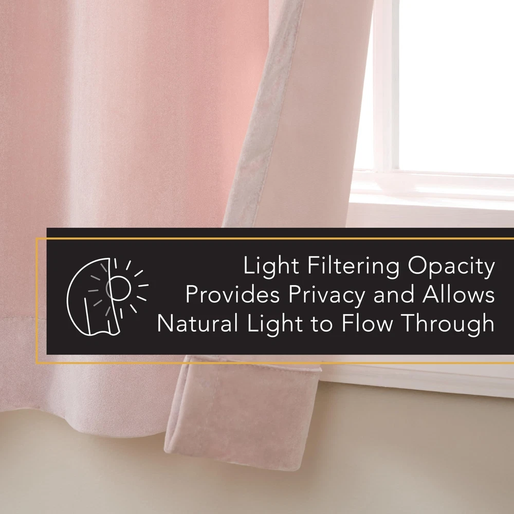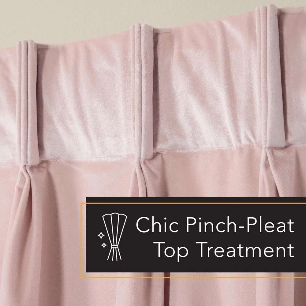 The Velour Solid Heavyweight Velvet Light Filtering Triple Pinch Pleat Curtains are a luxurious addition to any room. Woven with ultra-plush velvet, these indoor curtains are stylish, ideal for blocking natural light, and providing privacy in your home. This light blocking curtain panel set has a beautiful heavyweight texture with a subtle lustrous look. The triple pinch pleat top treatment offers a timeless look using back tabs to fit your favorite curtain rod, making them ideal window treatment for any space. These decorative curtains fit curtain rods up to 1.5” in diameter. For proper look and fullness, the curtain panels should measure 2-3 times the width of your window/opening. Hand wash only. Velour Solid Heavyweight Plush Velvet Indoor Curtain Panel Set Includes (2) curtain panels, each measuring 27"W x 108"L. Light Filtering Opacity provides privacy while allowing some natural light to shine through 100% Polyester, with plush velvet feel Triple pinch pleat top treatment with back tabs for hanging Overall fabric width of 54" at bottom of panel provides full luxe look Hand wash cold with like colors. Only non-chlorine bleach, as needed. Line dry. Cool iron.