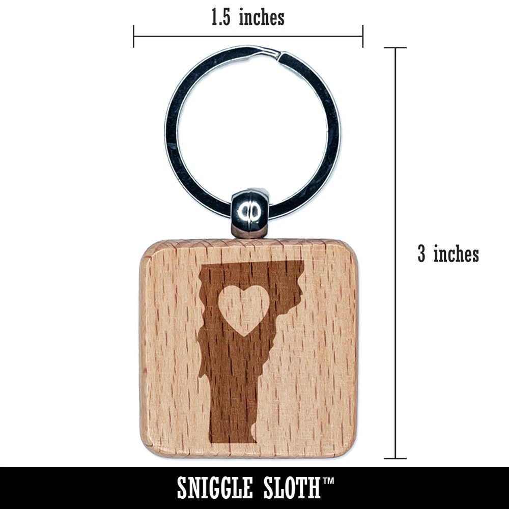 Vermont State with Heart Engraved Wood Square Keychain Tag Charm