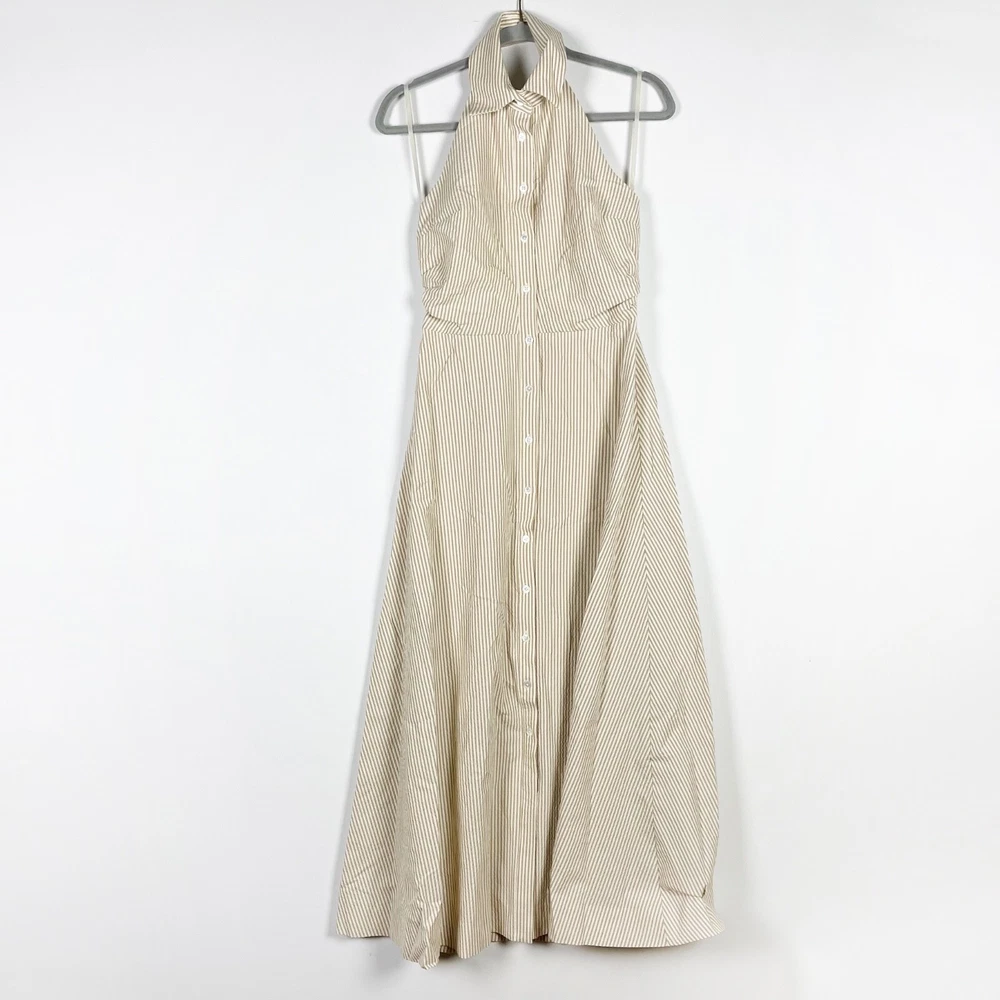 Veronica Beard Mackey Seersucker Halter Button Front Sleeveless Collared Dress 4 98% cotton, 2% elastane Lining: 100% polyester Length 51.75" [Levoff]