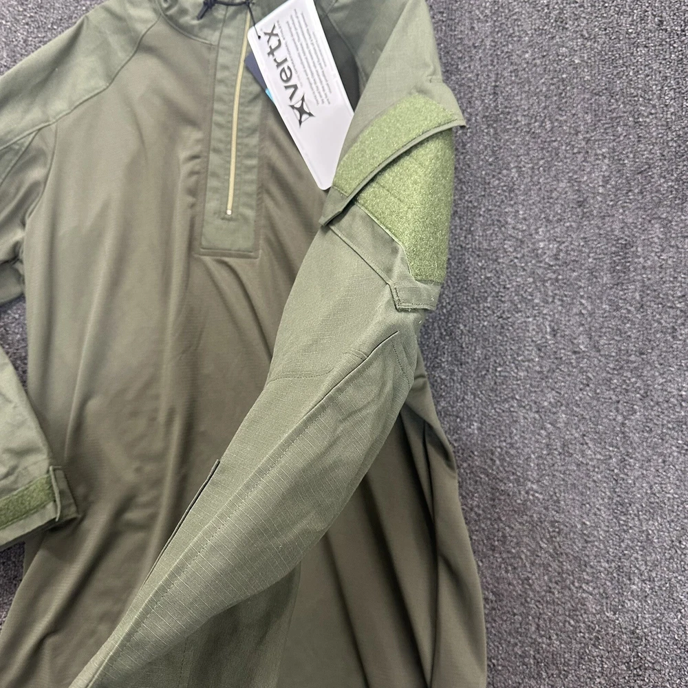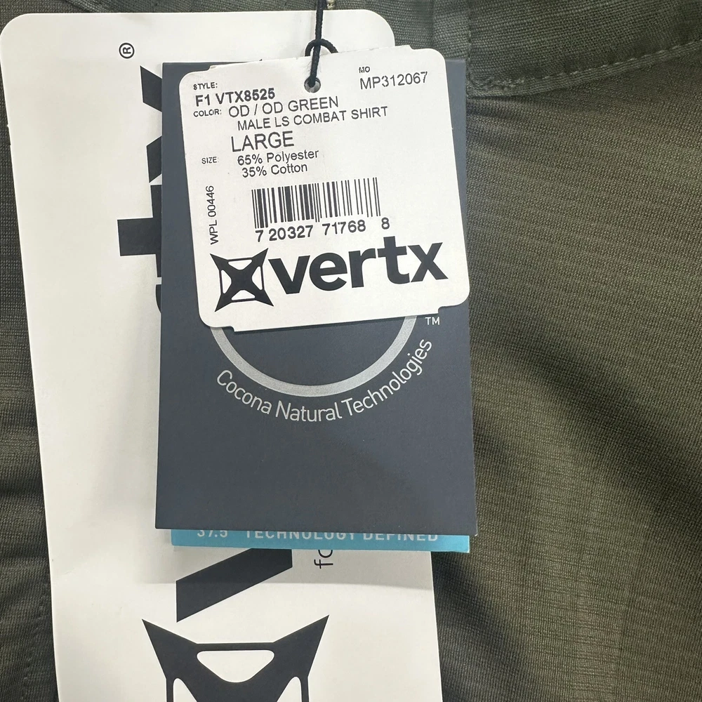 The Vertx Recon Combat Shirt is a men's long sleeve military tactical shirt in size L, designed in a solid green color. Made from a durable polyester cotton blend material, this shirt is ideal for outdoor activities and tactical missions. With its high-quality construction and brand reputation, this shirt provides both style and functionality for those who require reliable gear in demanding situations. New with tags (NWT), this shirt offers a fresh and unworn piece ready for any adventure.