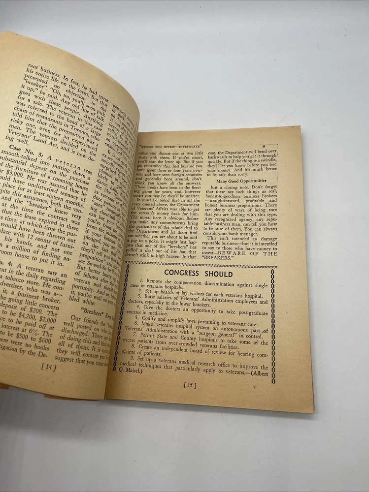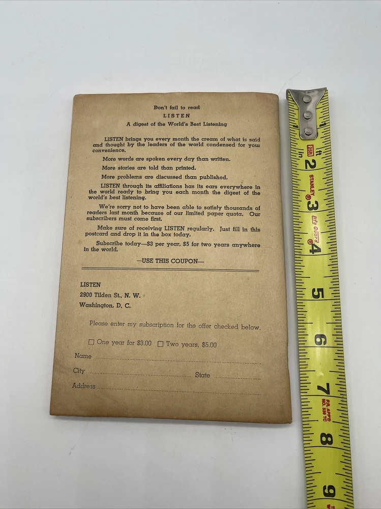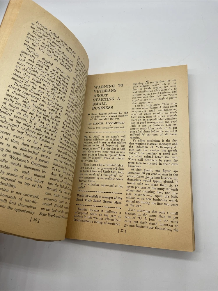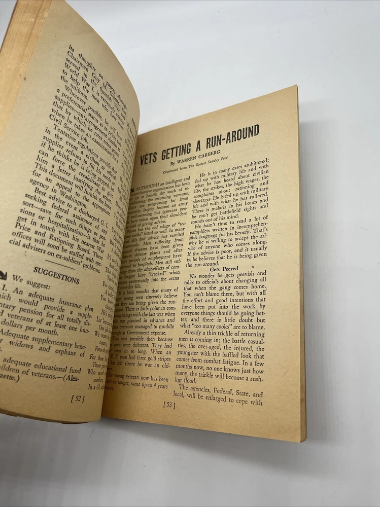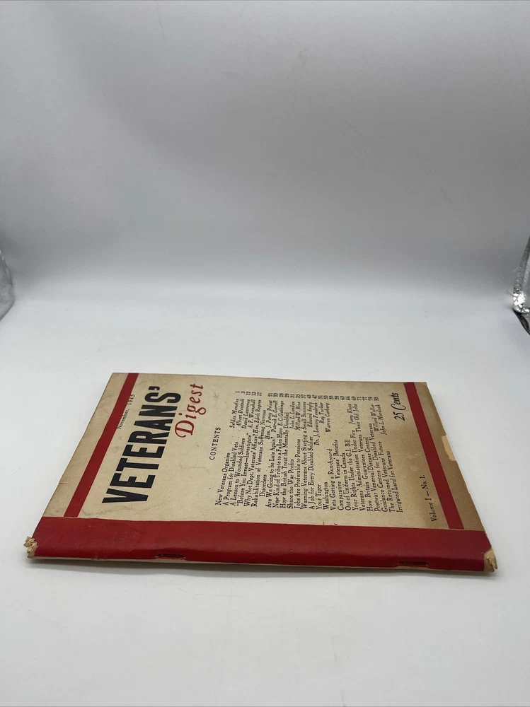 This is the November 1945 edition of Veteran's Digest, with a focus on veterans and their experiences. It is the first issue of the magazine and includes a variety of articles covering topics such as war stories, veteran's benefits, and the challenges that veterans face when returning to civilian life. The magazine is written in English and was published monthly, with this particular issue being the first one released. The magazine is in very good condition and has been well-preserved over the years. It is a valuable piece of history that provides insight into the experiences of veterans during and after World War II. This edition includes issue number one and would make a great addition to any collection of wartime or veteran-related publications. 96 pages