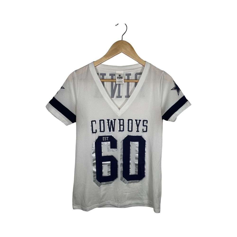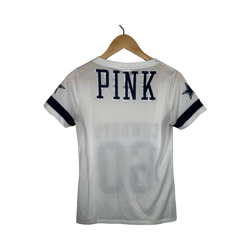 The Victoria's Secret Pink Women's Dallas Cowboys White and Blue Jersey in size Small is a stylish and comfortable top designed for female fans of the Dallas Cowboys. Made of polyester material, this jersey features a V-neckline and short sleeves, perfect for showing off team spirit in a sporty and fashionable way. The white and blue color scheme, along with the Dallas Cowboys theme, make this jersey a unique and eye-catching addition to any sports fan's wardrobe.