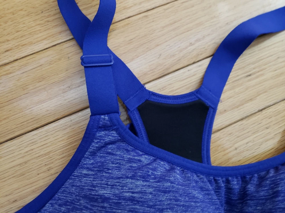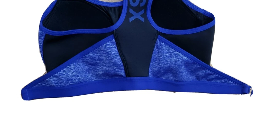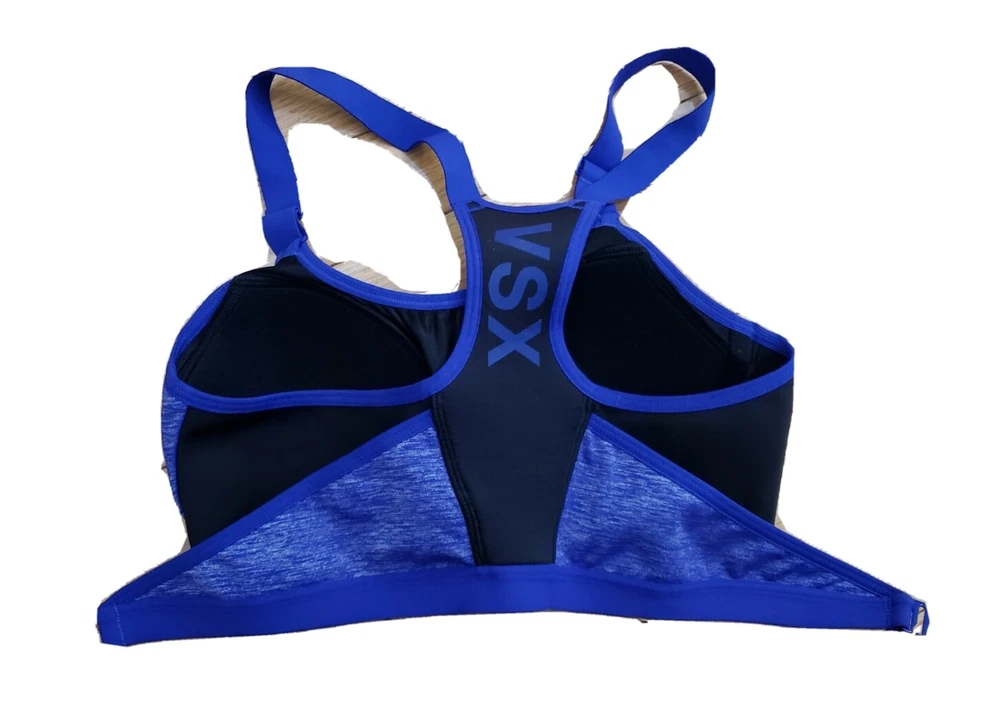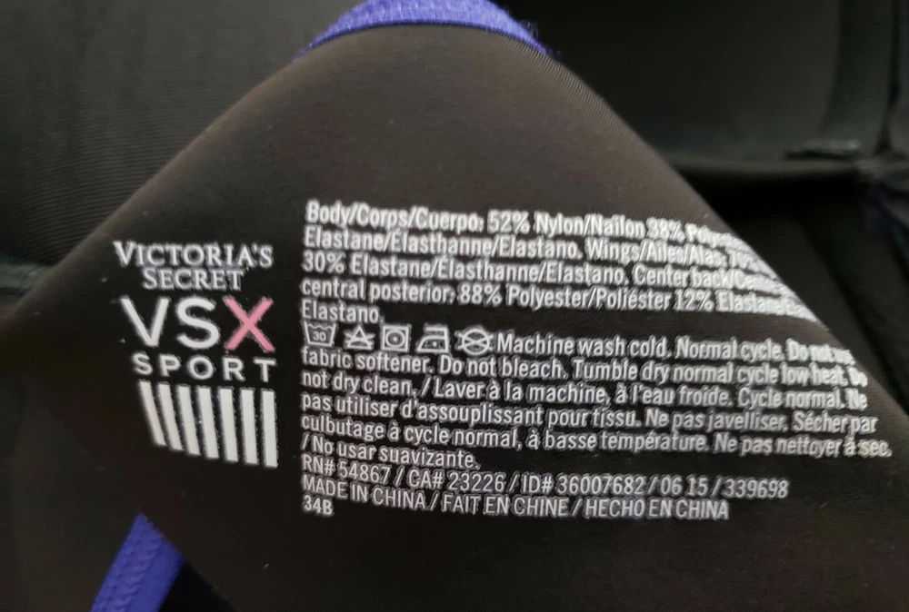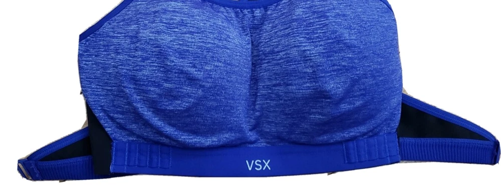 Victoria's Secret VSX Sport bra padded Good pre-owned condition, no flaws Body: 52% nylon, 38% polyester 10% elastane Wings: 70% nylon, 30% elastane, Center back: 88% polyester, 12 % elastane Sports bra slips on over head, hooks in front No underwire Marked a size 34B