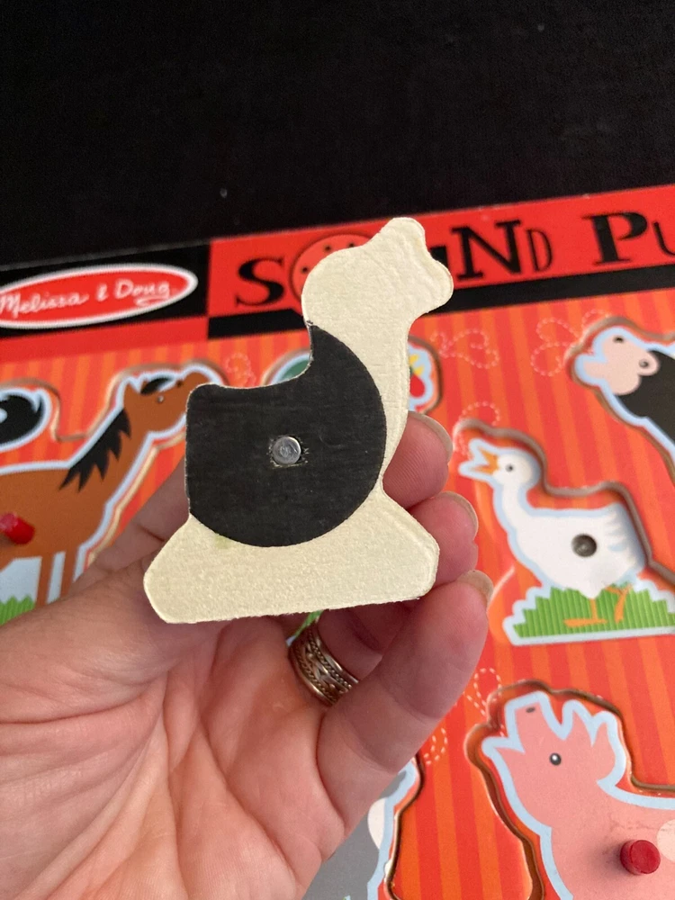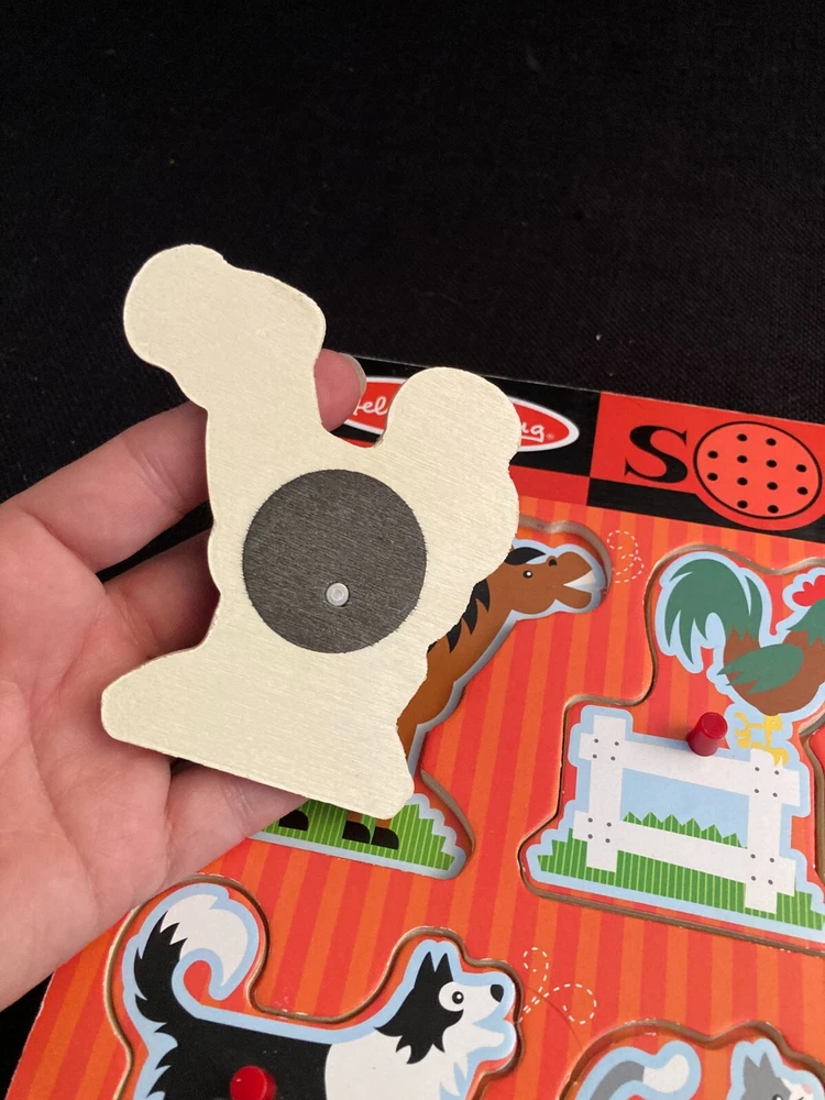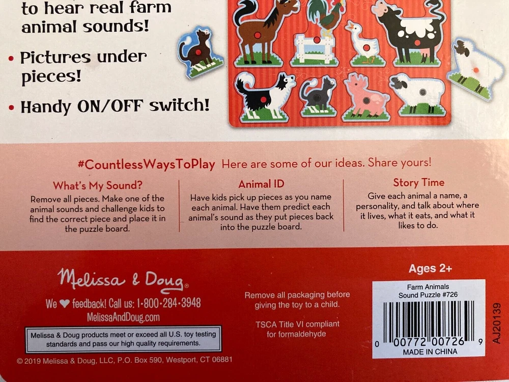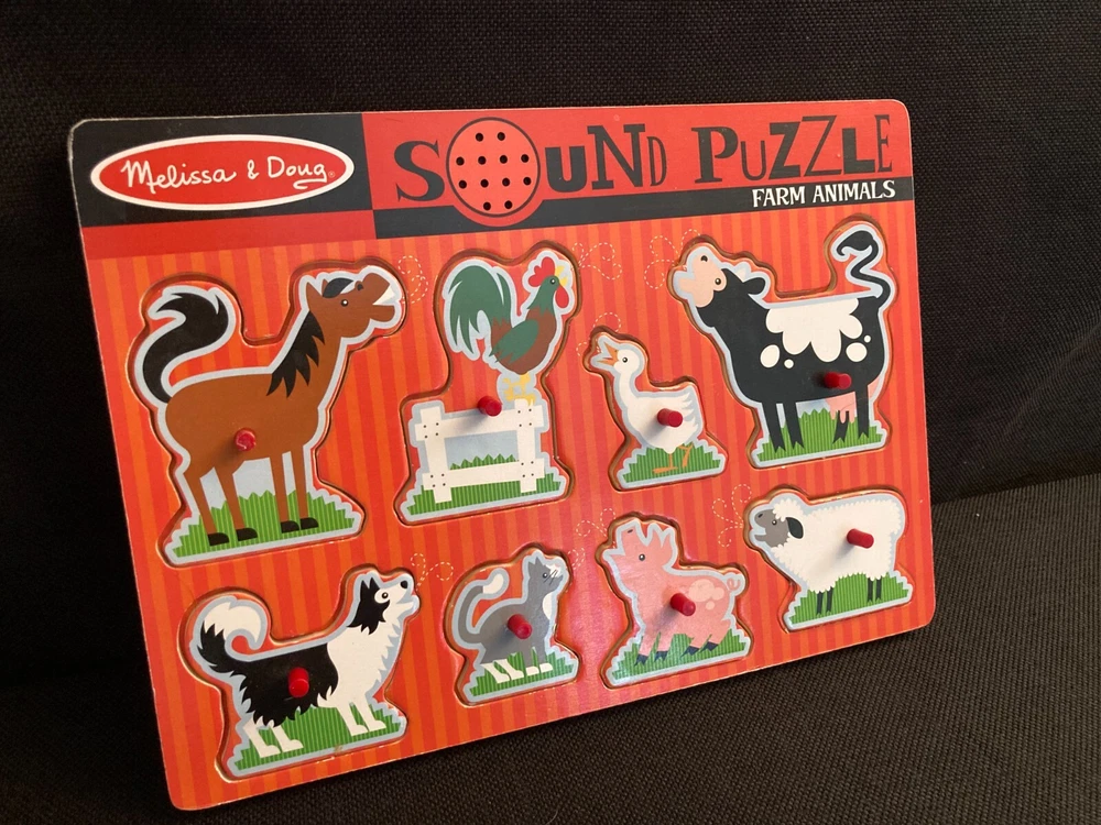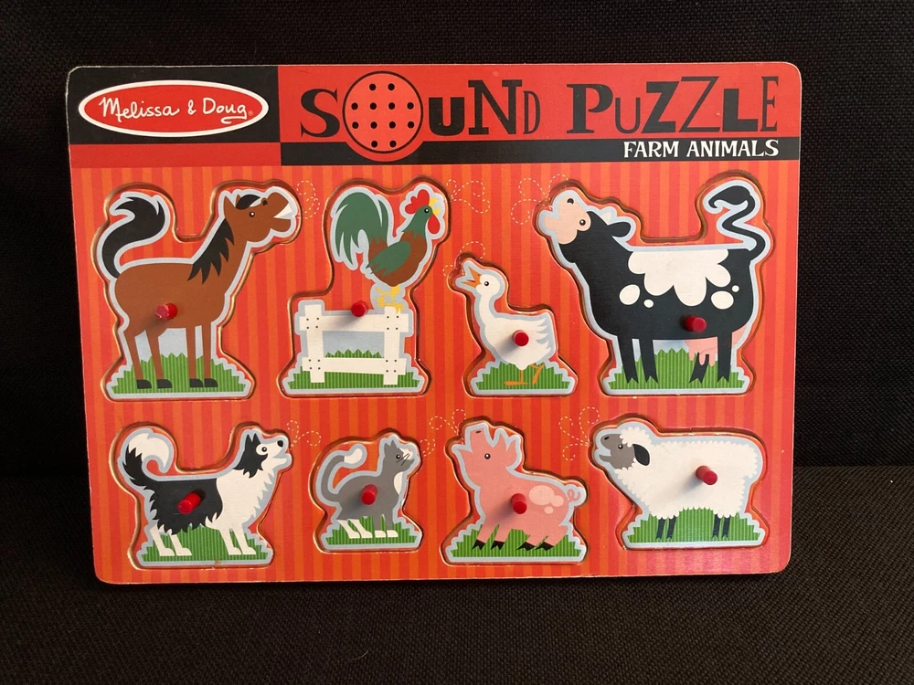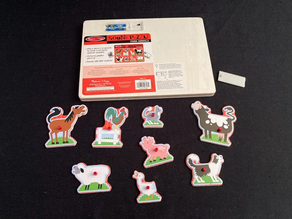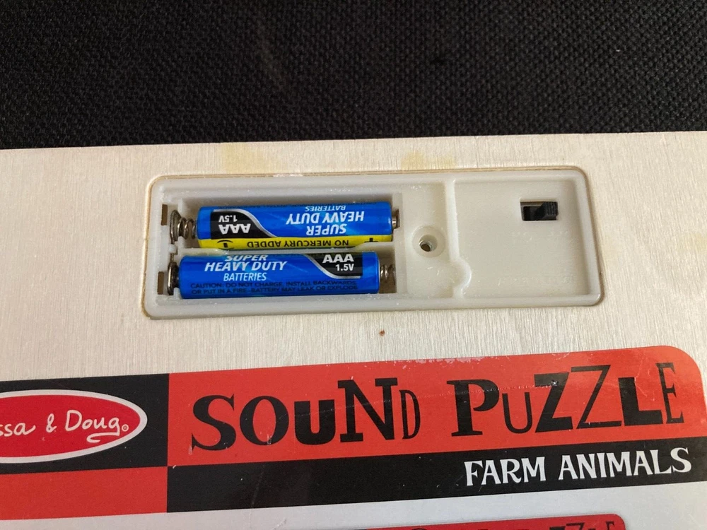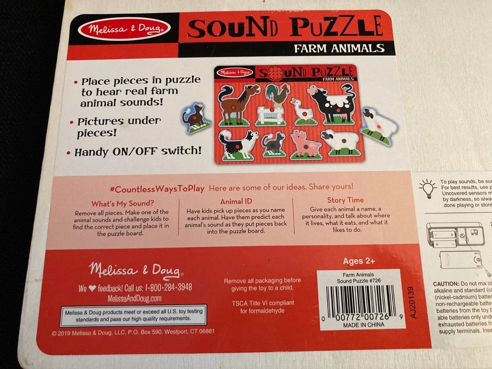 This Melissa & Doug Sound Puzzle is a fun and interactive activity board for children ages 2 and up. It features farm animals and includes pieces made of wood, magnets, and plastic pegs. The puzzle is perfect for children aged 1-4 years old and is a great addition to any toy collection. Requires 2 AA batteries- not included. It is a great way to encourage learning and development while entertaining your child with realistic farm animal sounds! (watch video for reference)