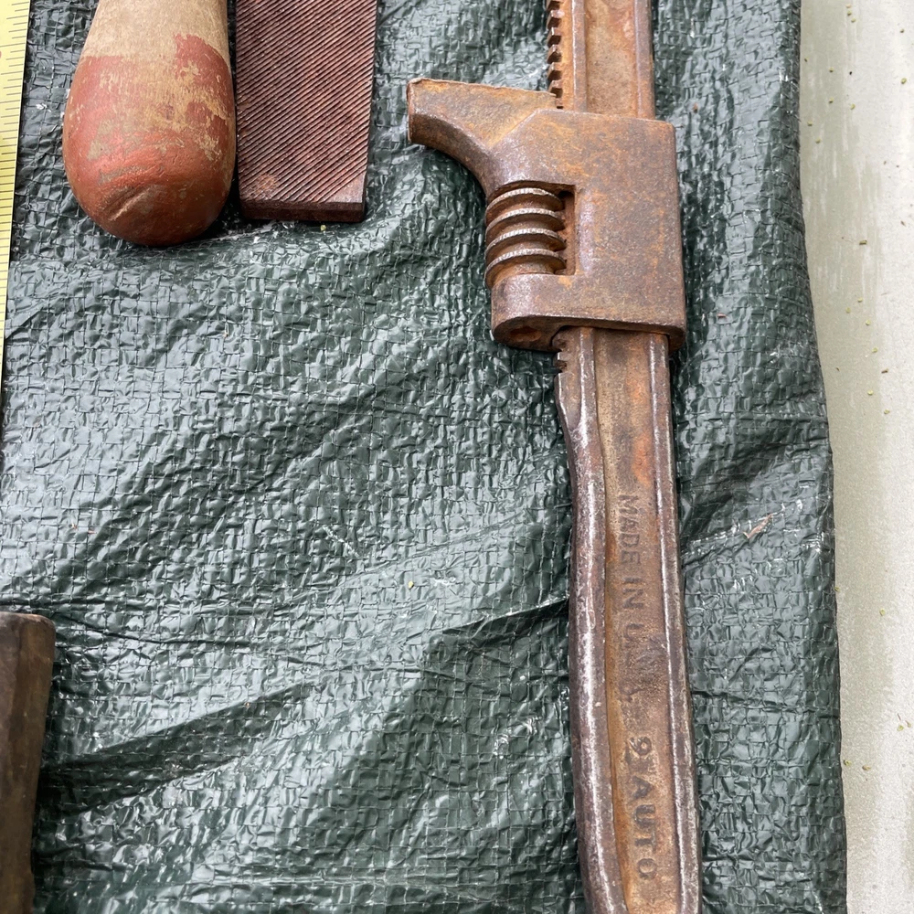 This product is a set of 15 antique 1900s adjustable wrenches, nippers, hammers, rasps, and files, along with a reversible screwdriver. These vintage tools would be a great addition to any collectibles or tools enthusiast's collection. The set includes a variety of tools that were commonly used in mechanics and woodworking during the early 1900s, offering a glimpse into the craftsmanship and techniques of the past. One wrench, Trademark brand, has a wooden handle and looks to be in excellent condition. Great old old blacksmithing tool and cutters nippers. Stamped “Champion Dearment Meadsville PA” 2 files/rasps 1 Vintage 14" Wood Rasp File Round curved Rare 1 Vintage 14” Wood Rasp Steel File Flat