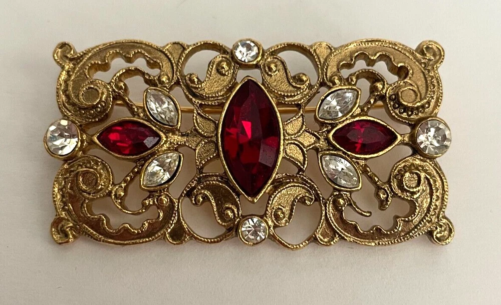 Vintage 1928 Brand Red & Clear Jeweled Brooch Lapel Pin Gold-tone 2" Jewelry #83 This is a charming vintage 1928 brand brooch. It measures 2" wide x 1" long. It is gold-tone and has red and clear rhinestones on it. This would look gorgeous for any occasion! This is a timeless and classic piece! Add it to your collection today! Please look at all photos and ask all questions before purchasing. Check back regularly as we list new items daily. Thanks for Stopping by today!