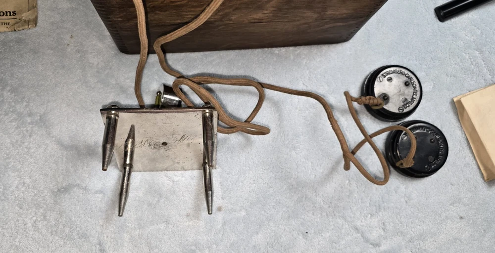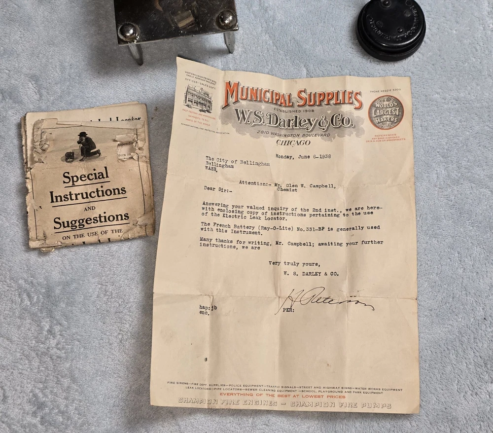 This vintage 1930s electric leak detector by WS Darley of Chicago is a must-have for any collector of unique tools. It features Stromberg Carlson receivers and is complete with instructions. Very rare. Sold as is. See pictures for details.