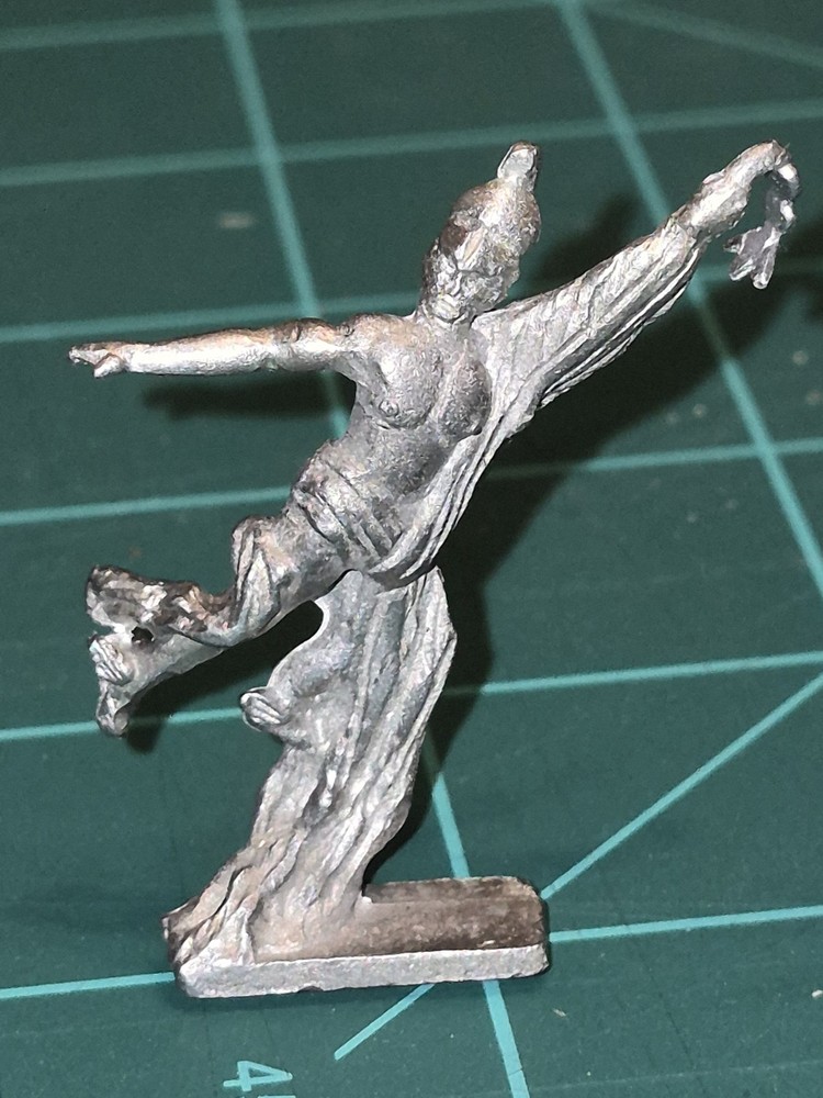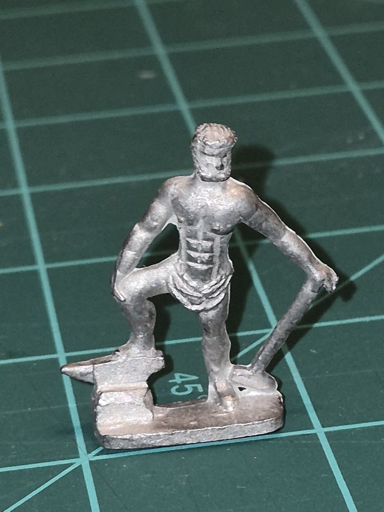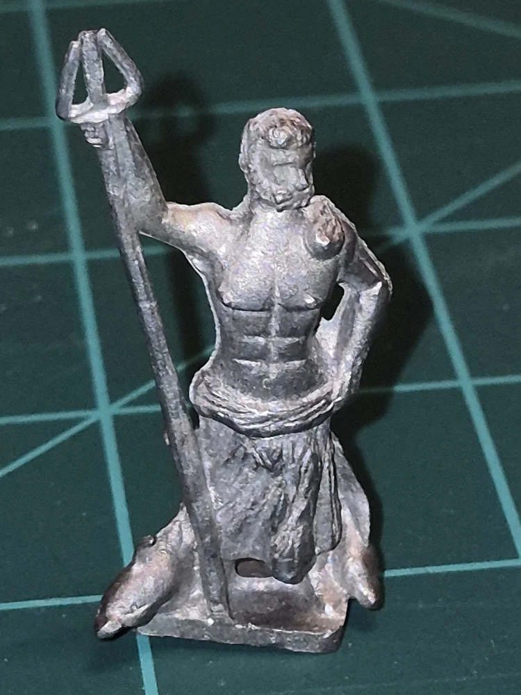 Up for auction is a rare set of three 1977 Minifigs (Miniature Figurines) from the classic CGG (Classic Greek Gods) range. These are authentic "Pre-Slotta" white metal miniatures, cast during the golden era of tabletop gaming. These figures are perfectly scaled for 25mm play and are ideal for collectors of Original D&D (OD&D), AD&D, or Arduin-style dungeon crawls. Unlike modern plastic or resin, these have the hefty, classic feel of 70s lead-alloy gaming. The Figures Included: CGG 5 – Poseidon: Features a striking trident and two dolphins at the base. (Excellent casting detail on the beard and muscles). CGG 4 – Hephaestus: The god of the forge, depicted with his signature anvil and hammer. CGG 7 – Iris/Messenger Goddess: A dynamic, "flying" pose that is notoriously difficult to find in such good condition. Condition Report: Unpainted: These are in their original "as-cast" state. No primer or old paint to strip. Legible Hallmarks: The underside of each base is clearly stamped with the © Minifigs 1977 copyright and the specific CGG catalog codes. Structural Integrity: All delicate parts (trident, limbs, wings) are intact. No signs of "lead rot" or oxidation. Base Style: Solid rectangular metal bases (not slotted). Collector’s Note: These are "True 25mm" scale, making them slightly more slender and grounded than modern "heroic" 32mm scales. They are a perfect match for any vintage TSR-era collection or for use in OSR (Old School Renaissance) gaming. Shipping: Will be packed with extreme care using bubble wrap and a sturdy box to ensure no bending or snapping of the metal during transit.