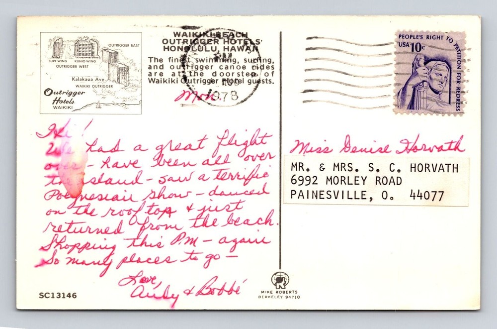 Vintage 1978 Waikiki Beach Outrigger Hotels Honolulu HI Postcard