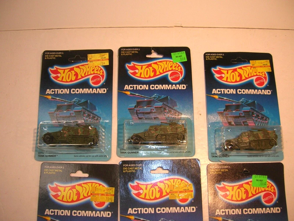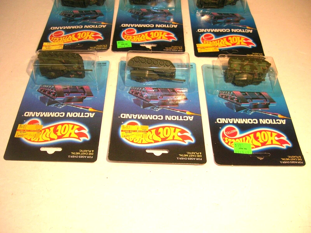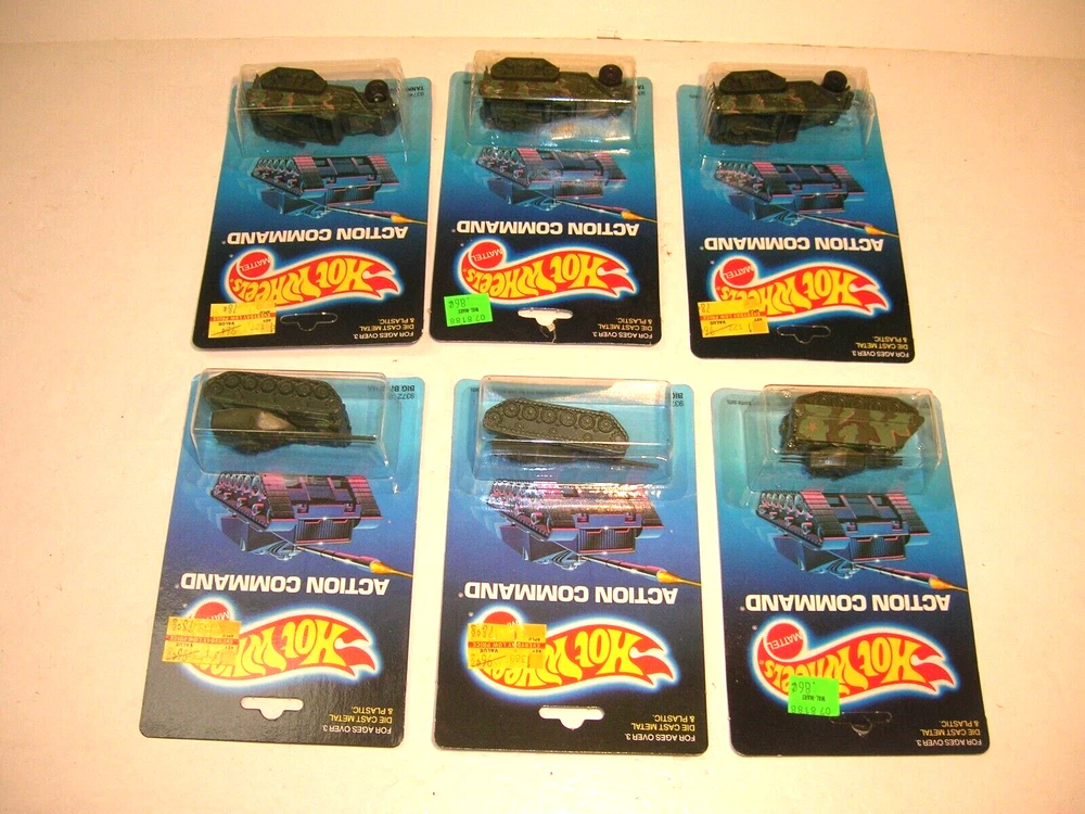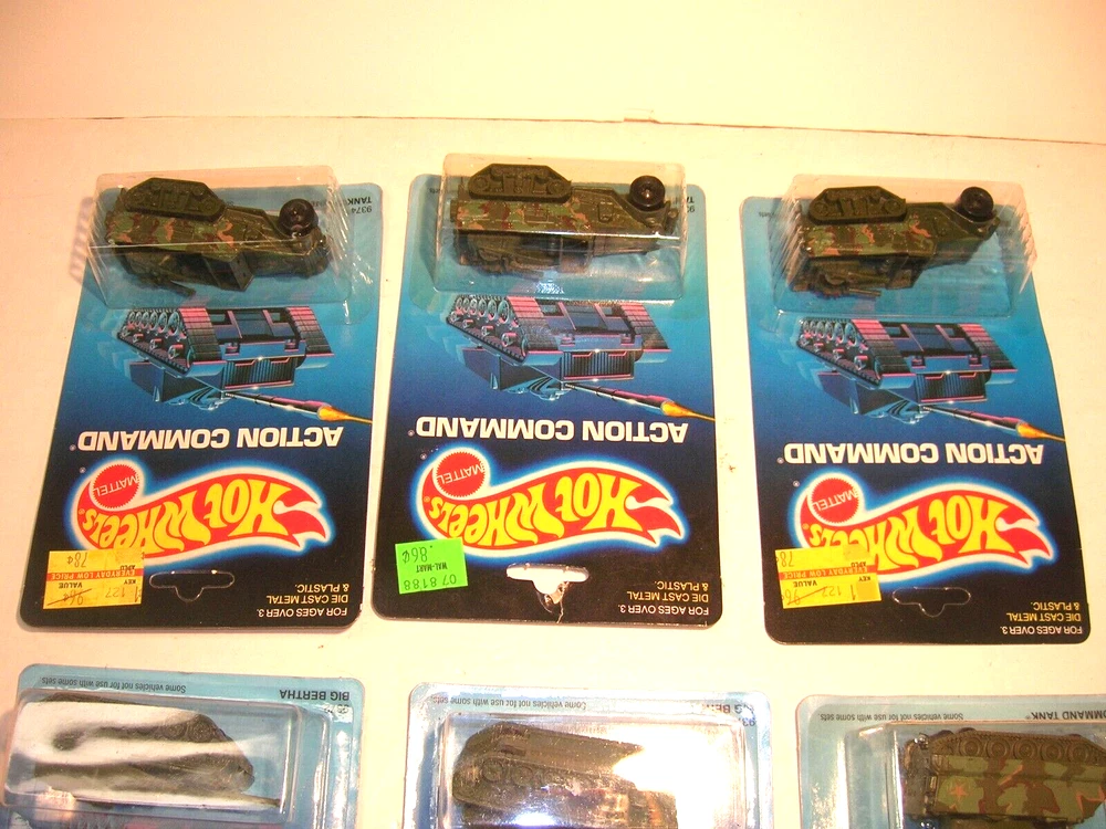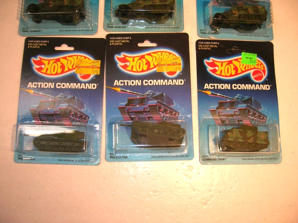 Up for sale is an estate sale find of a Vintage 1980s Hot Wheels Action Command New on Card Military Vehicles Tank Lot. .......Big Bertha x2.....Tank Gunner x3.....Command Tank........The lot is all being sold as found in as-is condition.......Thanks for Looking and Good Luck!!!!!!!!........ Please email me with any questions or concerns you may have. I am no expert on this therefore the item is being sold as-is with no reserve . *Payment is preferred within 7 days*