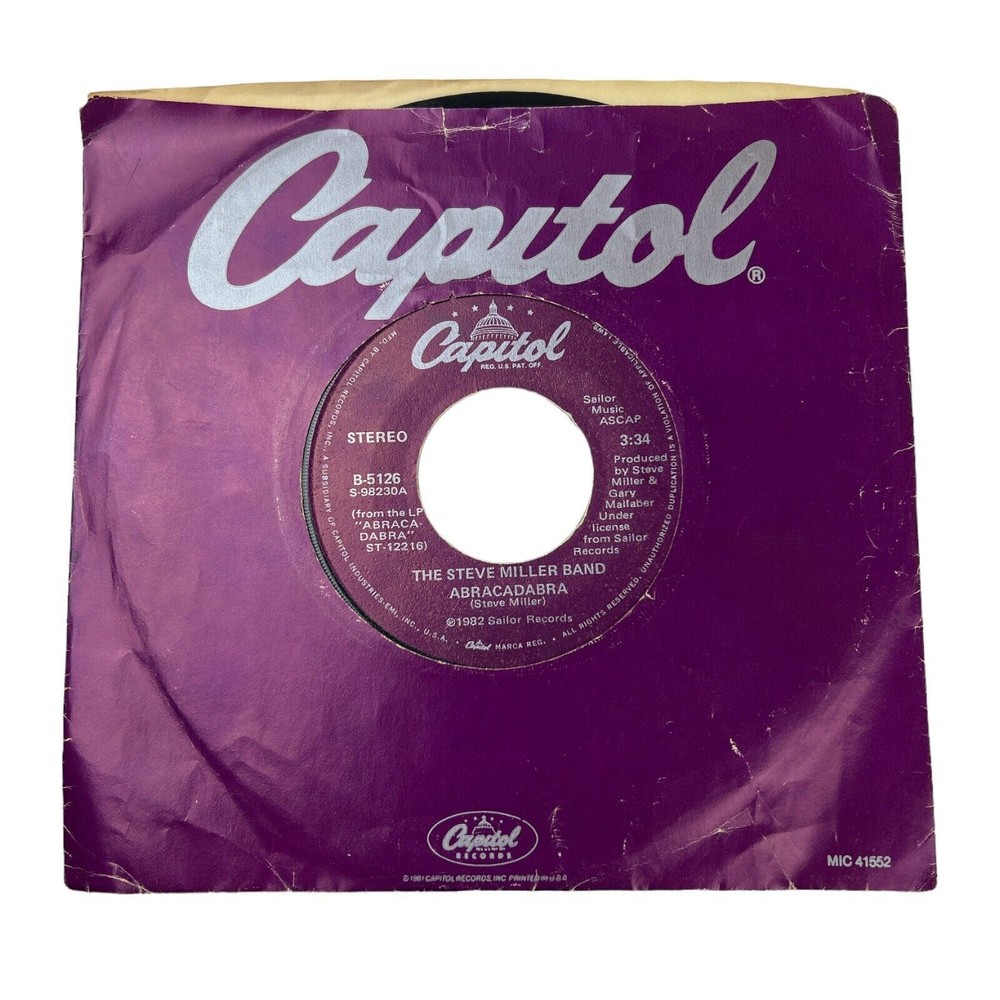 Vintage Abracadabra The Steve Miller Band 1982 Vinyl 45rpm Record Capital Eminem This vintage 1982 vinyl record features the iconic song "Abracadabra" by the Steve Miller Band, released under the label Capital. The 7" record with a speed of 45 RPM comes in a a Capital sleeve. The record grading is Good (G) and the sleeve grading is also Good (G), average vintage condition. The release year of the record is 1982. Before the Eminem sample there was this, own a piece of the 80s! Great vintage condition, a few light scratches on record. Capital Records sleeve shows average signs of wear for the age. Please see all photos. Smoke free environment.