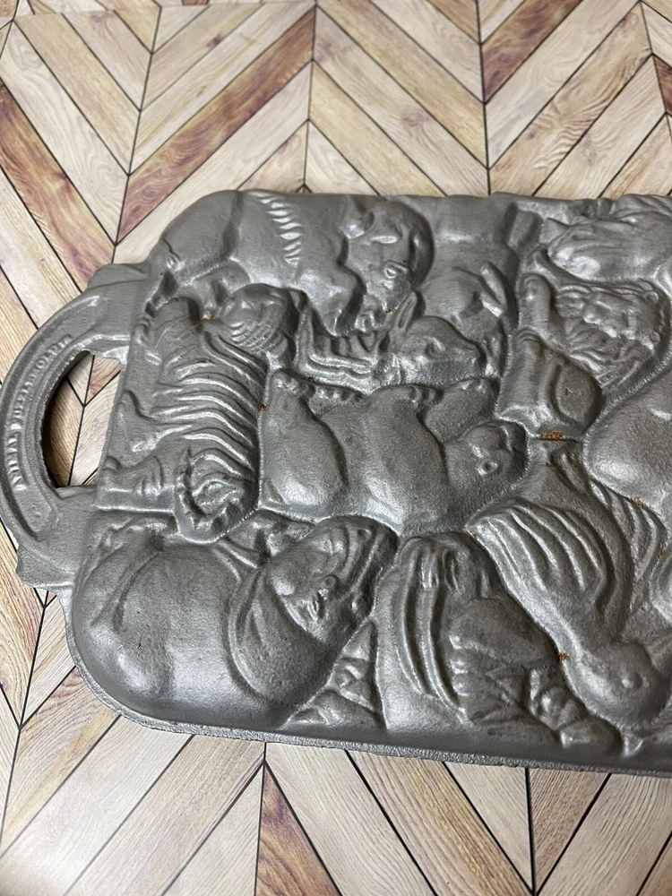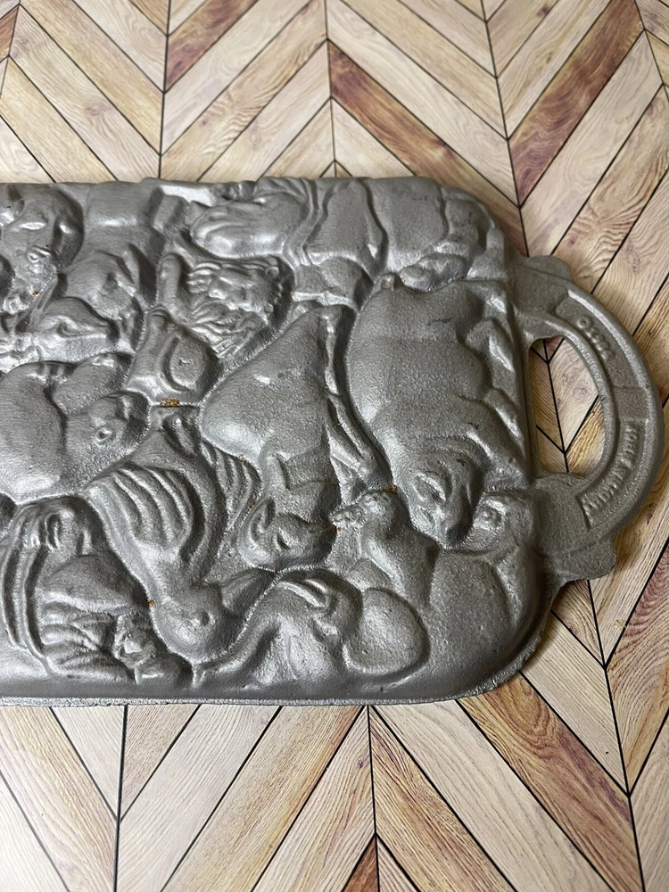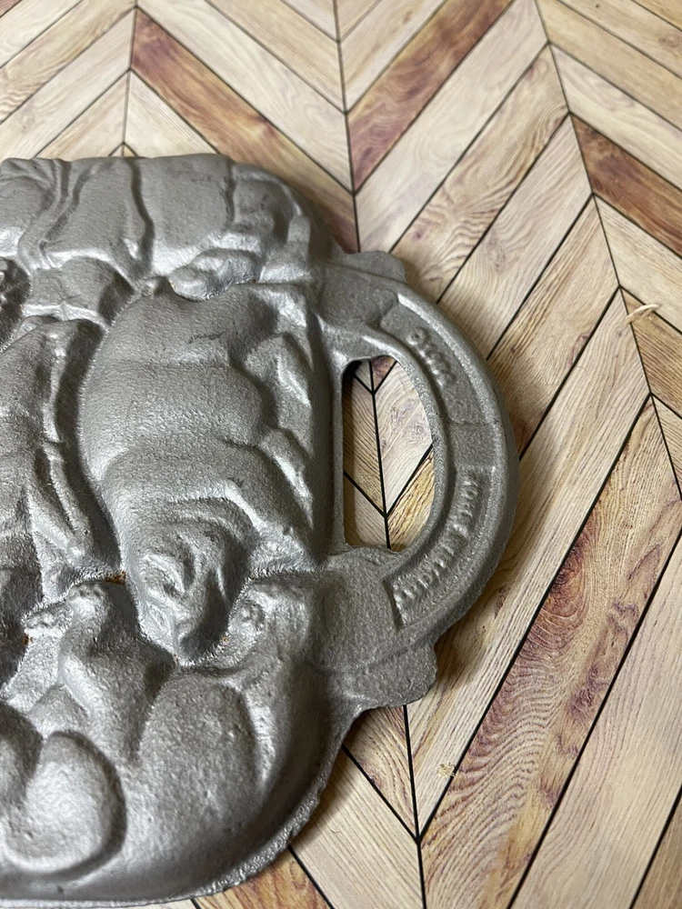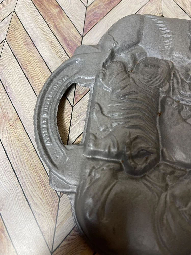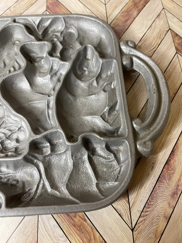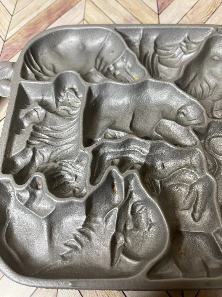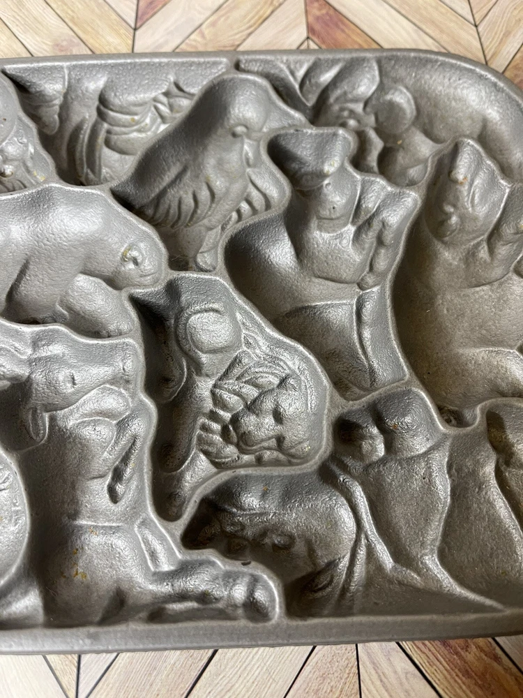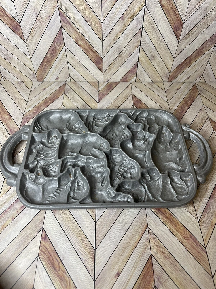 Vintage 1984 John Wright Creative Bakeware Cast Iron Animal Puzzle Baking Mold. This vintage shortbread pan is in great condition with a couple of minor rust spots.