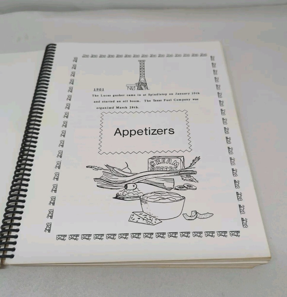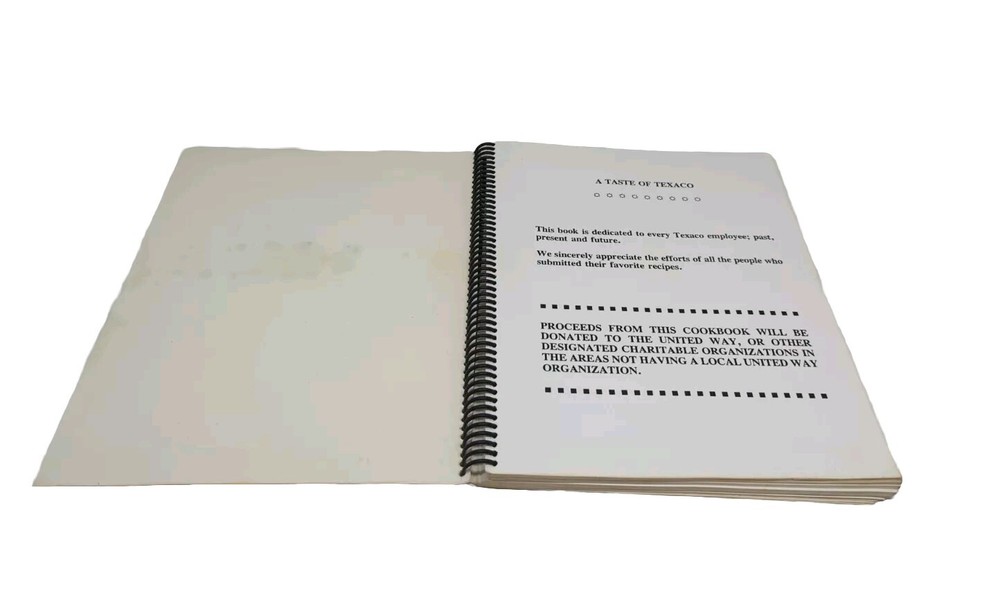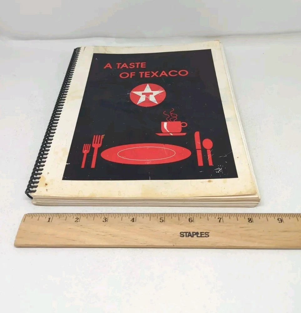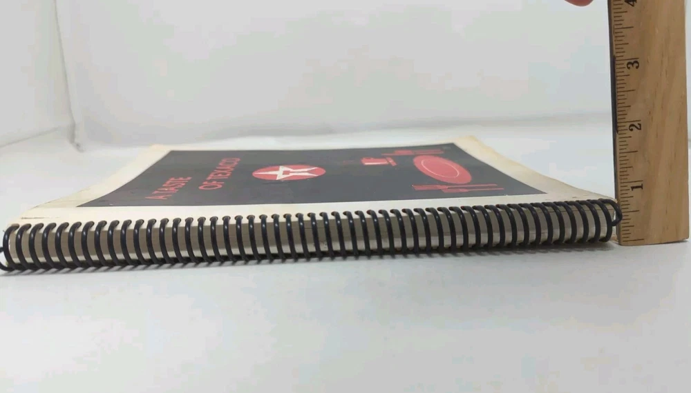 Vintage "A Taste of TEXACO" Cookbook Spiral Bound Recipes From Employees Each section divider has a date with a company milestone. The last divider is for an event in 1987 so I believe that this was published in 1987. Book is otherwise undated. Wear and staining to the cover. Inside is in good condition. A couple of pages near the front that have rippling on lower right corner from getting wet at some point (16-18). Please review all photos provided which includes some measurements.