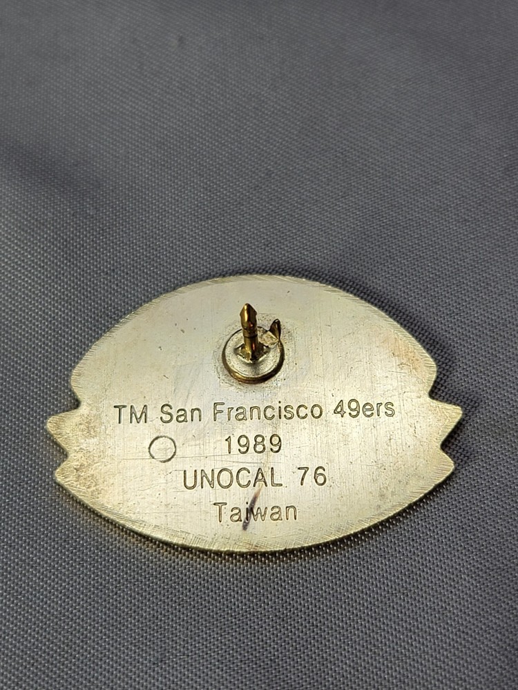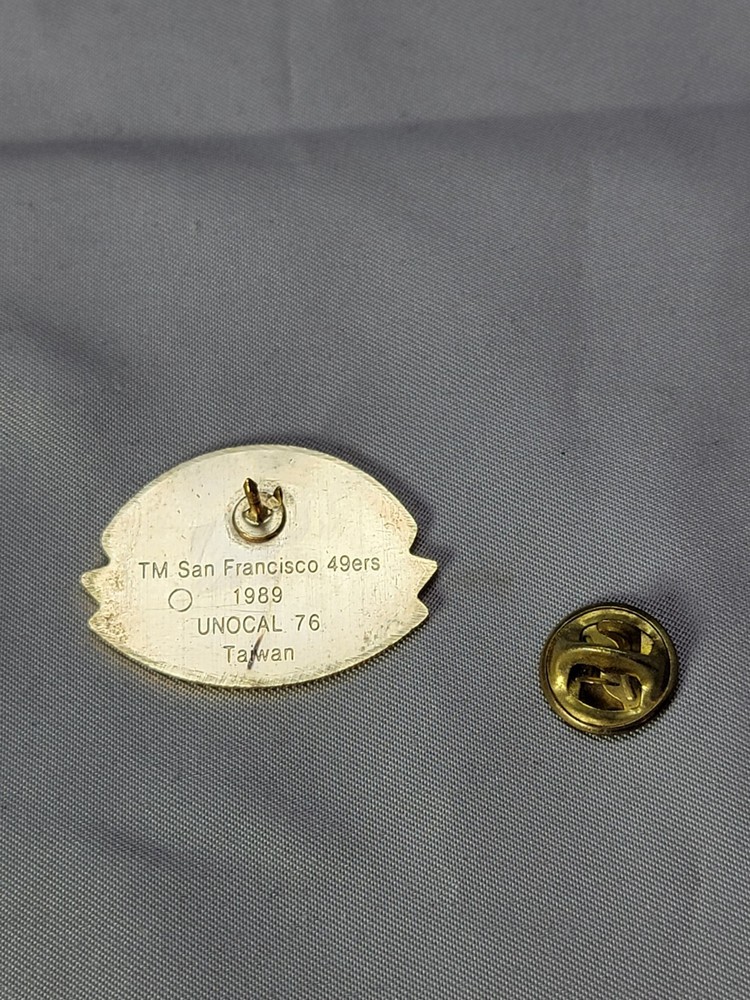 Show your love for the San Francisco 49ers with this vintage lapel pin from 1989. This officially licensed pin is a perfect addition to any fan's collection. Featuring the iconic team logo, this original pin is a great way to show your support for the 49ers during the height of their dominance in the NFL. Whether you're a die-hard fan or just a collector of vintage sports memorabilia, this lapel pin is a must-have. Add this piece to your collection today and wear your pride for the 49ers on your sleeve (or lapel). This pin is a great way to show your team spirit at games, tailgates, or even just around town. Get yours now and never forget the glory of the 80s-era 49ers.