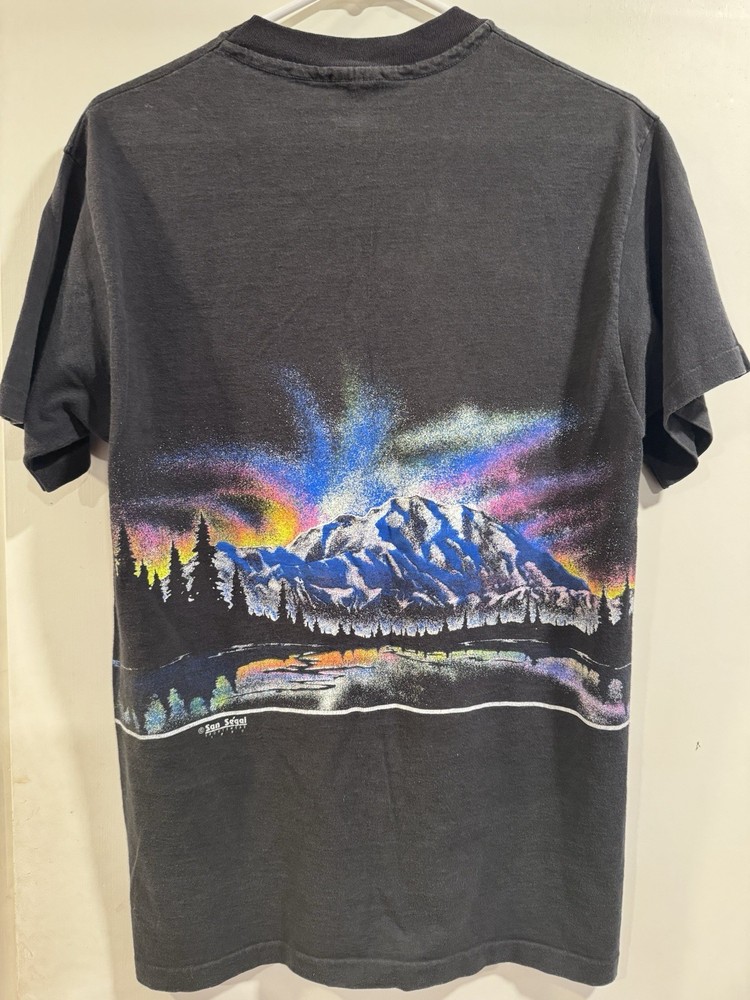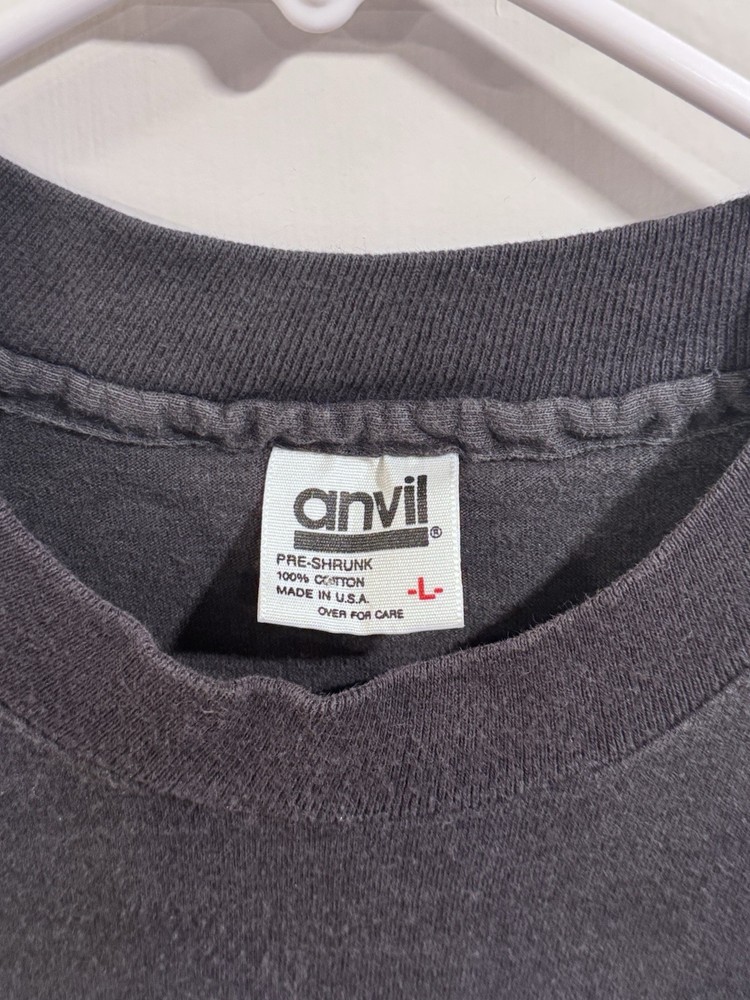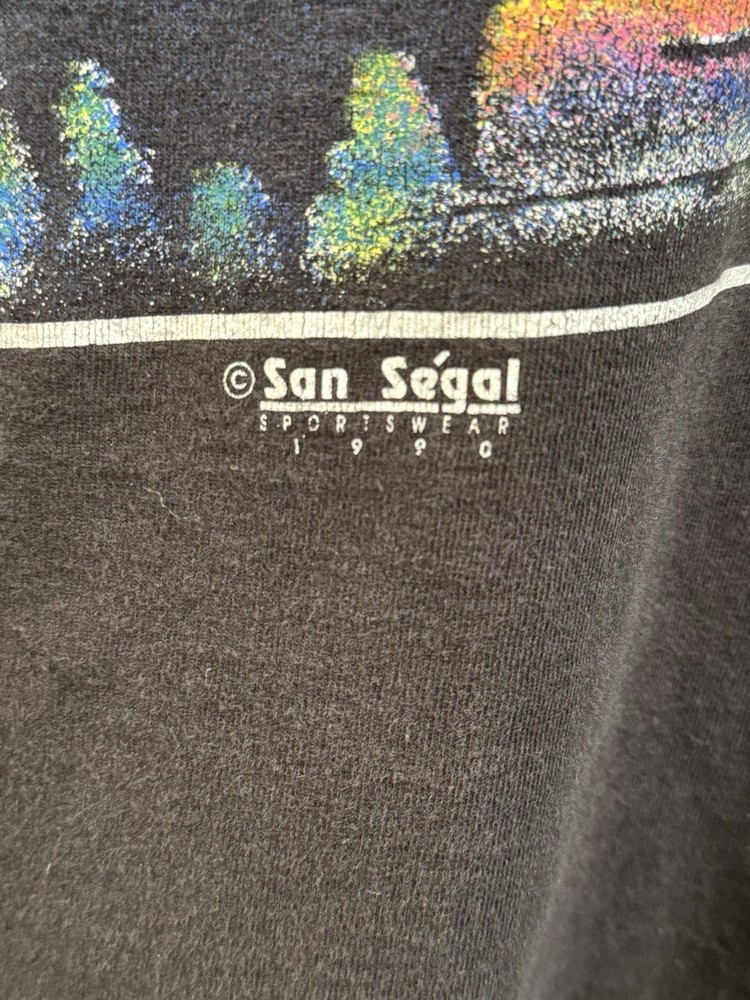 This vintage 1990 San Segal Reno Nevada graphic tee is a classic piece of men's clothing that exudes a sense of nostalgia and Americana. Made in the USA with a single stitch, this black cotton tee features a crew neck and short sleeves, making it perfect for the summer and spring seasons. The regular fit and size Large ensure a comfortable and flattering look, while the iconic graphic design adds a touch of retro charm. Machine washable and manufactured by Anvil, this t-shirt is a timeless addition to any wardrobe for those who appreciate vintage style. Size Large Single stitch Great condition!!