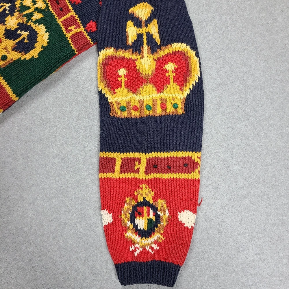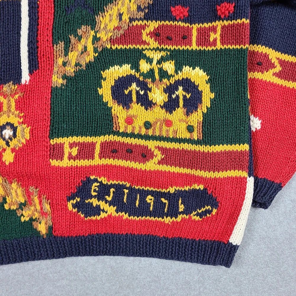 Small hole in front. Please see ALL pictures before purchasing. This vintage 1991 Eagles Eye Crown Royalty hand knit sweater cardigan is a must-have for any fashion-savvy woman. With its colorful, 90s-inspired design and heavyweight, shoulder-padded construction, this sweater is perfect for any occasion. The round neckline and collarless style add a touch of sophistication, while the button accents and knit fabric type give it a unique, vintage feel. Made from a blend of ramie and cotton materials, this sweater is easy to care for and should be hand washed only. It comes in a size M, with a regular fit and long sleeves. This sweater is perfect for anyone looking for a comfortable, stylish, and unique piece of clothing.