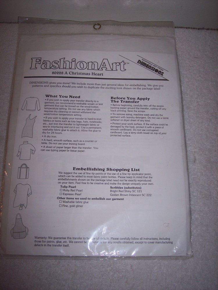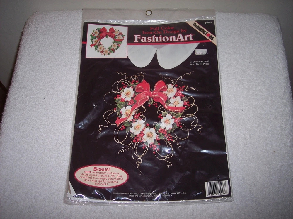 DIMENSIONS, ABBEY PRESS VINTAGE 1994 "A CHRISTMAS HEART". IRON ON TRANSFER. BRAND NEW IN PACKAGE. Style: Holiday Iron-On Transfer. Model # 80228 Bonus ( see picture # 4) 1994 Made in the USA. Please view all pictures, as they are part of the description. You will be receiving exactly what is pictured. Message me with any questions that you may have. Please take a moment to view my other items up for auction, and browse thru my Store. Shipping is always combined. NO INTERNATIONAL BUYERS PLEASE. US BUYERS ONLY. THANKS!! THANK YOU!!!! PLEASE TAKE A MOMENT TO VIEW MY OTHER ITEMS UP FOR AUCTION. ~~ PAYMENT~~ PAYMENT IS DUE WITHIN 3 DAYS OF AUCTION, UNLESS YOU CONTACT ME WITH OTHER PAYMENT ARRANGEMENTS. I ACCEPT PAYPAL, CREDIT CARDS THROUGH PAYPAL ONLY. ~~SHIPMENT~~ ALL ITEMS WILL BE SHIPPED WITHIN 24/48 HOURS OF CONFIRMED PAYMENT. I DO COMBINE SHIPPING, SO IF YOU ARE BIDDING ON MORE THAN ONE ITEM, PLEASE LET ME KNOW,AS I WILL HOLD OFF ON INVOICING UNTIL AUCTIONS ARE COMPLETED, WITHIN A REASONABLE PERIOD (7 DAYS). ~~DELIVERY CONFIRMATION IS INCLUDED FOR ALL US BUYERS ONLY. PLEASE CHECK YOU EMAIL FOR TRACKING # AND SHIPMENT INFORMATION. QUESTIONS, CONCERNS--PLEASE FEEL FREE TO MESSAGE ME VIA THE EBAY MESSAGE SYSTEM. THANK YOU!! ~~PLEASE FEEL FREE TO EMAIL WITH ANY QUESTIONS OR CONCERNS THAT YOU HAVE....I CHECK MY MESSAGES SEVERAL TIMES A DAY, SO I WILL GET BACK TO YOU AS SOON AS I CAN. COMMUNICATION IS THE KEY TO A SUCCESSFUL TRANSACTION. THANK YOU....AND HAPPY BIDDING!!!!!!!!!!!!!
