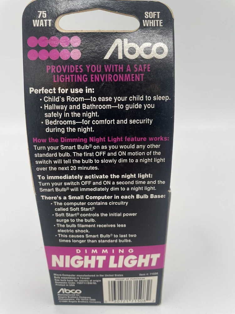 Vintage Abco 75 Watt 1994 Dimming Night Light Lightbulb. This is new and still in the box
