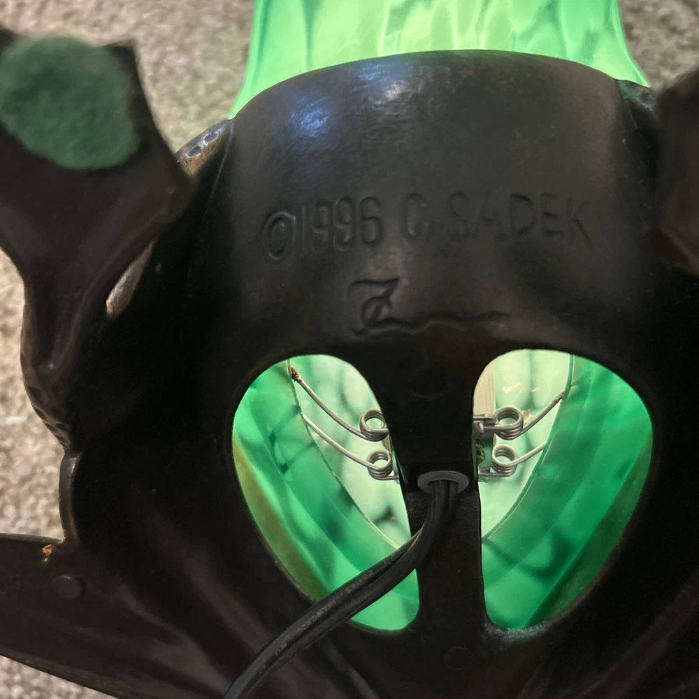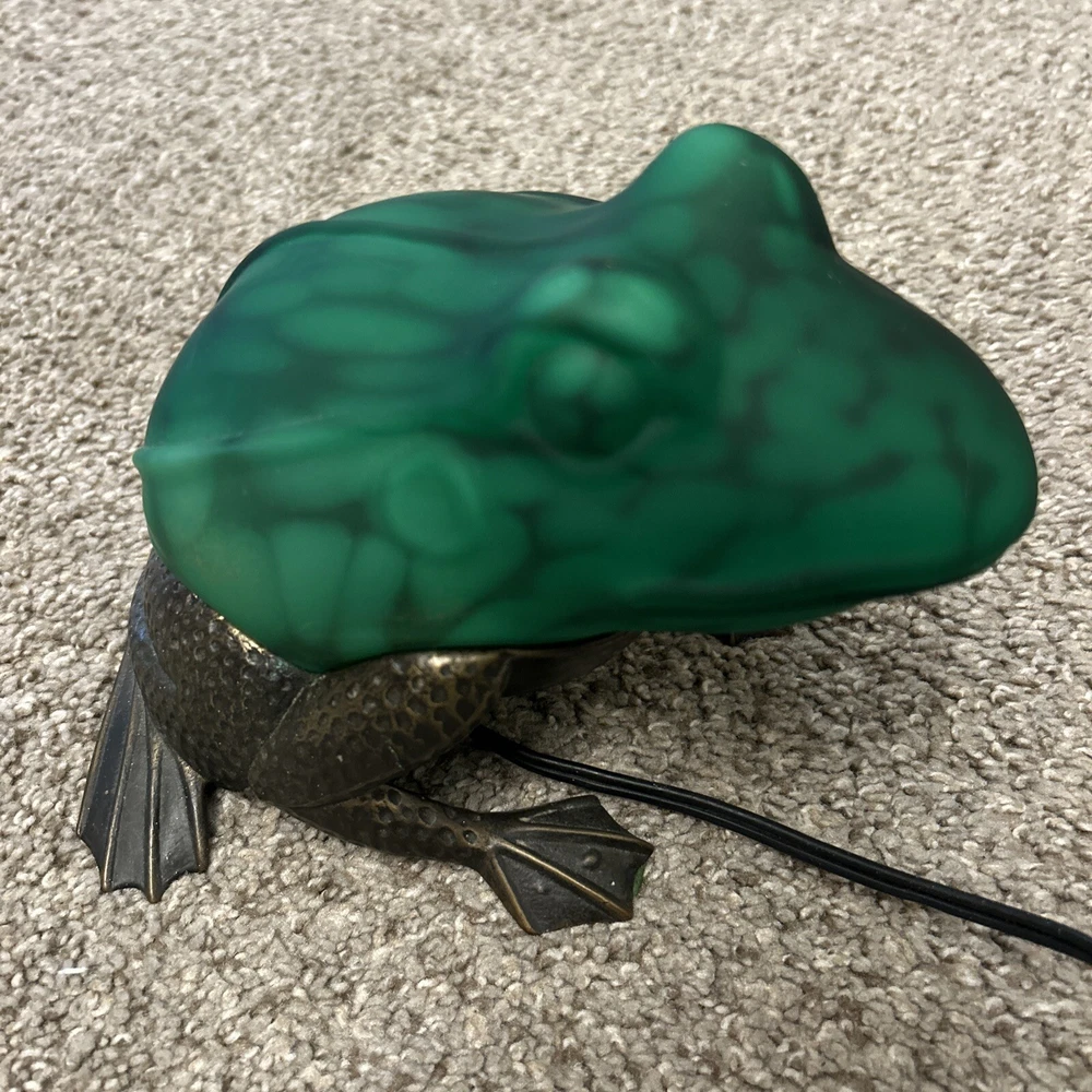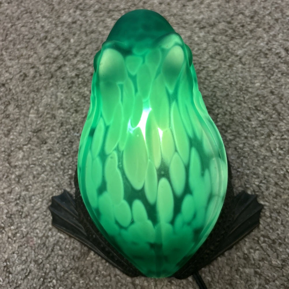Illuminate your space with a touch of whimsy using the Vintage 1996 C. Sadek Green Glass and Brass Electric Lamp. Perfect as a nightlight or a quirky desk lamp, this charming piece features a novelty design that's sure to spark conversations. Crafted from a combination of glass and solid brass, it exudes an Art Deco style that effortlessly blends with both contemporary and traditional décor. The lamp comes in a rich green hue, complemented by a coordinating black cord, and is ready to be a functional vintage accent in your home. Designed for everyday use, it offers a warm glow with a simple switch control. Ideal for all age groups, this original 1990s creation by Andrea by Sadek is a delightful nod to the past, ready to brighten your nights or add a nostalgic touch to your living space.