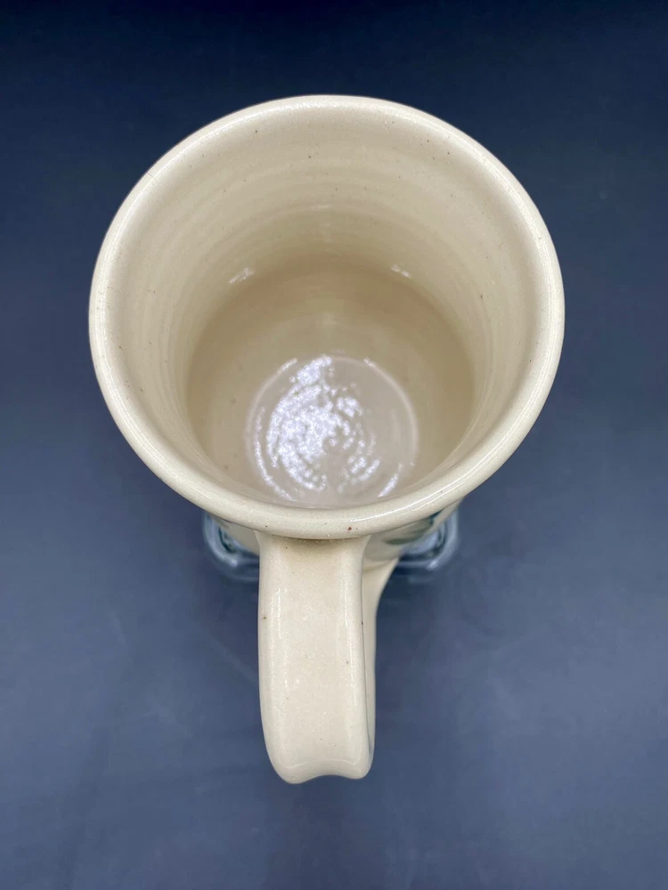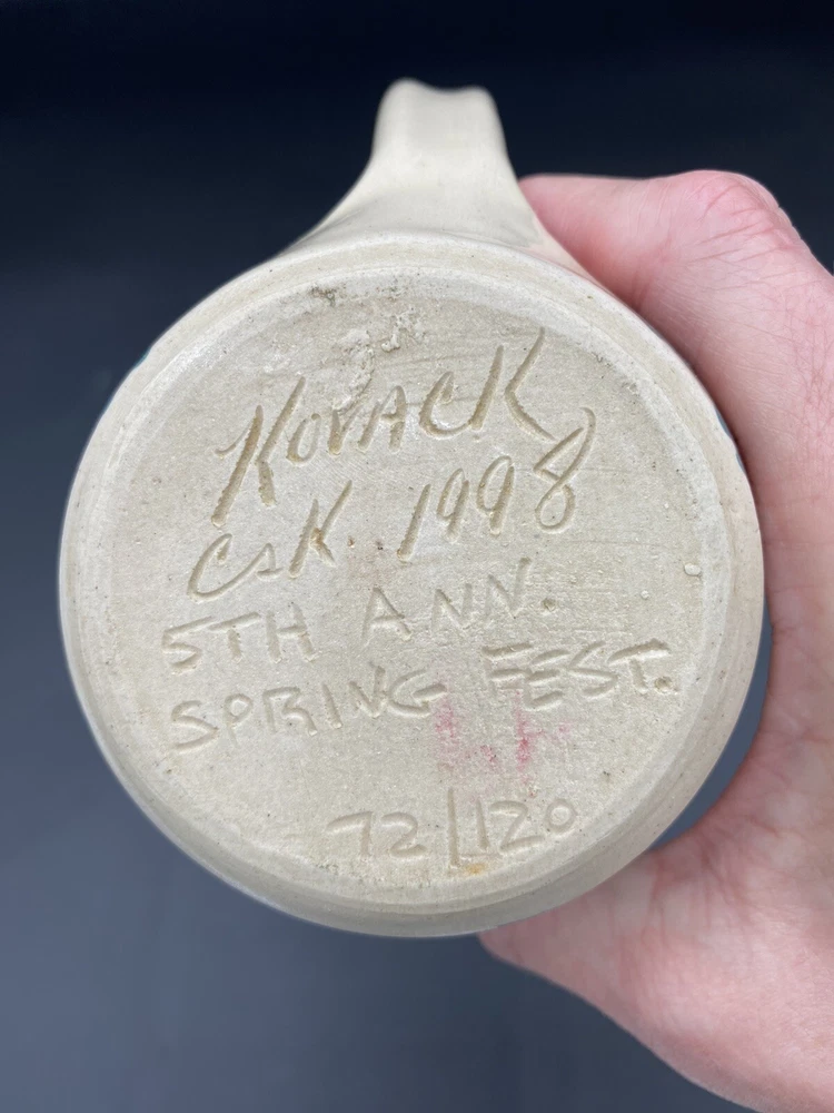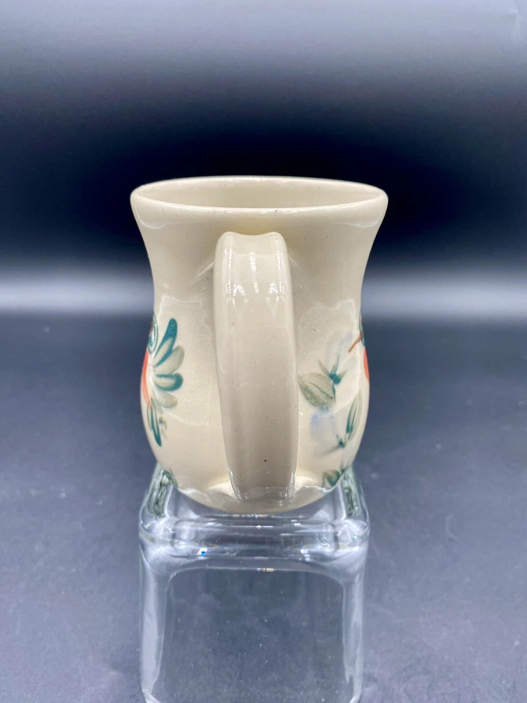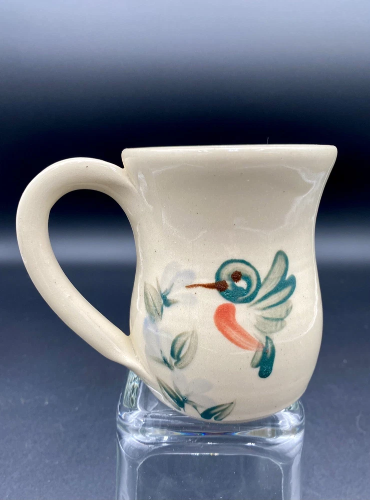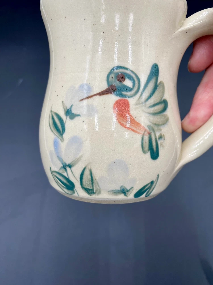 This beautiful vintage mug from Kovack Pottery features a hand-painted Hummingbird and Flowers design on either side of the mug. The delicate blue blossoms are contrasted with the green, deep teal and orange of the hummingbird and leaves. The mug is made of glossy stoneware and has a good-sized sculpted handle. It weighs 12 ounces and measures 4 inches in height and 3.25 inches in diameter. With the handle, the mug measures 5 inches across. This unique piece of art pottery was signed by Kovack CSK in 1998 and has an incised backstamp indicating that it was made for the 5th Annual Spring Festival and was number 72 out of 120. It is an original and handmade item that can be used for all occasions. The mug is in excellent condition. There are no chips, cracks or signs of wear.