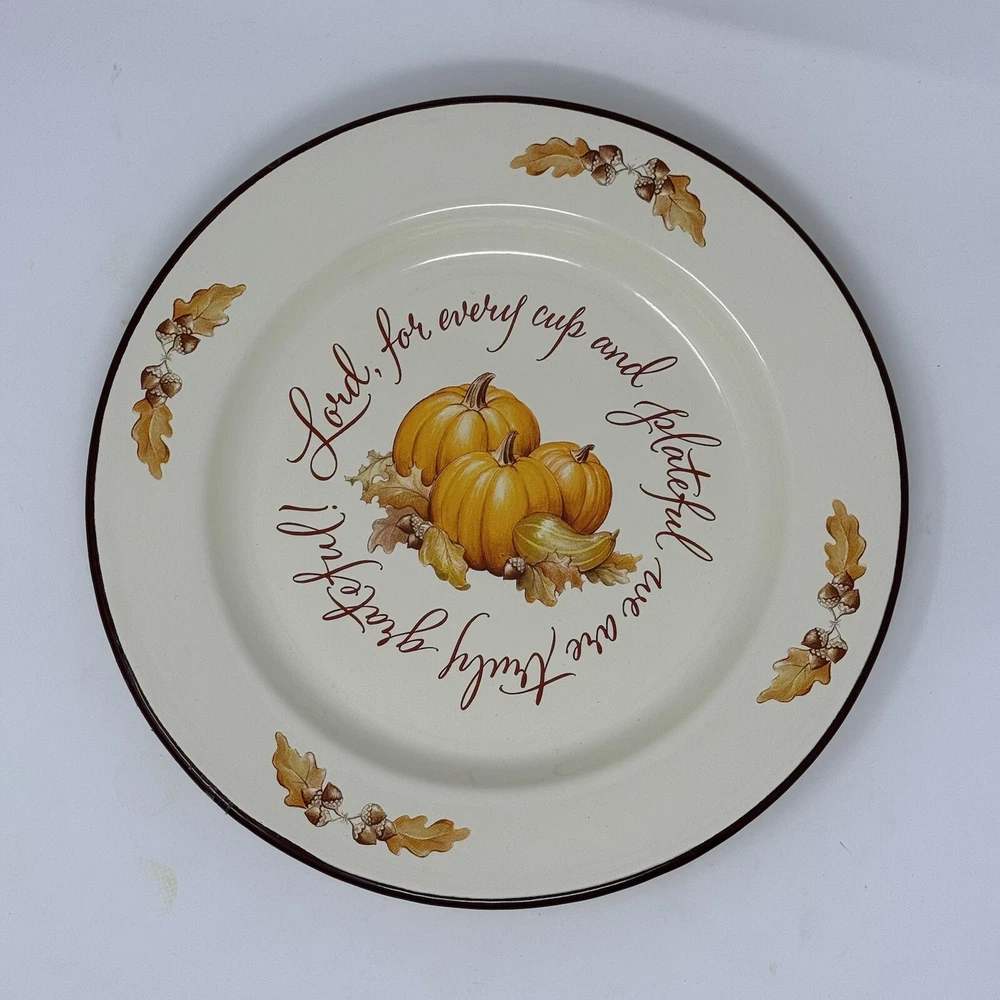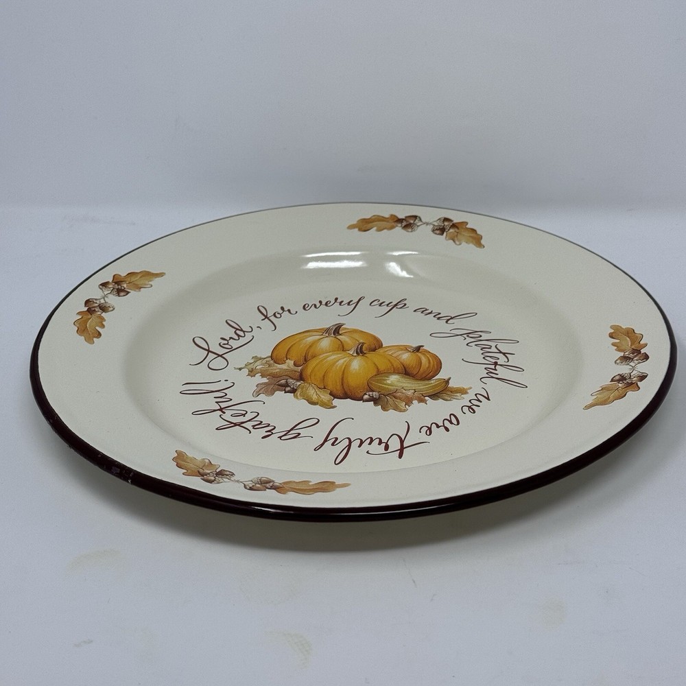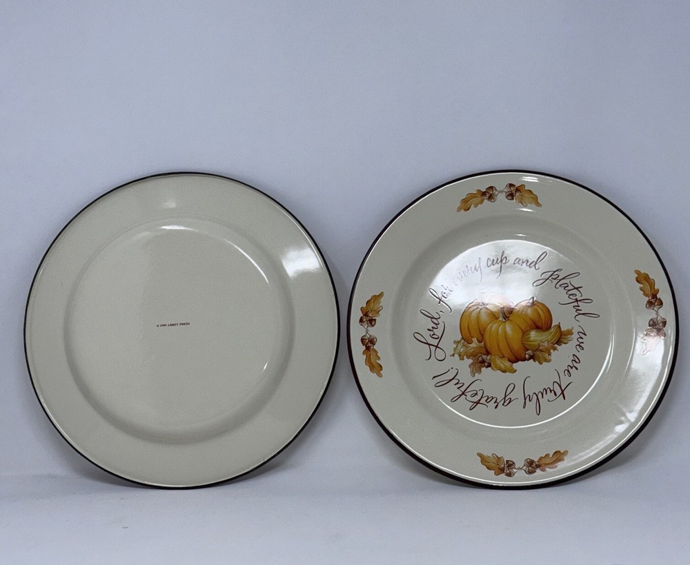 Two vintage tin plates by Abbey Press made in 1999 Great for display or Thanksgiving dinner service “Lord, for every cup and plateful we are truly grateful “ Fantastic condition