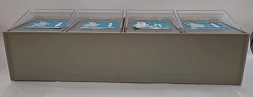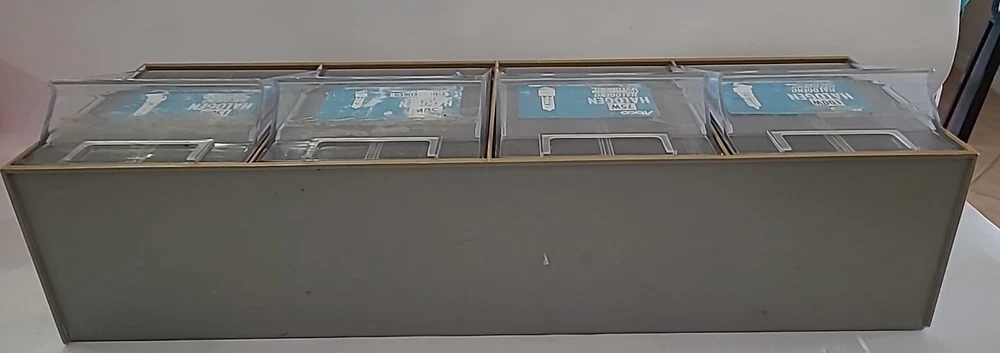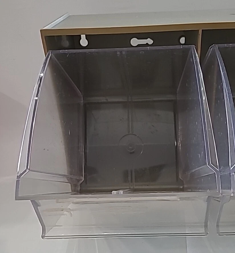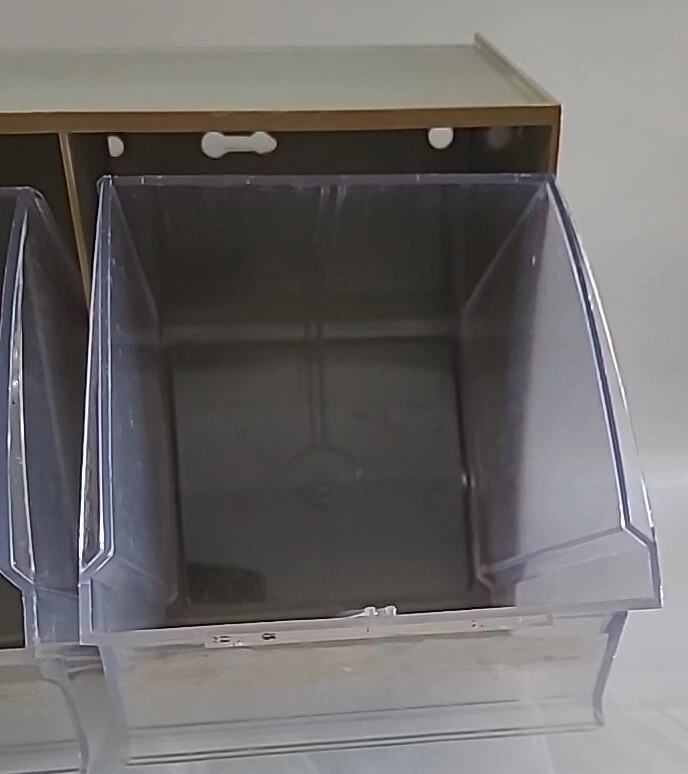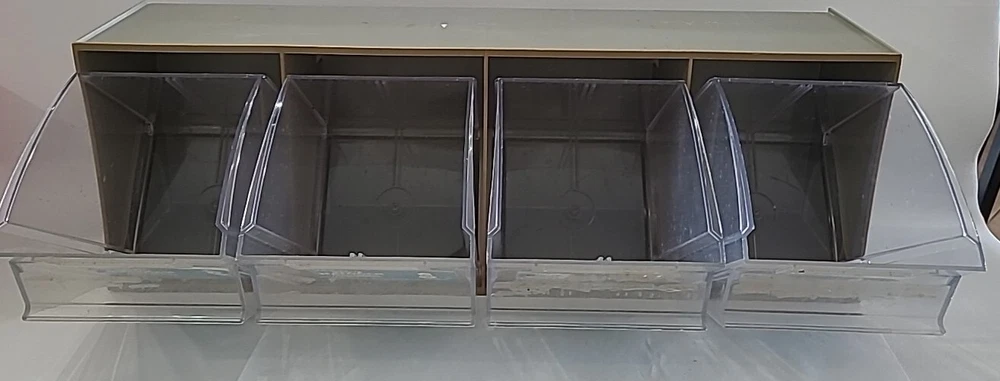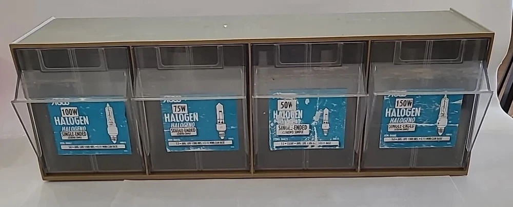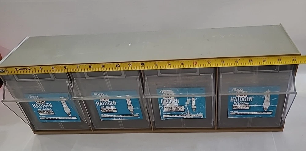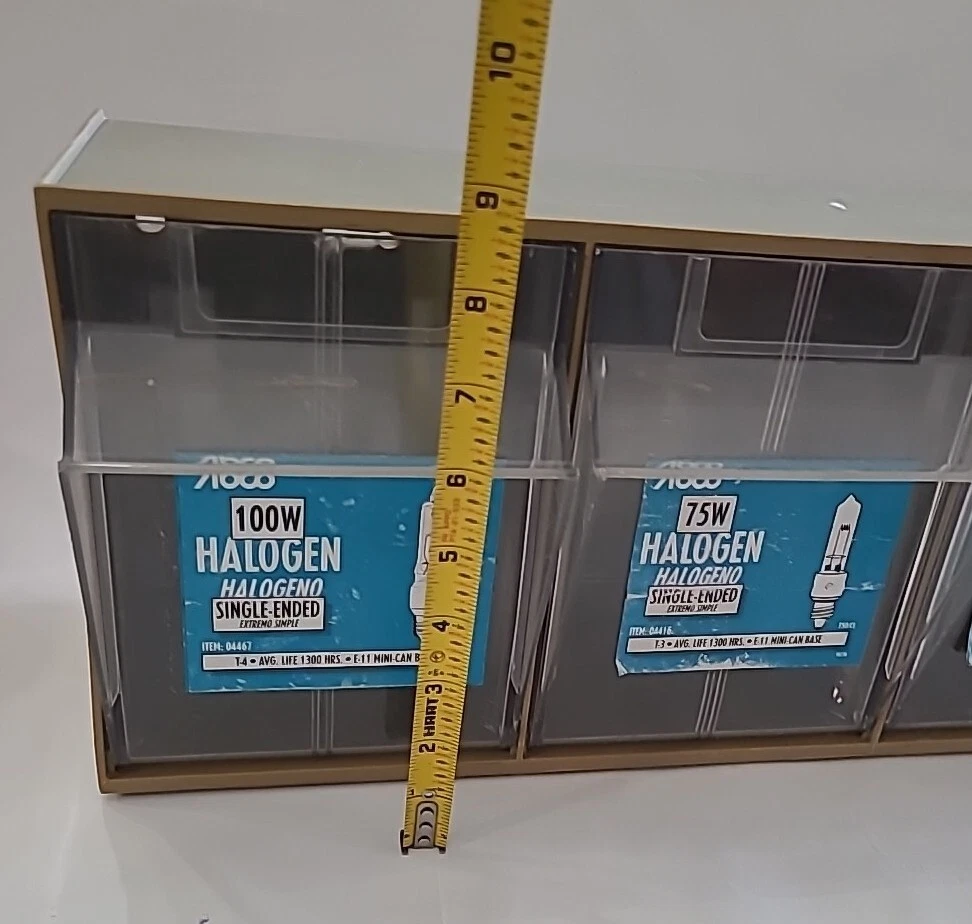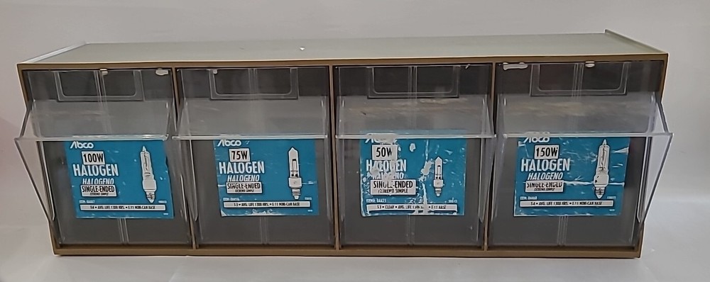 This vintage parts organizer bin features four pull-down drawers. Made by Abco, it's perfect for collectors and DIY enthusiasts alike. The bin is ideal for storing and organizing small parts and tools, making it a must-have for any workshop or garage. Add it to your collection today! Up for sale is a Vintage Part Organizer Bin!!! Item is in Vintage Preowned Condition...has scuff marks, scratches, stains, discoloring, small cracks, sticker damage. Item is dirty and could use a cleaning. Parts Organizer Bin 4 Pull Down Drawers Plastic Old Has no year on it Measures about 23.5" long Measures about 8" tall Drawers have stickers on them Says: Abco Halogen Back of bins are stamped: Tiltbin Please expect normal wear and tear due to age of item...not 100% perfect!! Please look at all photos for the condition of the item and what you see in the photos is what you get...Happy Shopping!! Thanks for looking