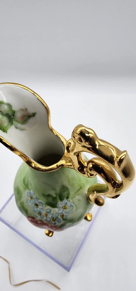 This small Floral and gold pitcher is in great condition. There are no chips or cracks that can be seen. It is 5 inches tall and 2 inches wide. It is all hand painted.