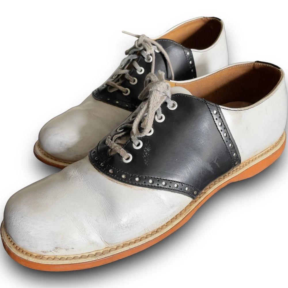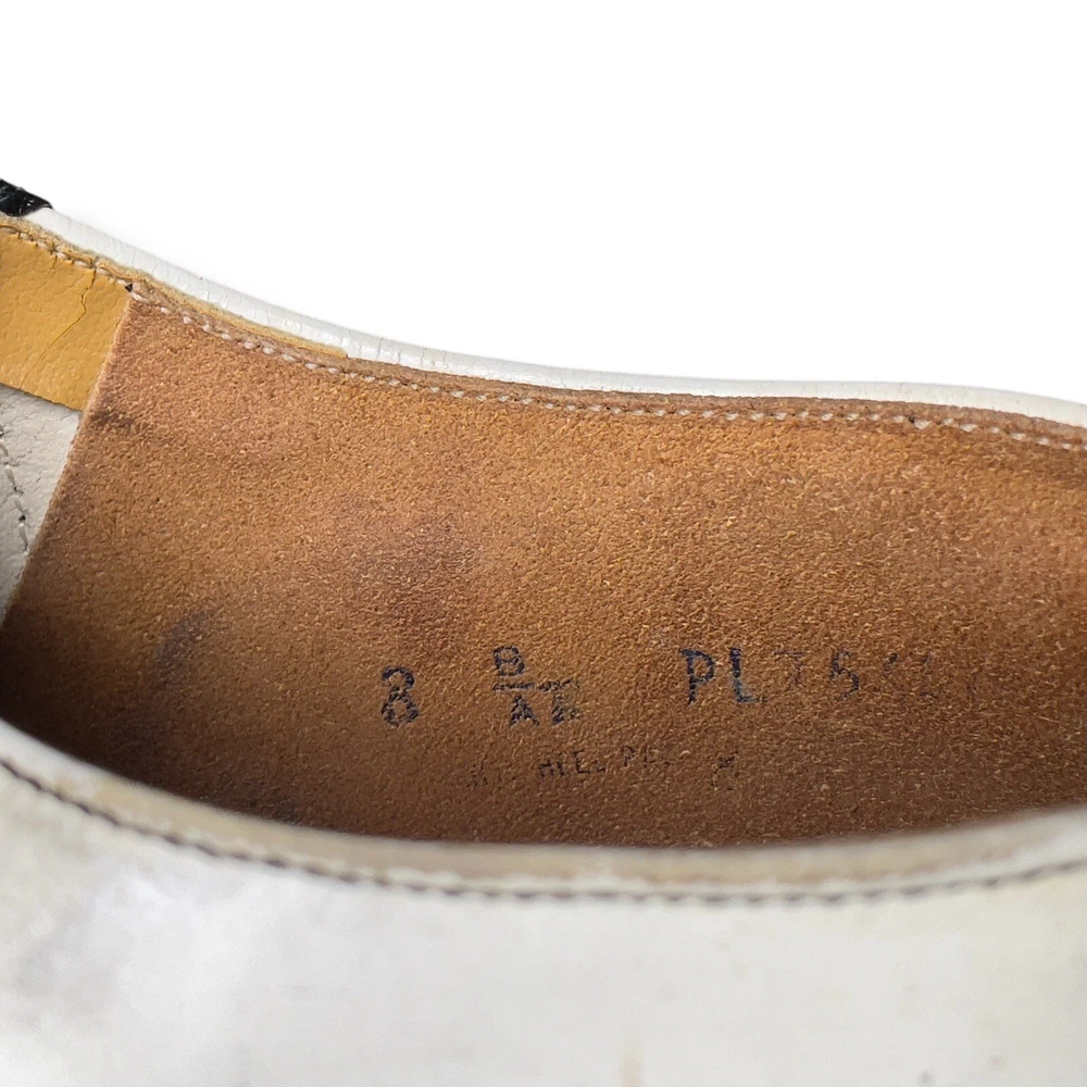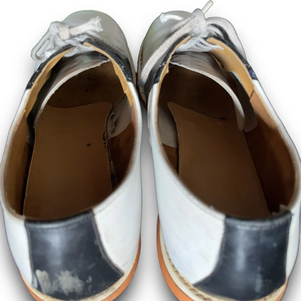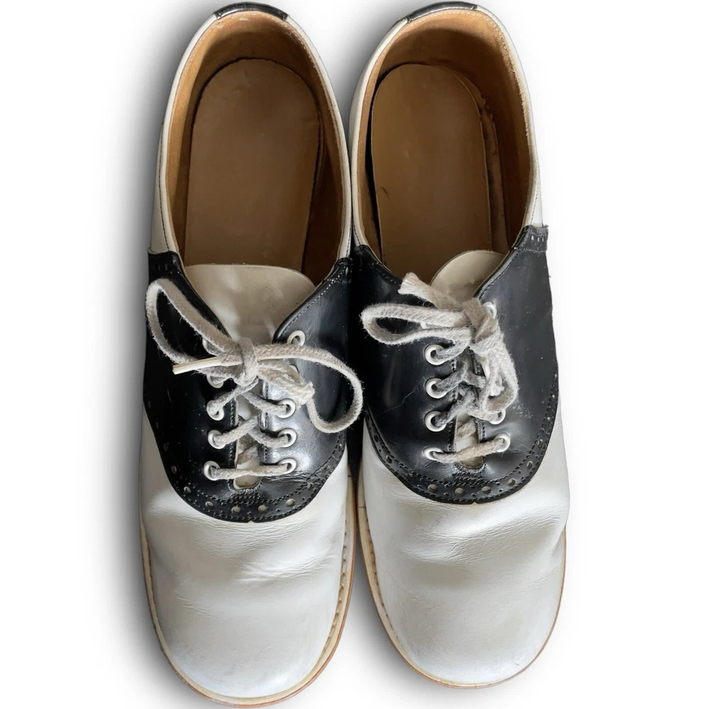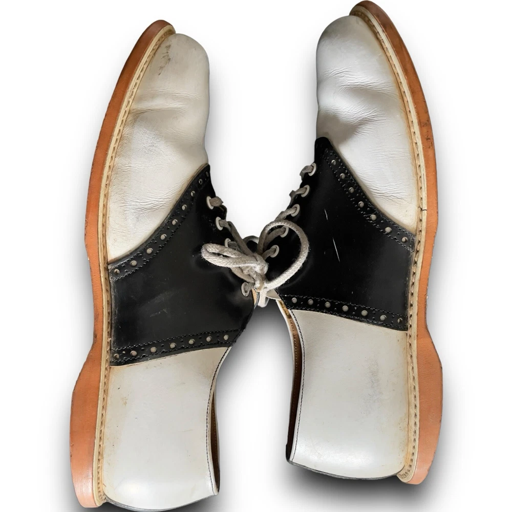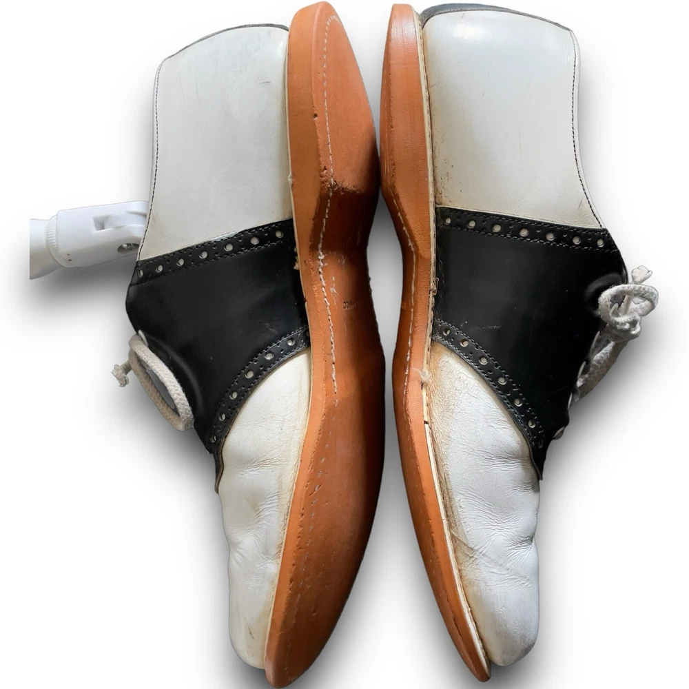 Vintage 50s 60s Barefoot genuine saddle Oxford shoes black white split leather lining, fiber insole lace up closure on round toe shoes. The shoes have light scuffs and scratches (please review photos) although in great shape for their age. The insoles will need to be replaced. Listed size women’s 8 although please refer to the measurements below for sizing: Length 10.5” Width toe box 3.5” Width heel 3”
