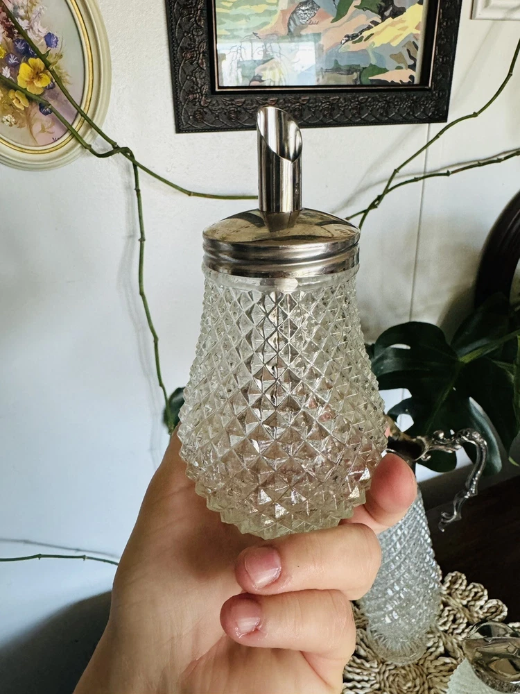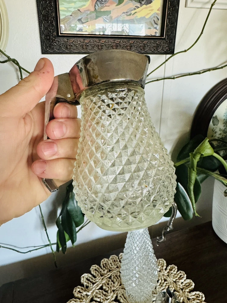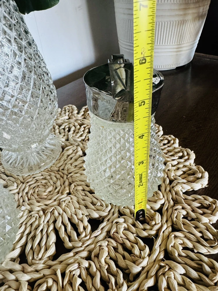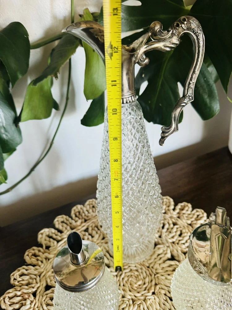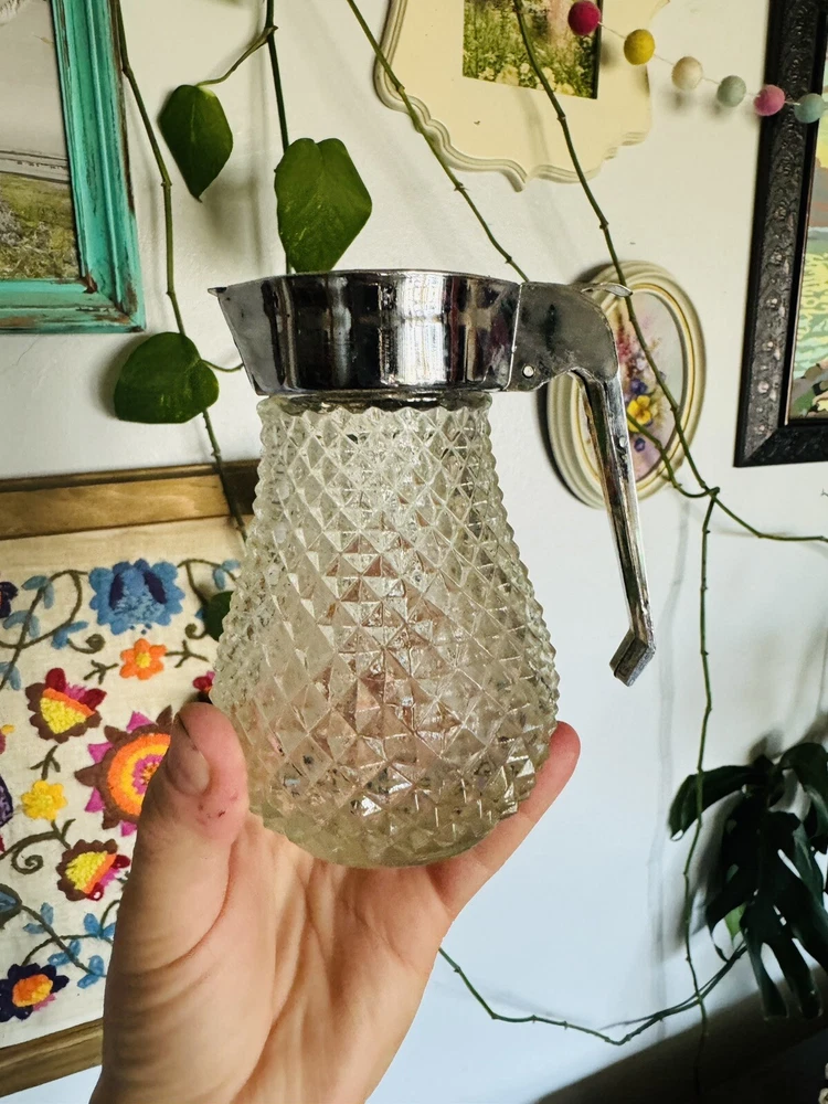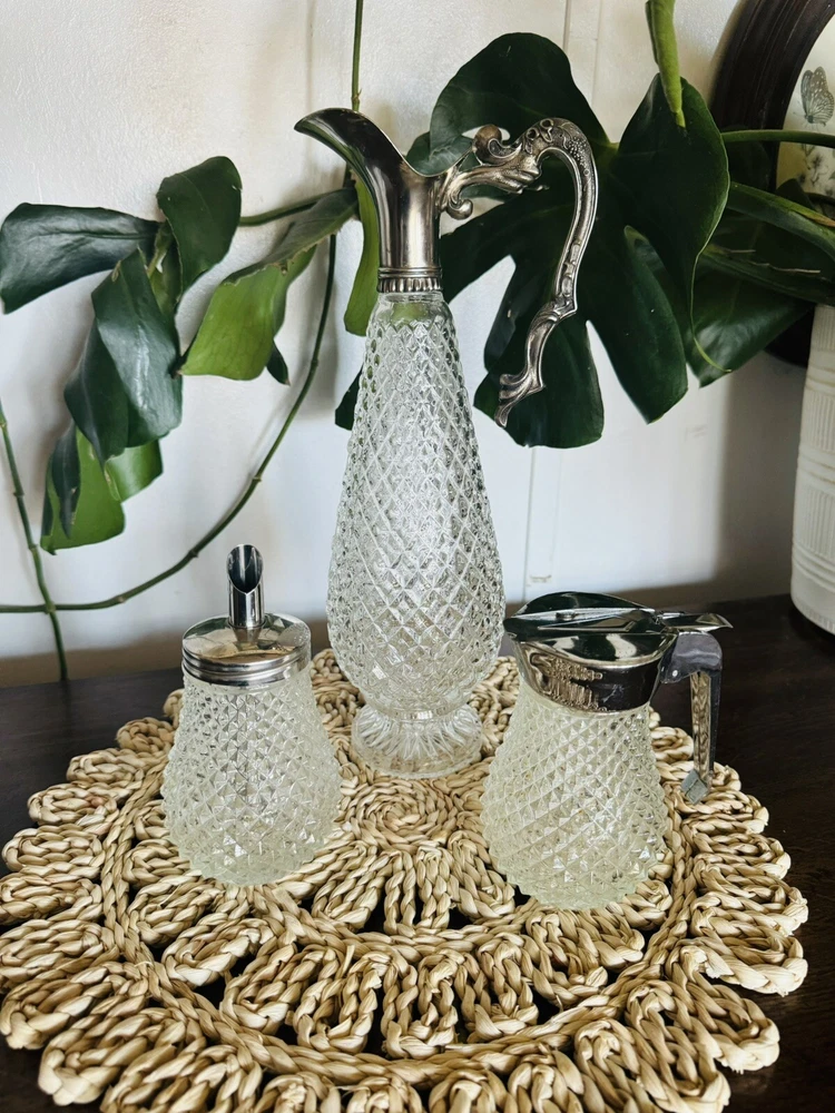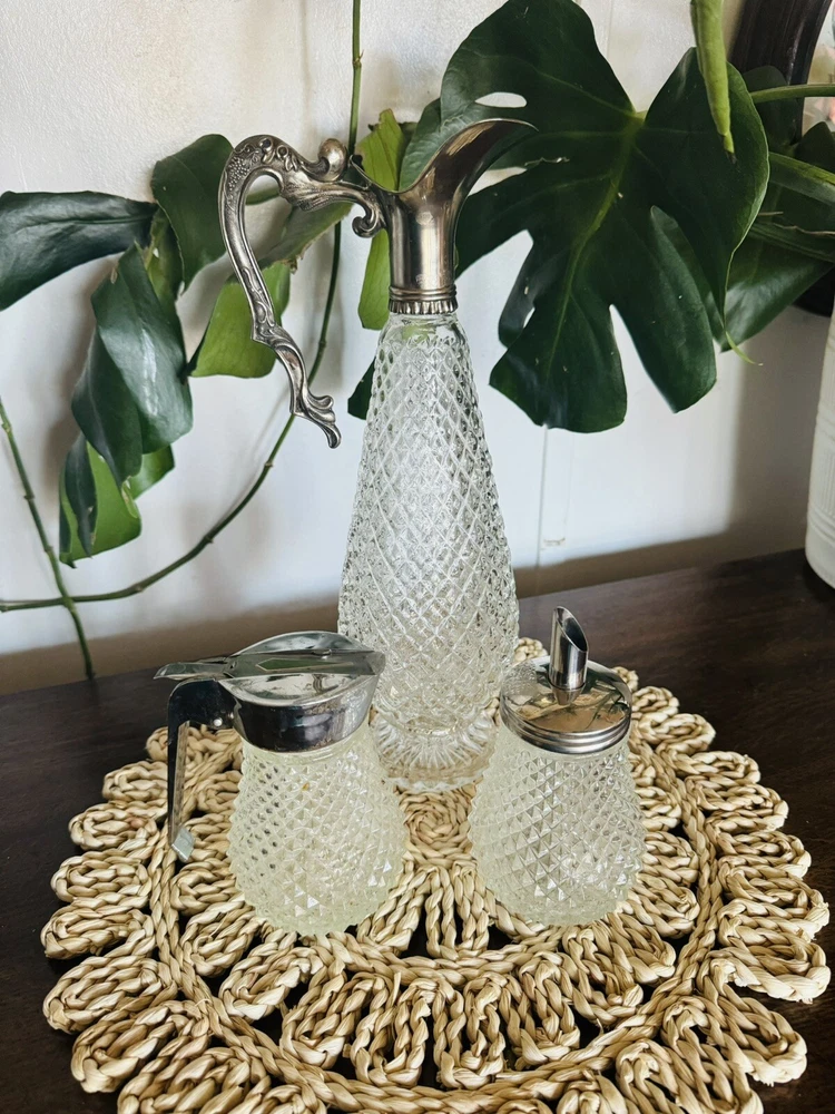 Beautiful 1960’s wine decanter without stopper/ syrup dispenser and sugar pour/ all in great condition just vintage wear/ see photos for condition and measurements/beautiful collection all together for your kitchen and home/