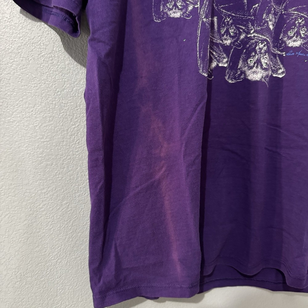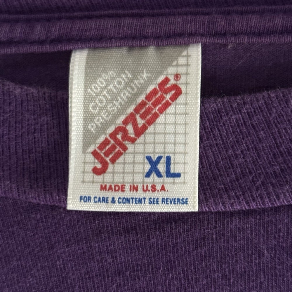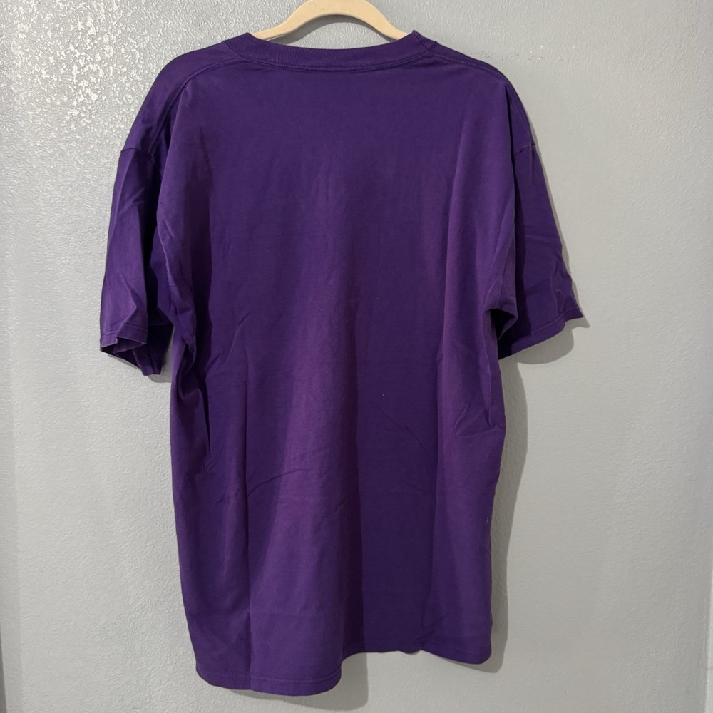 The Vintage 90s Just Hanging Around Bat Tee in size XL is a graphic print short sleeve t-shirt featuring a crew neck neckline. Made of cotton and machine washable, this purple shirt from the year 1990-1999 has a regular fit and is part of the 90s theme. Perfect for summer, fall, and spring seasons, this JERZEES brand tee is a throwback to the iconic style of the 90s era. - good condition, has some fading - more pictures / measurements available upon request