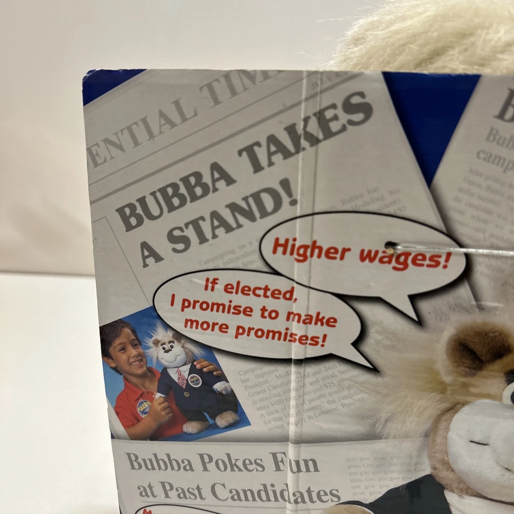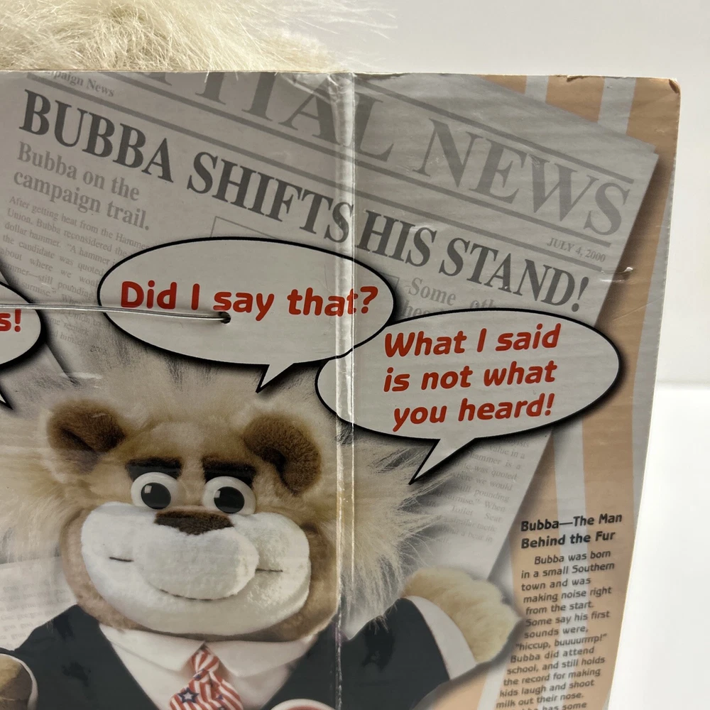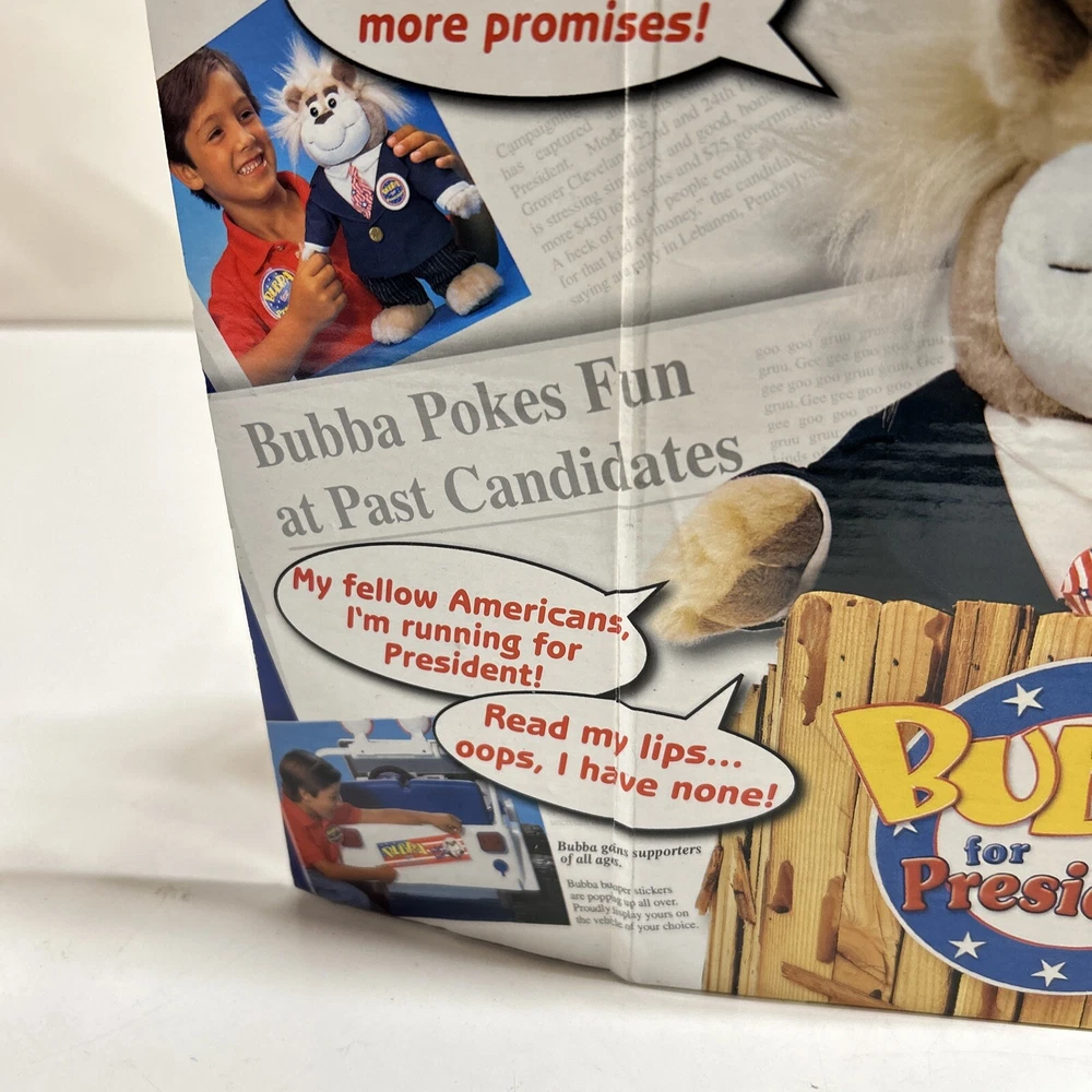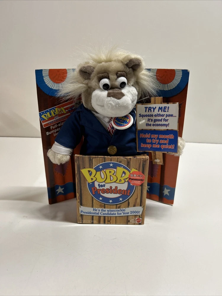 This vintage 90s Mattel Bubba for President Wisecracking Talking Plush Bear from 1999 is a must-have for any toy collector or fan of electronic, battery, and wind-up toys. This adorable plush bear is made by Mattel and has a recommended age range of 3+. It is perfect for children aged 3-4 years, 4-7 years, 8-11 years, 12-16 years, and 17 years & up. The Bubba plush bear is made in China and is part of the Character Family of BUBBA. It is a great addition to any toy collection and is sure to bring joy to anyone who played with it as a child. Its unique features include its brand, year, theme, and age level. It is a perfect gift for anyone who loves animals and vintage toys.