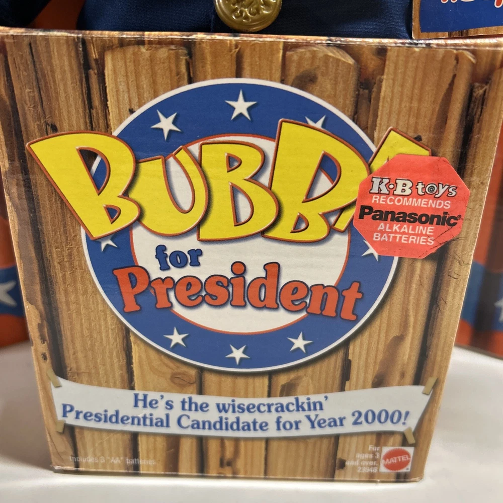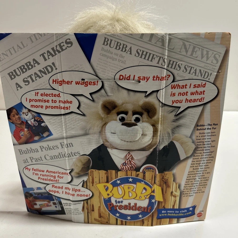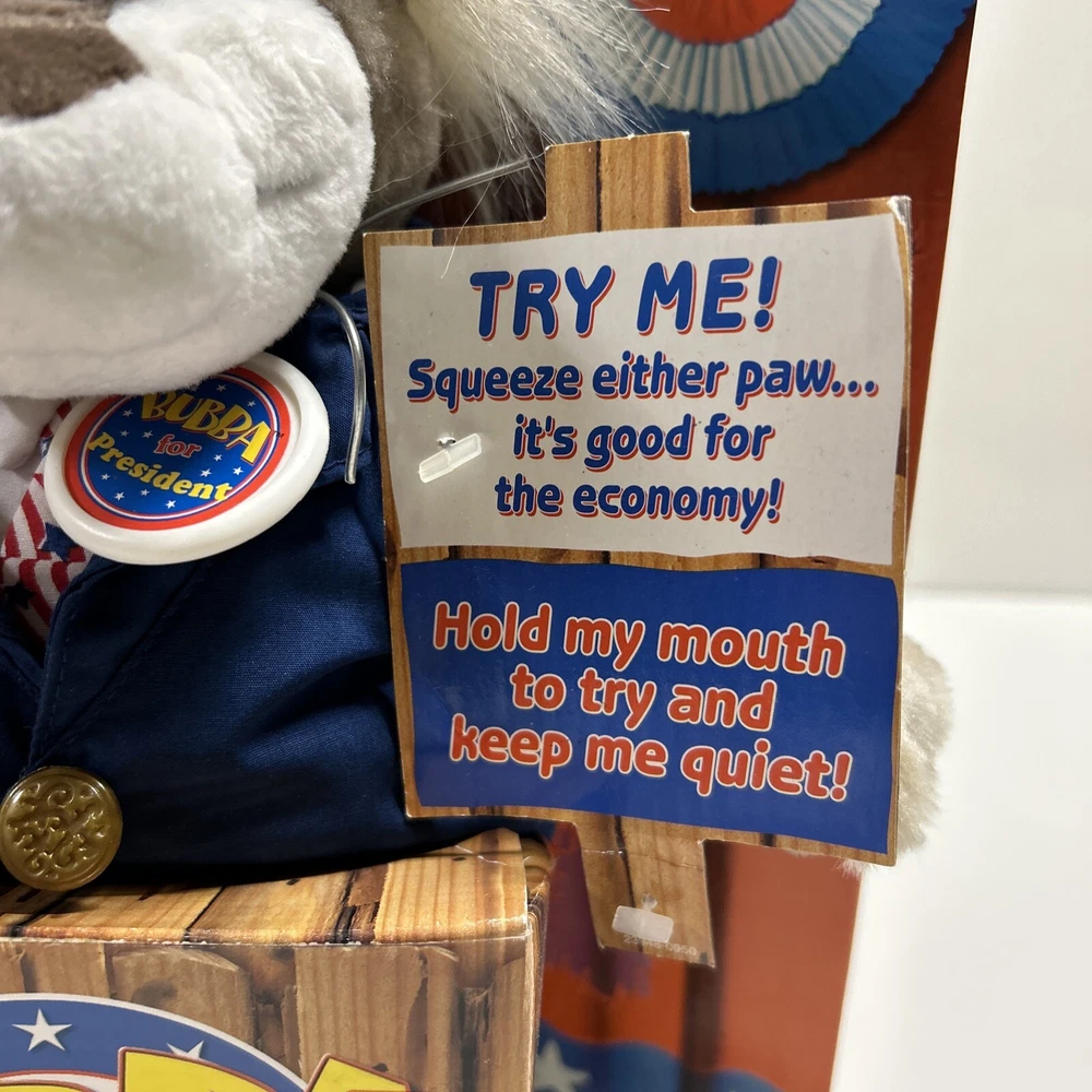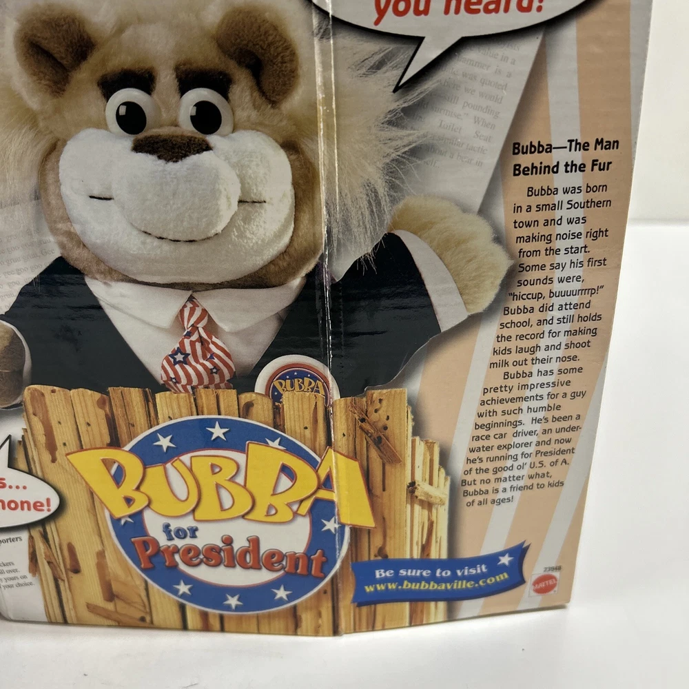 This vintage 90s Mattel Bubba for President Wisecracking Talking Plush Bear from 1999 is a must-have for any toy collector or fan of electronic, battery, and wind-up toys. This adorable plush bear is made by Mattel and has a recommended age range of 3+. It is perfect for children aged 3-4 years, 4-7 years, 8-11 years, 12-16 years, and 17 years & up. The Bubba plush bear is made in China and is part of the Character Family of BUBBA. It is a great addition to any toy collection and is sure to bring joy to anyone who played with it as a child. Its unique features include its brand, year, theme, and age level. It is a perfect gift for anyone who loves animals and vintage toys.