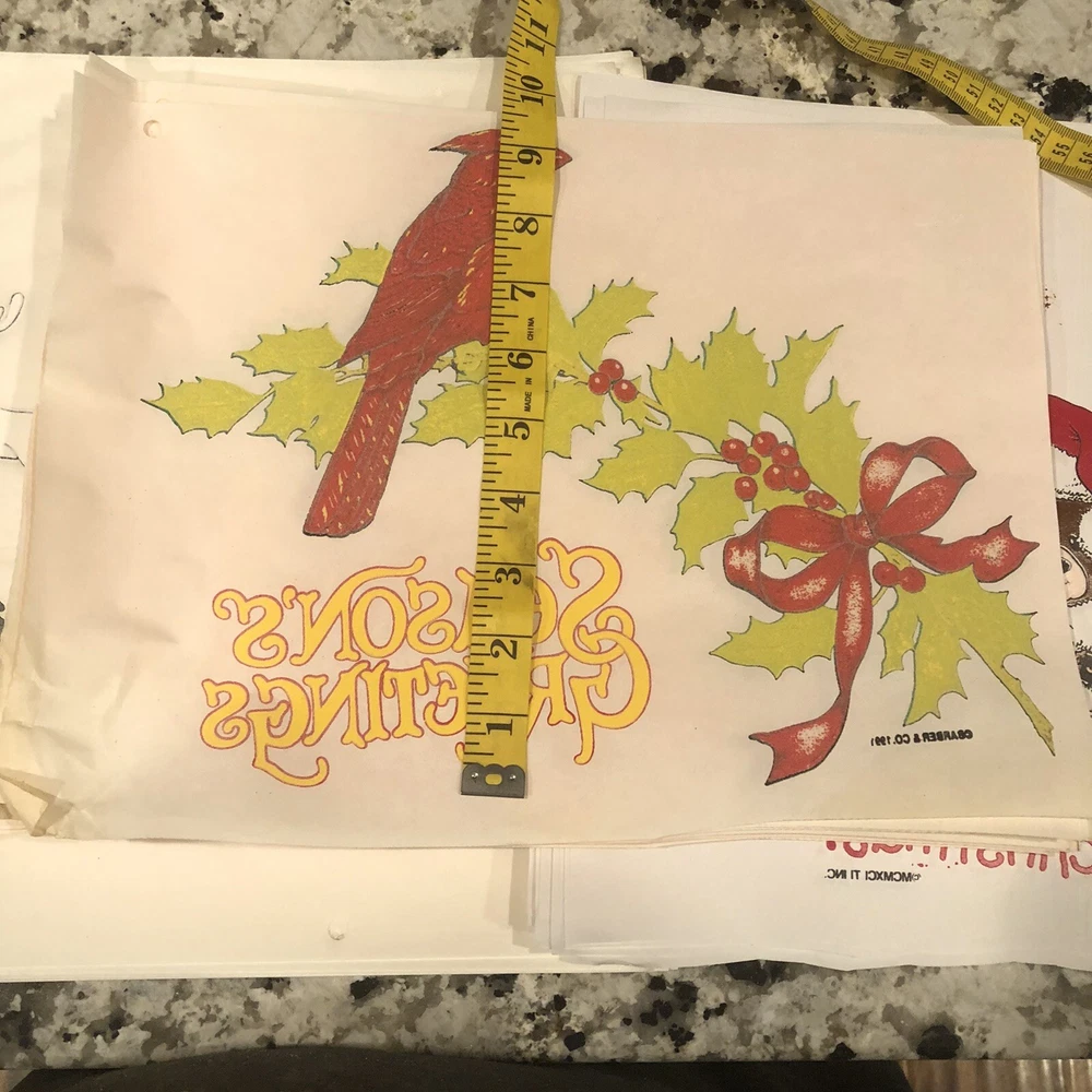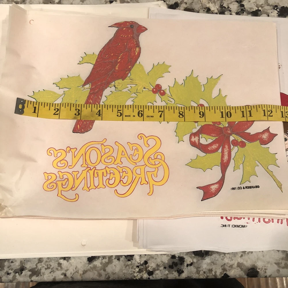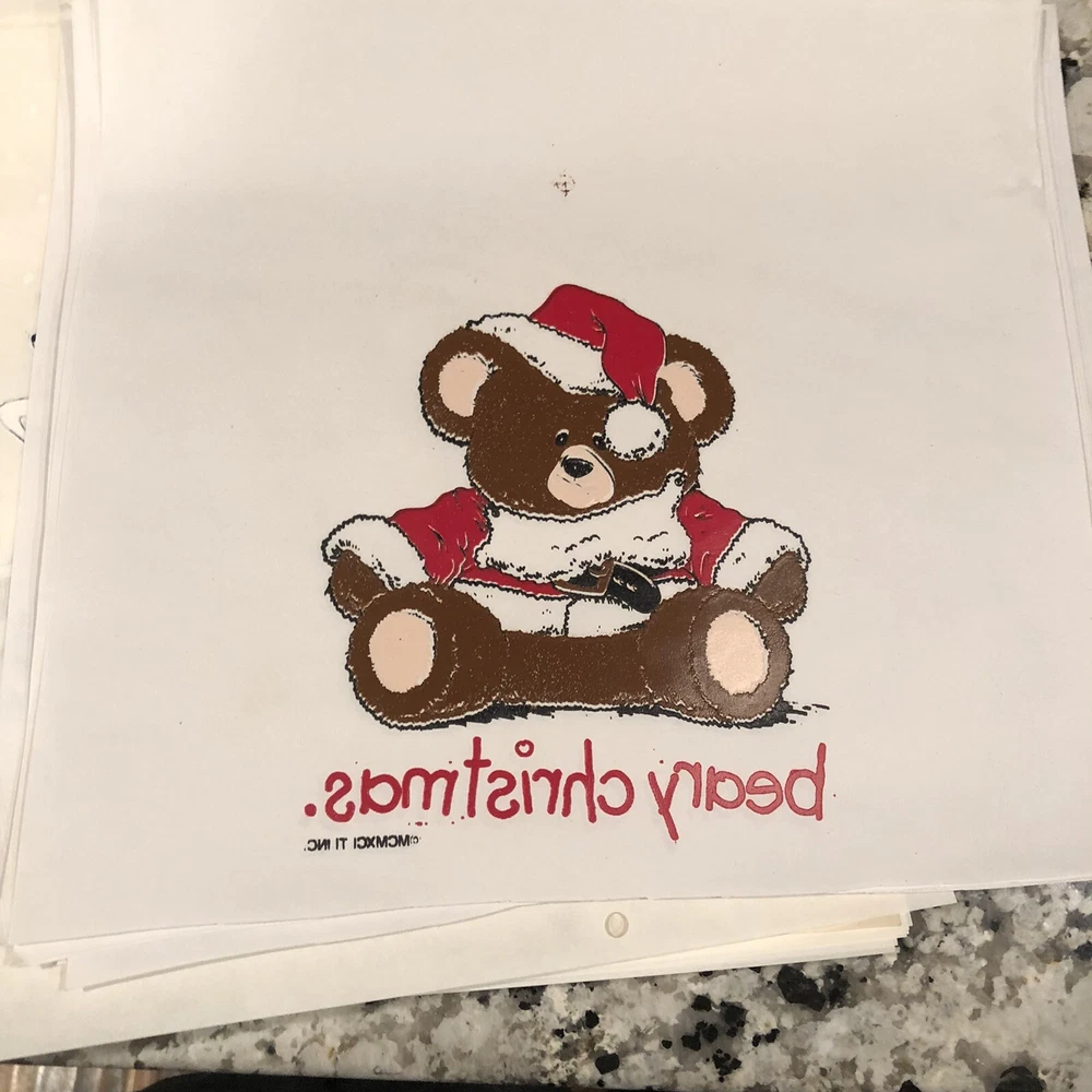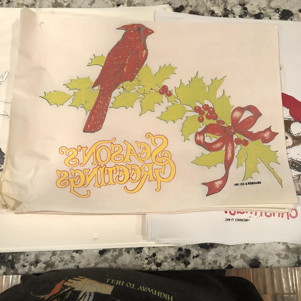 35 Vintage Iron On T-Shirt Transfers Christmas Themed 15 Cardinal Holly Seasons Greetings 1991 10 Reindeer with snow falling 10 Teddy Bear Beary Christmas 1993 These are vintage so are not perfect Will ship in a USPS tube package