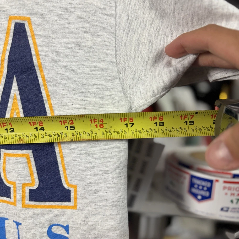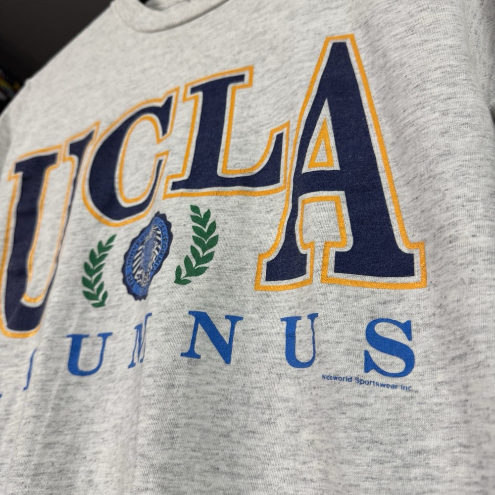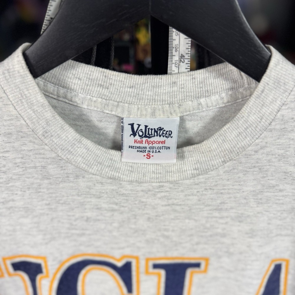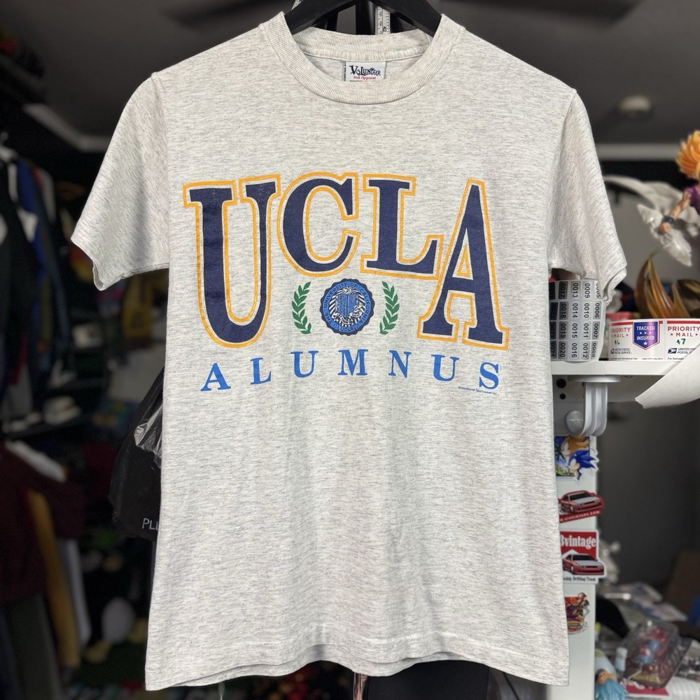 This vintage 90s UCLA Alumnus Bruins shirt is a must-have for any fan of the University of California, Los Angeles. Featuring a graphic print with the iconic Bruins character, this short sleeve t-shirt is made of comfortable cotton knit material in a gray color. Machine washable and with a regular fit, this shirt is perfect for year-round wear whether you're representing your favorite college team or just showing off your love for California. Made by the brand Volunteer in the United States, this shirt is a unique and stylish addition to any wardrobe. Adult Small 17x25, also fits like Youth Large.
