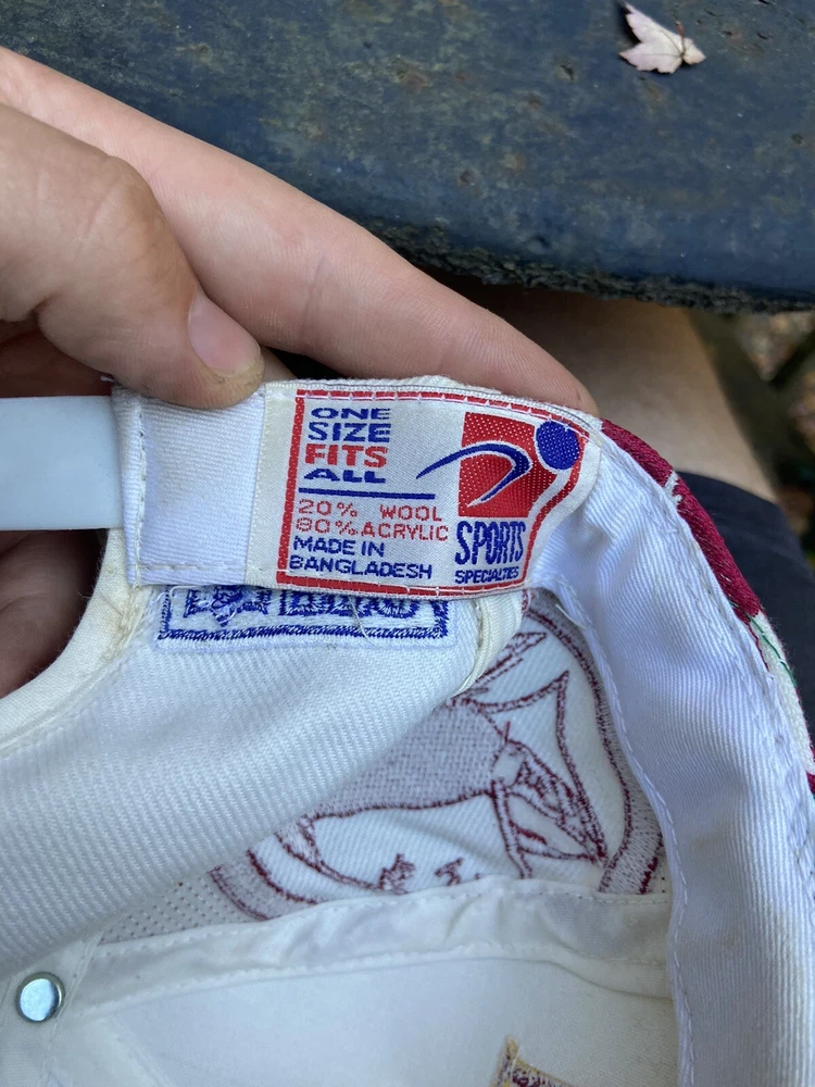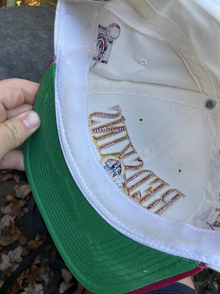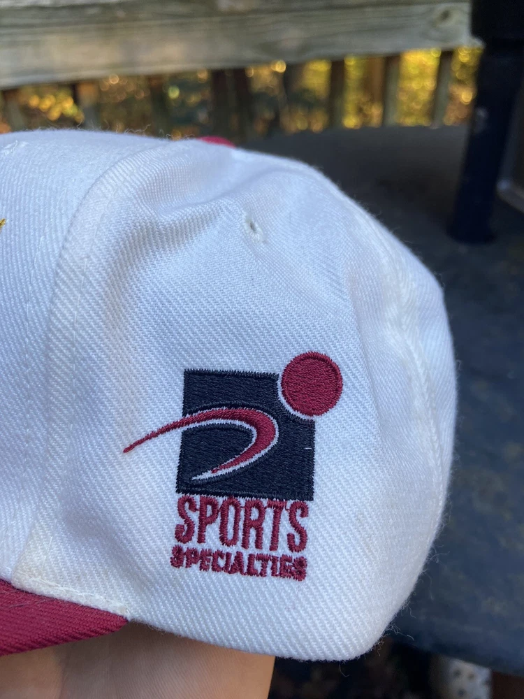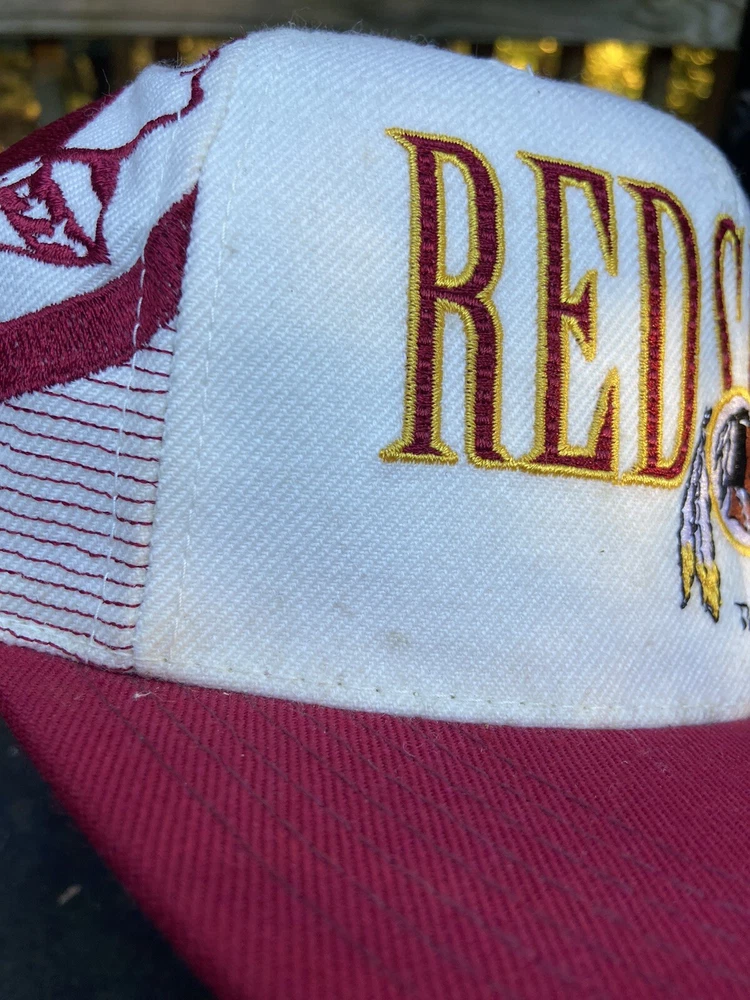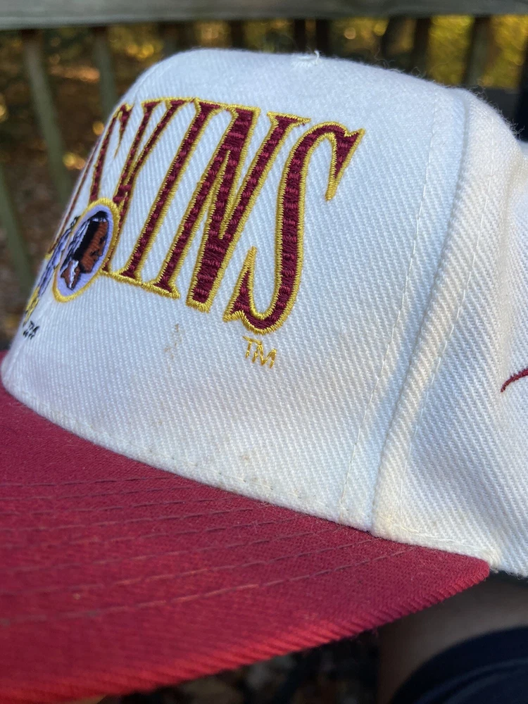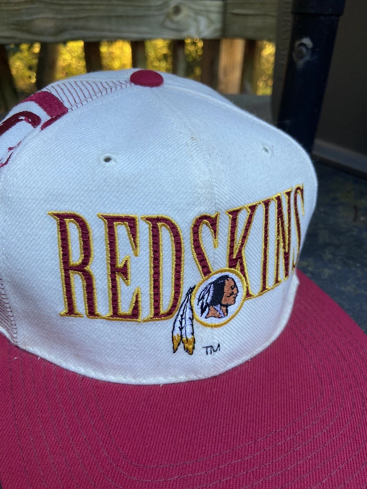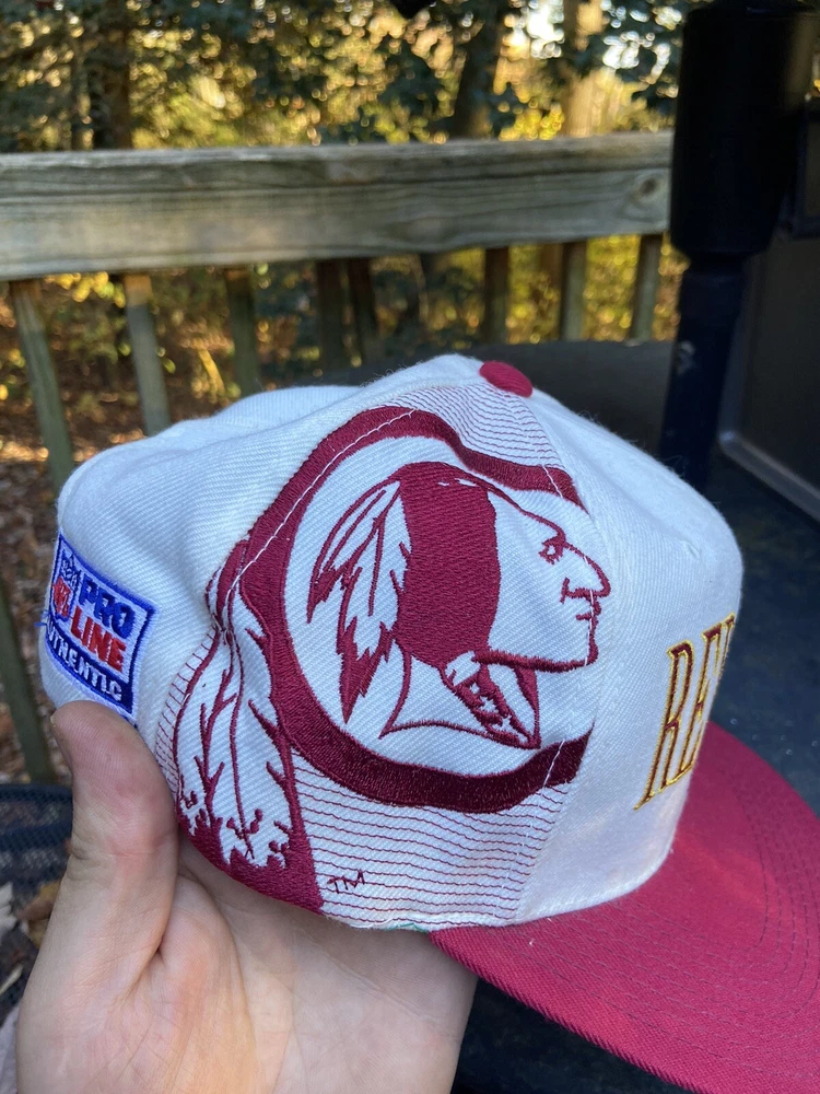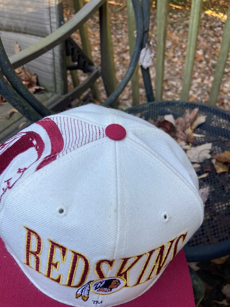 Vintage 90s Washington Redskins NFL Laser Sports Specialties Shadow Snapback Hat. A super cool hat with the Redskins logo and the team's name behind it in a cool script. It has the one panel with the laser design and logo. The hat has sat in storage for an extended amount of time so there are some storage stains throughout the hat as shown in the pictures. There are marks around the entire inner brim, and there are some marks on the outside of the panels and throughout the hat. A good and thorough clean would restore the hat and make it look great. A great piece for any fan of vintage hats and vintage Redskins gear.