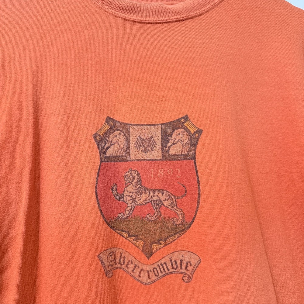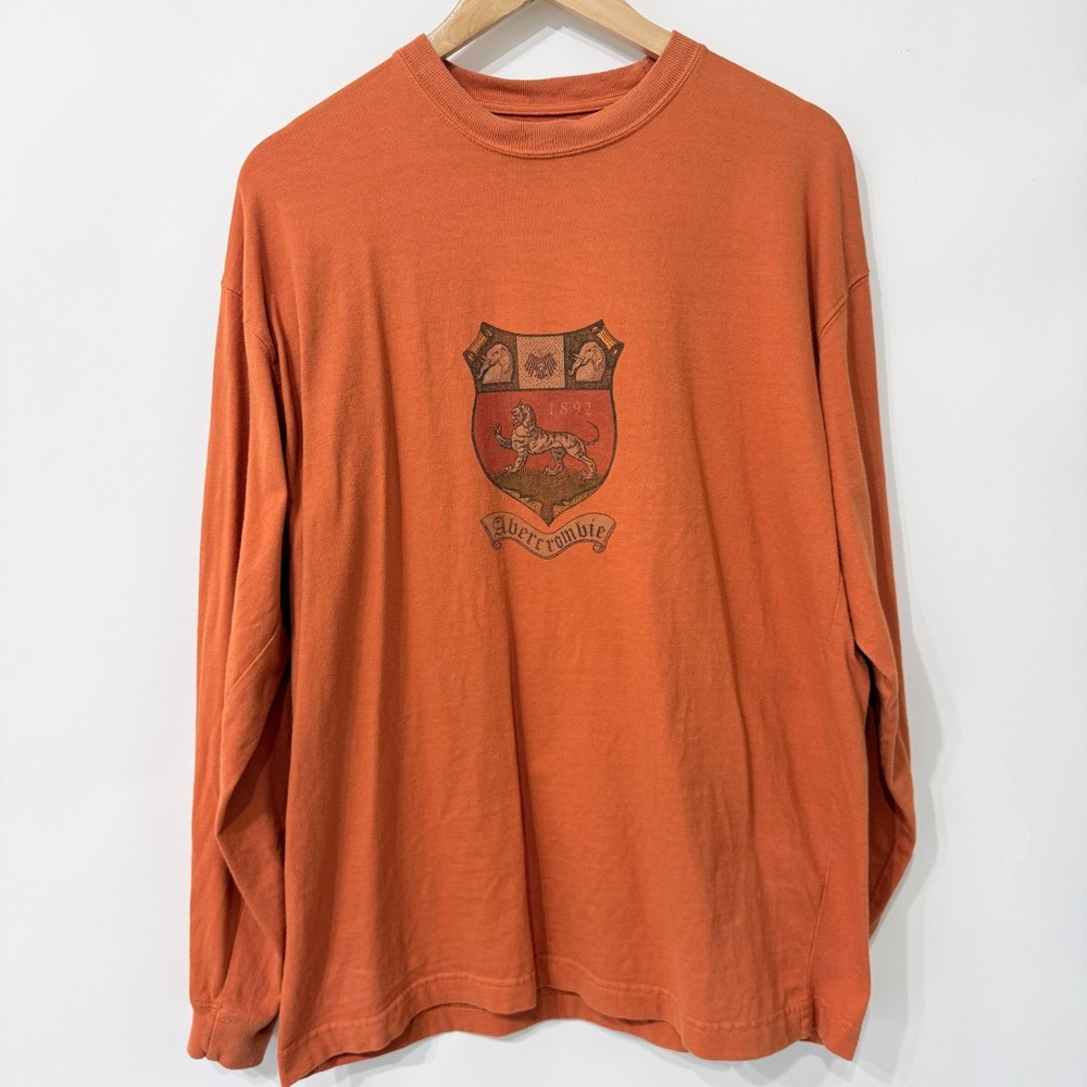Vintage Abercrombie long sleeve tee with crest logo graphic with lion emblem and "1892" detailing. "AF" and lion graphic on one sleeve. Burnt orange/rust color, classic crew neckline and ribbed cuffs. Collegiate heritage vibes. Condition: Great vintage condition with expected fading for age. No rips, stains, or holes. Measurements in photos. *Please compare measurements to something you already own. *Next business day shipping! *Thank you for supporting my small business!