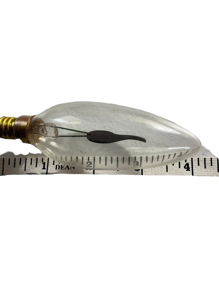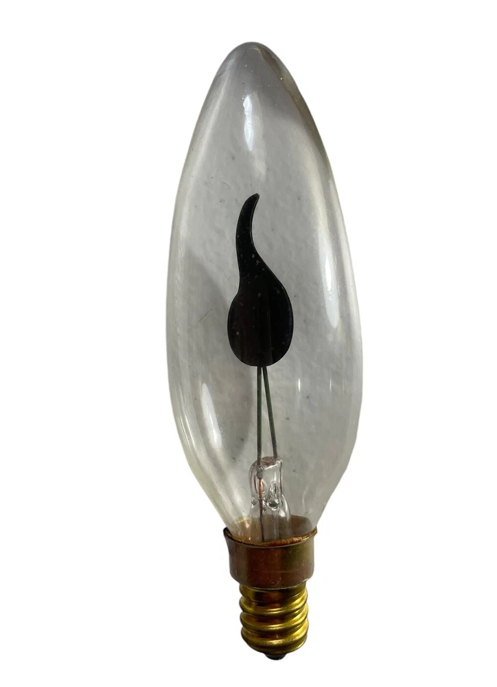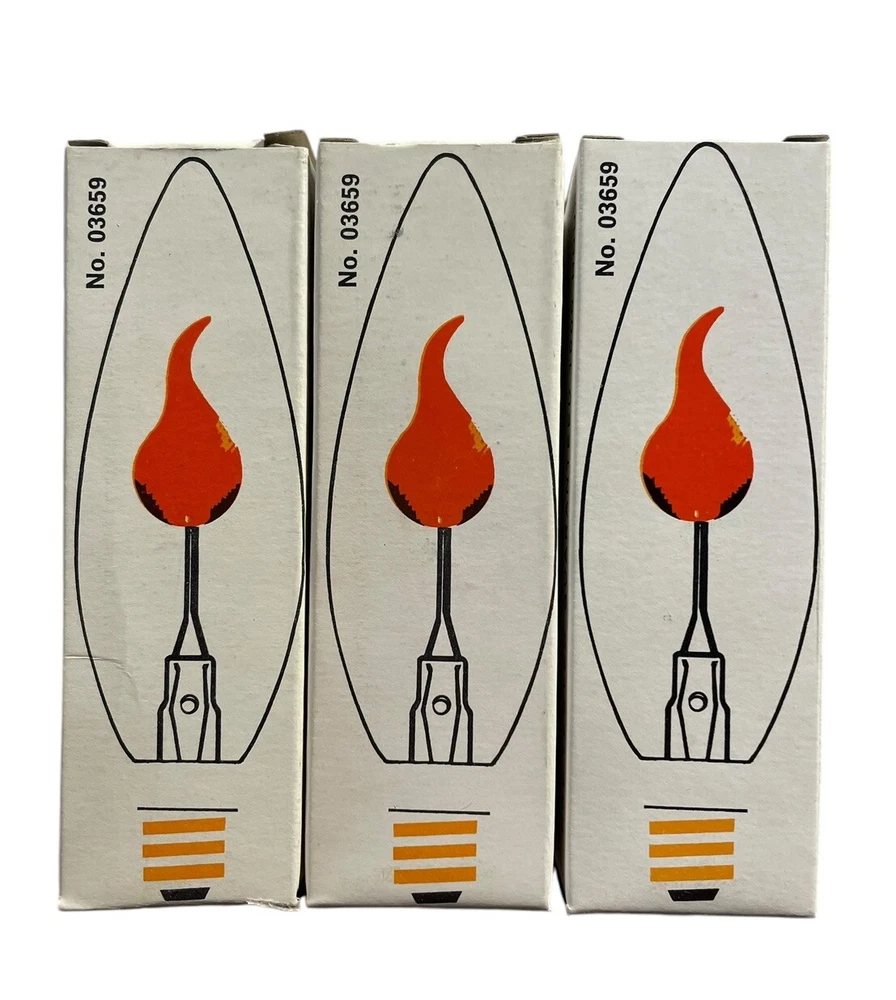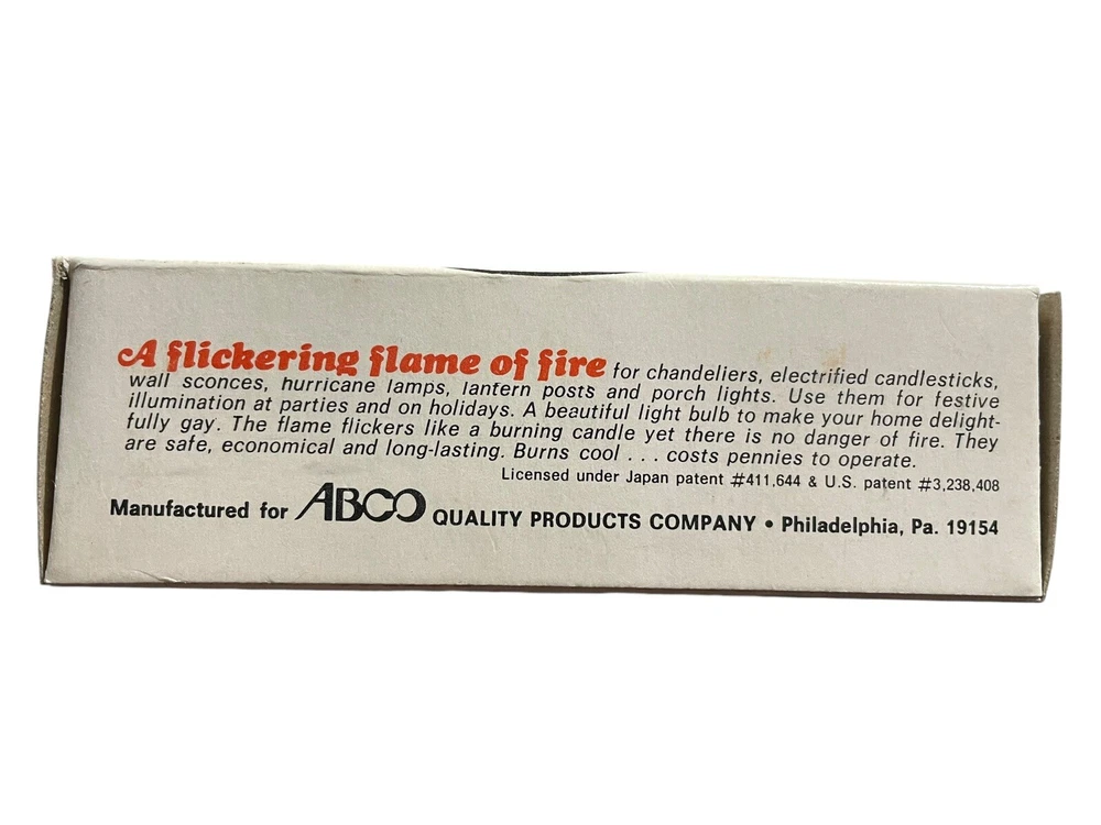 Add a vintage touch to your home decor with these ABCO flicker flame bulbs. Made in Japan, these clear torpedo-style bulbs have a wattage of 3W and a voltage of 120V. Perfect for creating a cozy atmosphere in your living room or bedroom, these bulbs have a flicker effect that adds a warm glow to your space. The model number for these bulbs is ABCO 03659, and they are suitable for use in vintage/retro style lamps, wall sconces, hurricane lamps, chandeliers, electric candlesticks, lantern post! Get these bulbs today and create a unique and inviting ambiance in your home. Lot of 3 bulbs. 1970s New old stock. Made in Japan