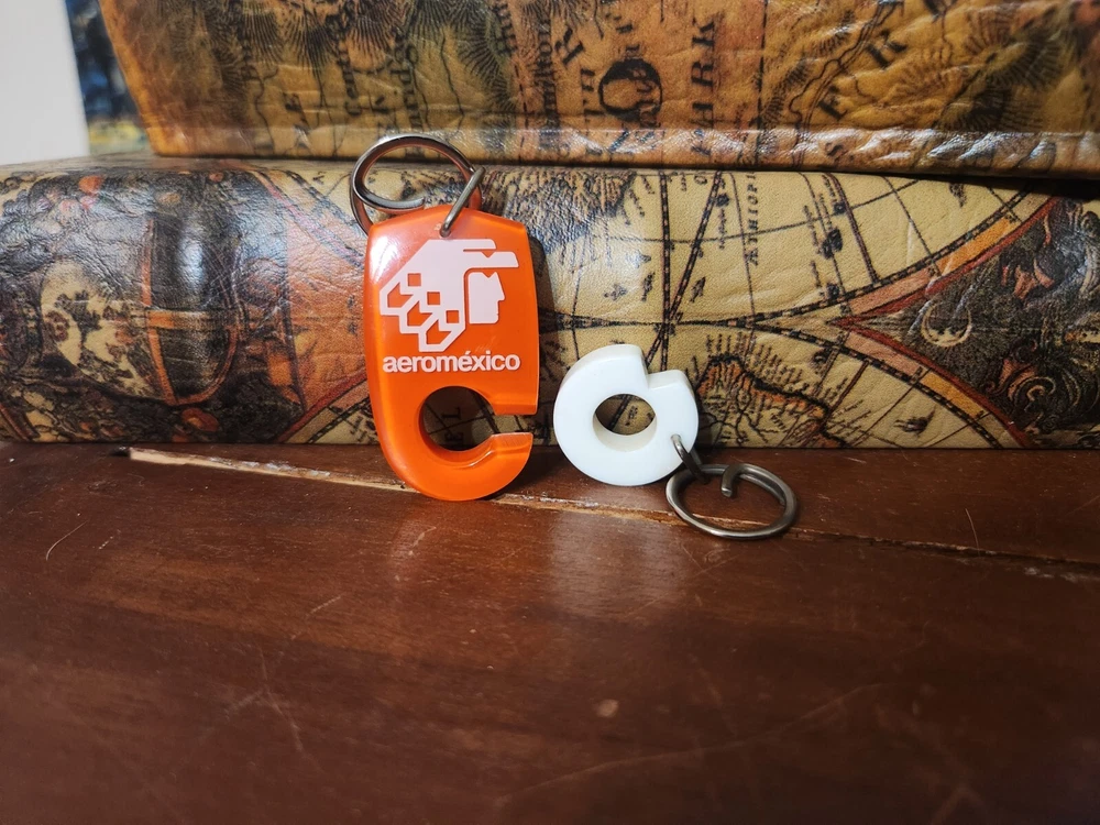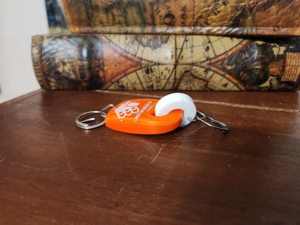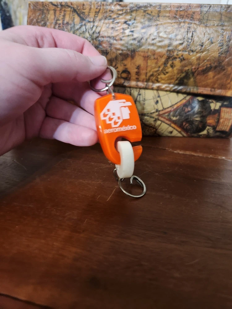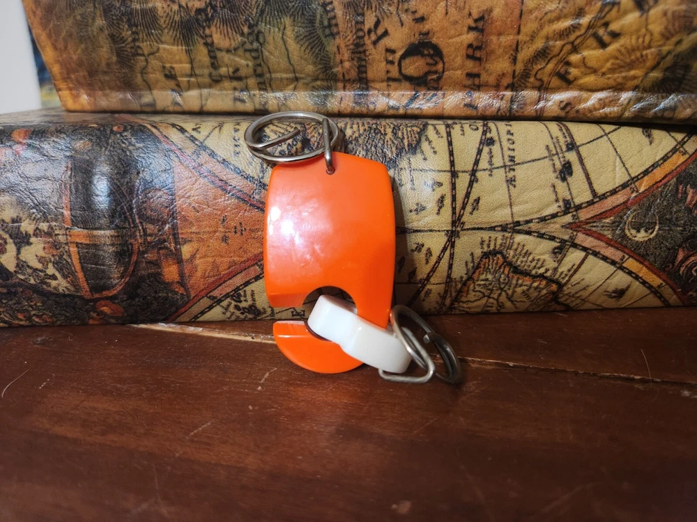 In overall good used condition, signs of use are present but nothing major. Please view all pictures and zoom in for a full visual description. Measures approximately 4" ring to ring. Main part of keychain is 1.75" x 1.125"
