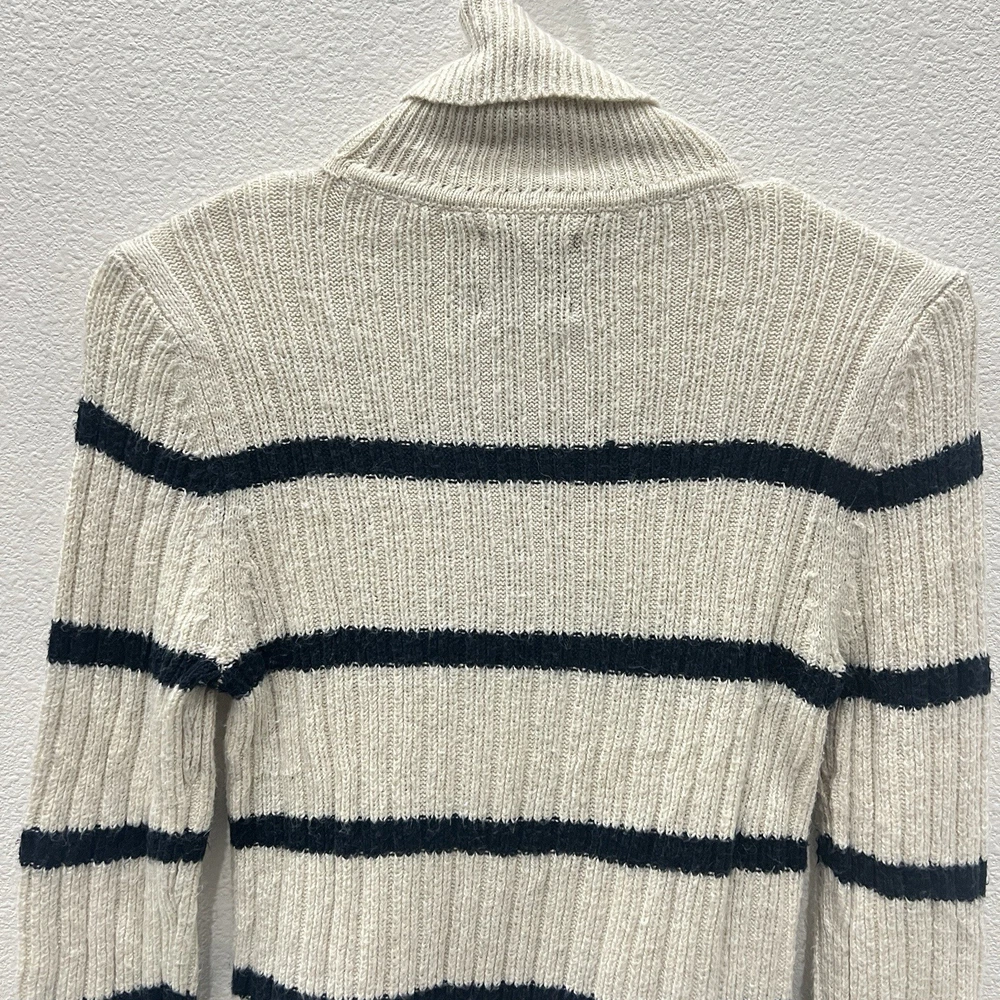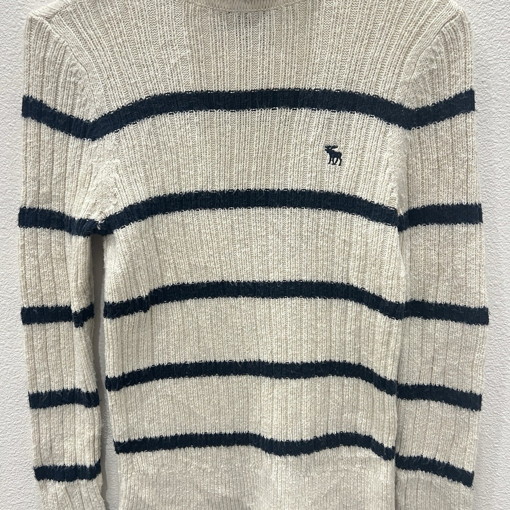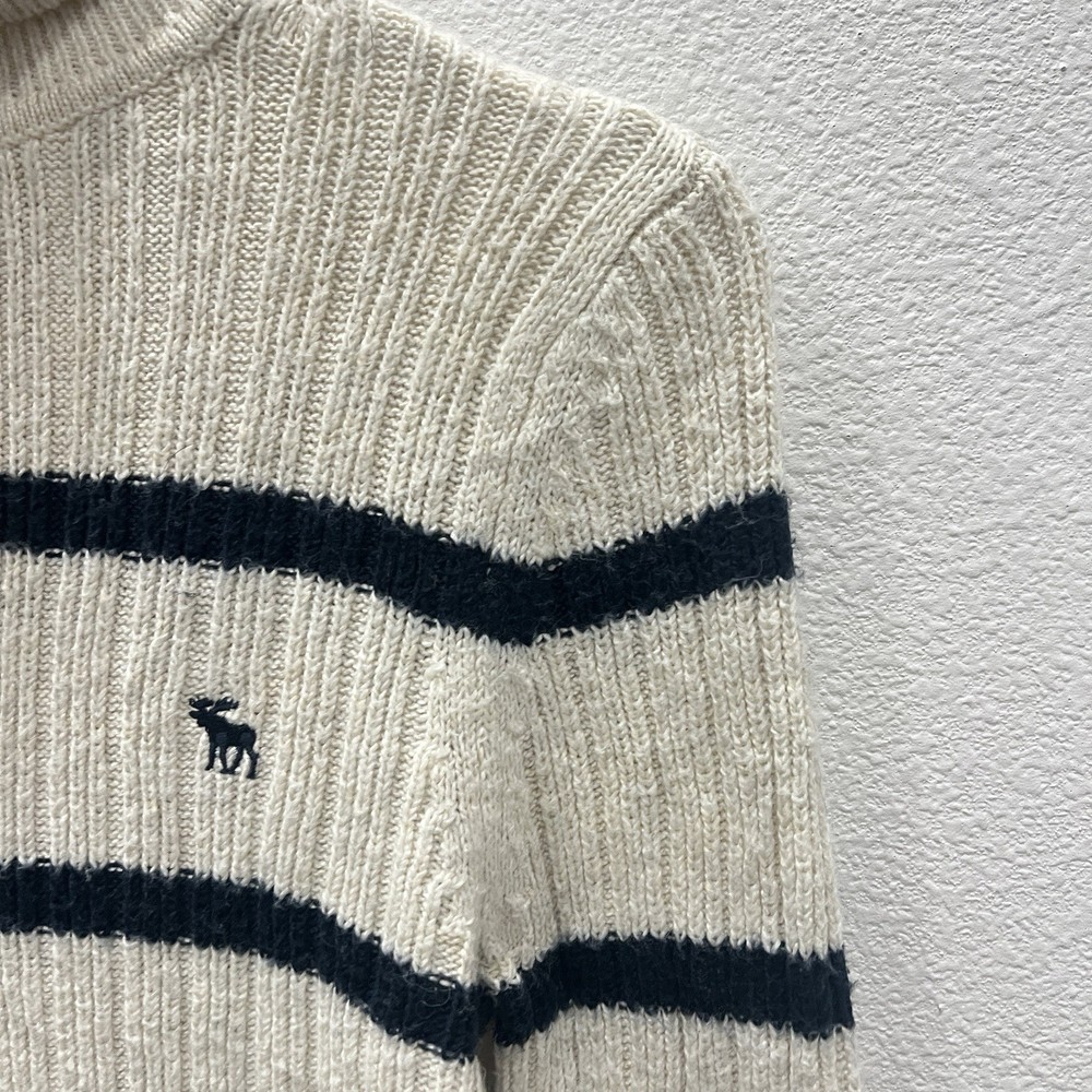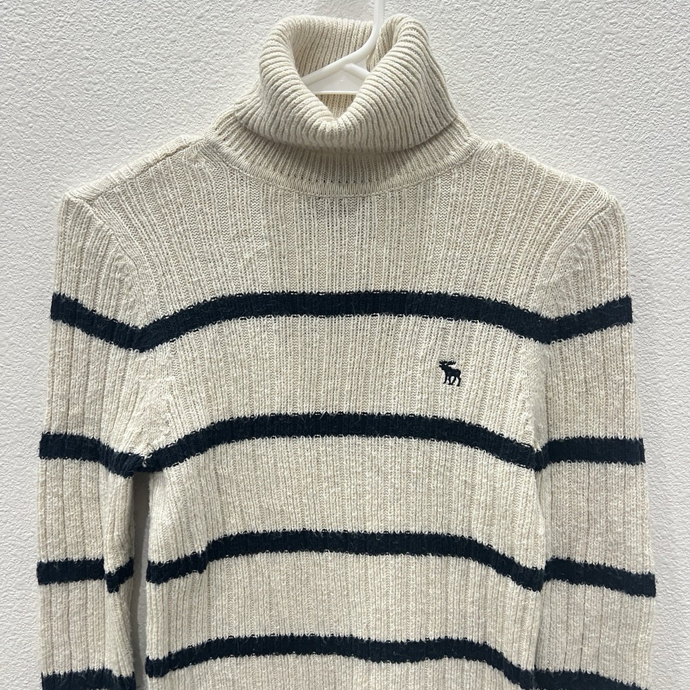 Vintage Abercrombie & Fitch Y2K Ribbed Striped Turtleneck Sweater Moose Logo Size Small. Average preowned condition with plenty of wear remaining. Does show signs of normal wear with some pilings present. Will arrive freshly washed and ready to wear. This is a classic vintage Abercrombie & Fitch turtleneck sweater, a perfect piece for a Y2K or 90s inspired look. The sweater is made from a soft, rubbed knit material and features a cream/off-white color with navy blue stripes. It has a signature Abercrombie & Fitch moose logo embroidered on the chest. Armpit to Armpit: 15 in Shoulder to Shoulder: 14 in Sleeves: 28 in Neck to Hem: 21 in