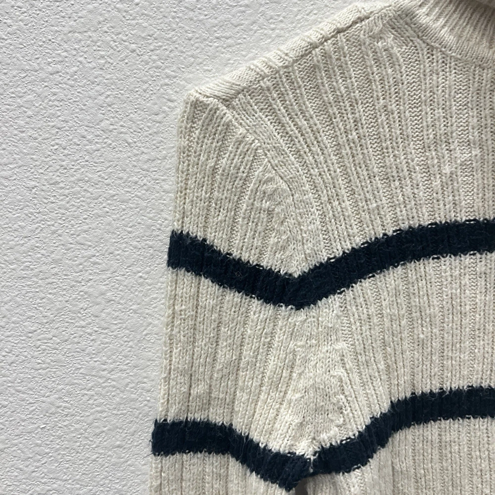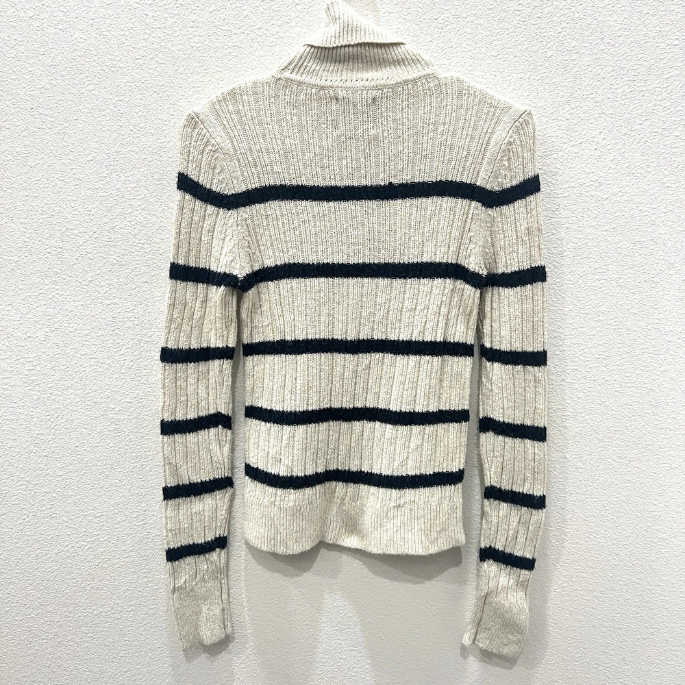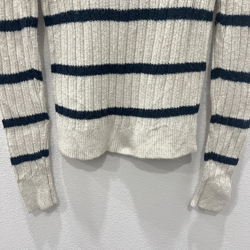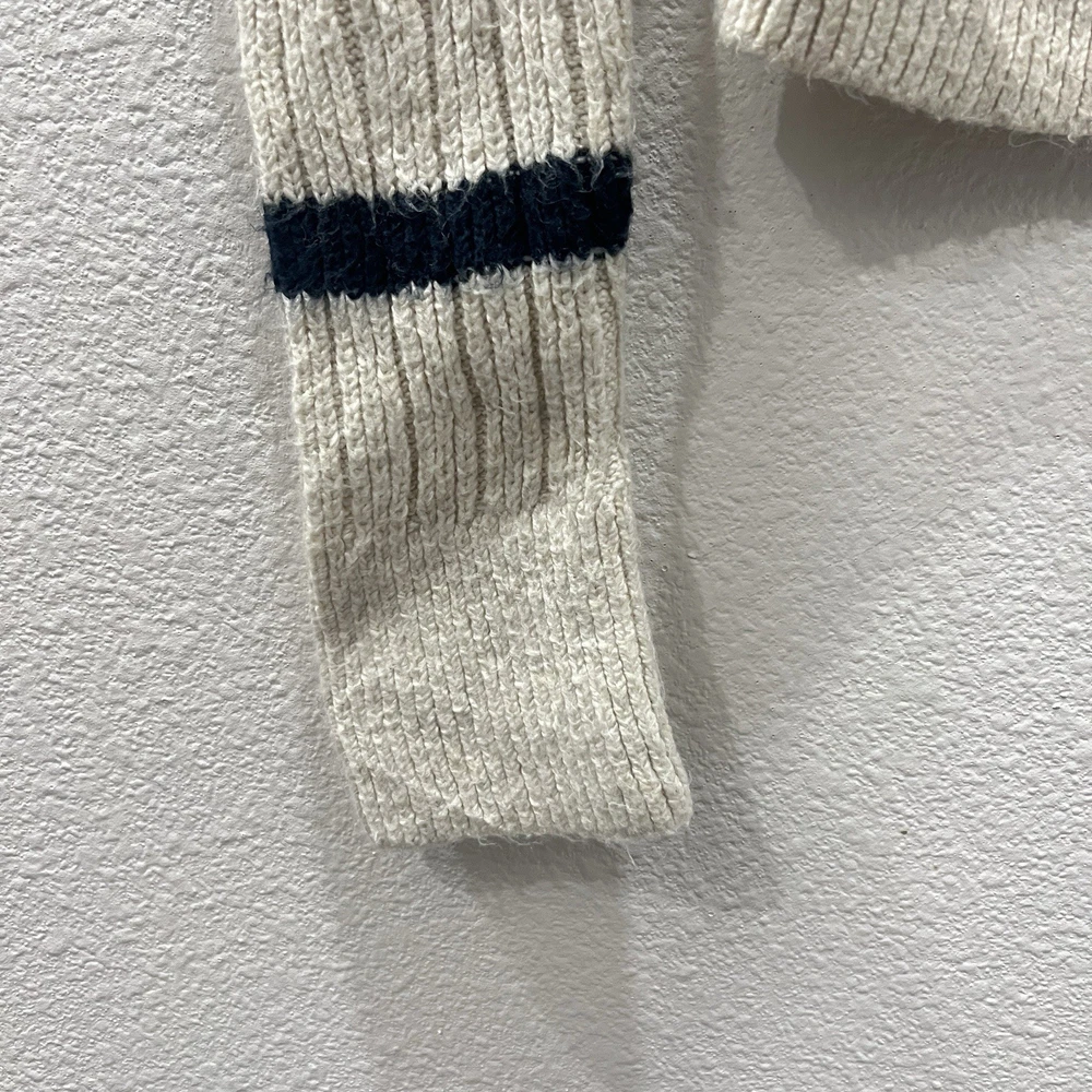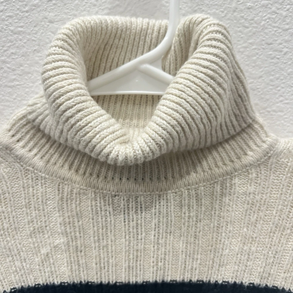 Vintage Abercrombie & Fitch Y2K Ribbed Striped Turtleneck Sweater Moose Logo Size Small. Average preowned condition with plenty of wear remaining. Does show signs of normal wear with some pilings present. Will arrive freshly washed and ready to wear. This is a classic vintage Abercrombie & Fitch turtleneck sweater, a perfect piece for a Y2K or 90s inspired look. The sweater is made from a soft, rubbed knit material and features a cream/off-white color with navy blue stripes. It has a signature Abercrombie & Fitch moose logo embroidered on the chest. Armpit to Armpit: 15 in Shoulder to Shoulder: 14 in Sleeves: 28 in Neck to Hem: 21 in