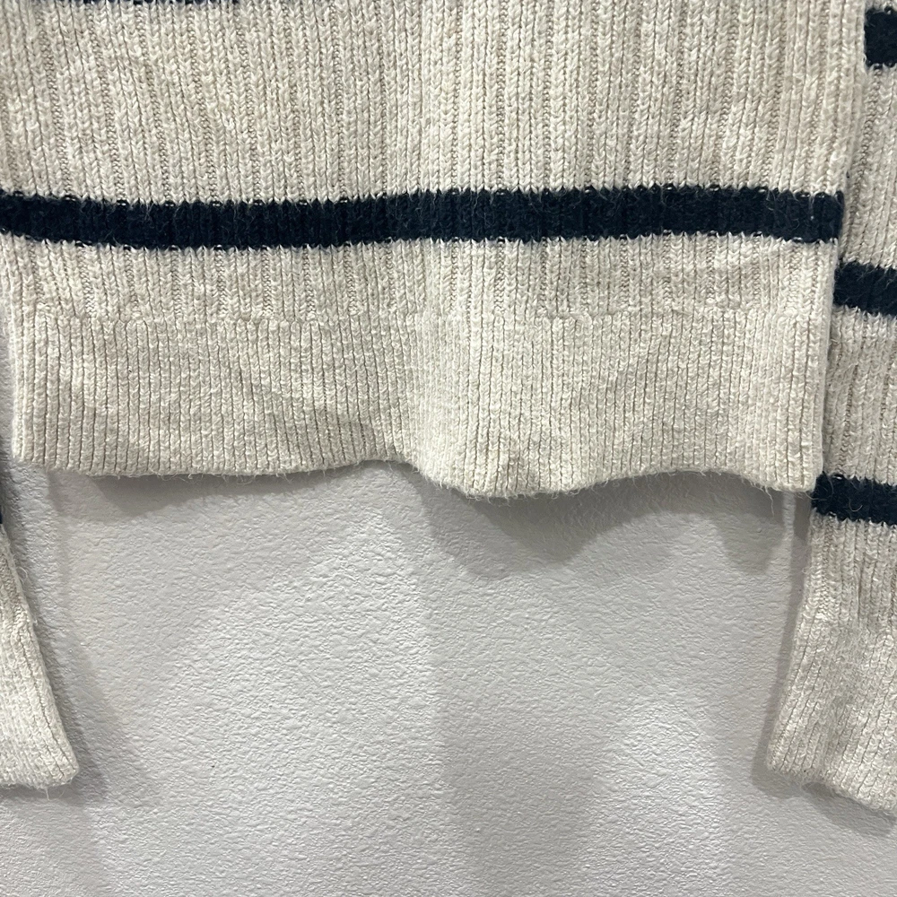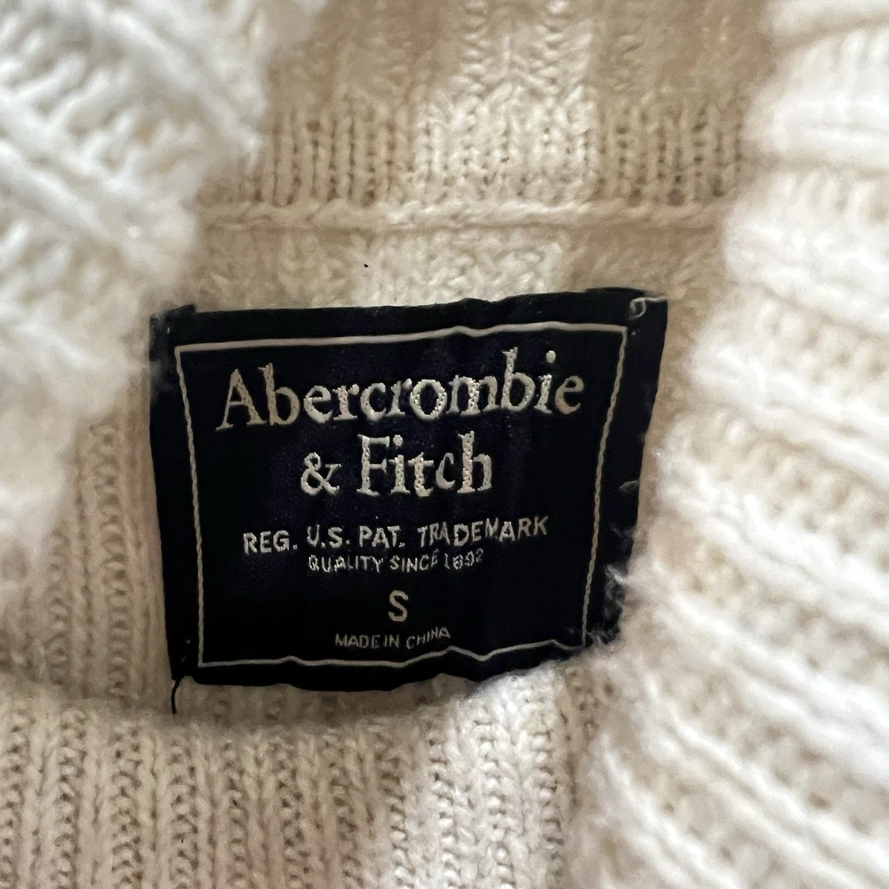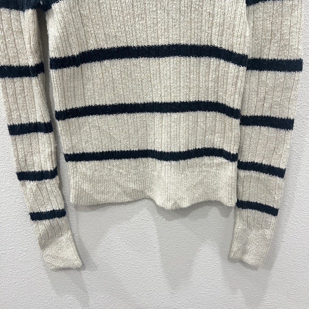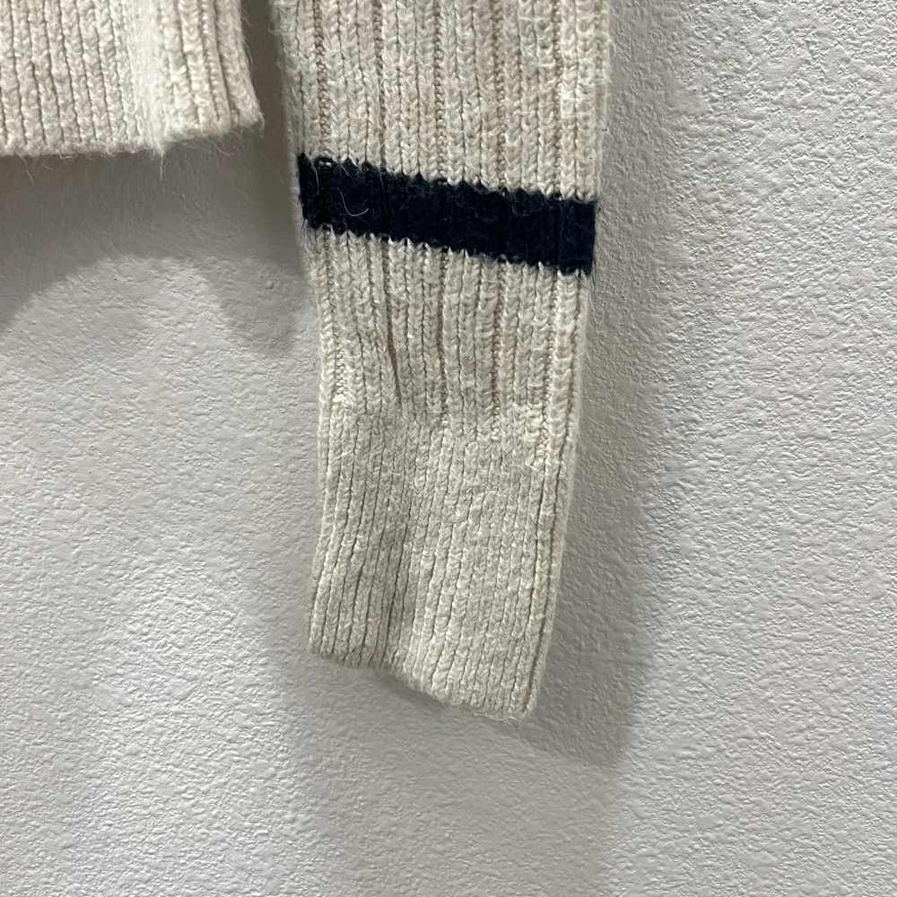 Vintage Abercrombie & Fitch Y2K Ribbed Striped Turtleneck Sweater Moose Logo Size Small. Average preowned condition with plenty of wear remaining. Does show signs of normal wear with some pilings present. Will arrive freshly washed and ready to wear. This is a classic vintage Abercrombie & Fitch turtleneck sweater, a perfect piece for a Y2K or 90s inspired look. The sweater is made from a soft, rubbed knit material and features a cream/off-white color with navy blue stripes. It has a signature Abercrombie & Fitch moose logo embroidered on the chest. Armpit to Armpit: 15 in Shoulder to Shoulder: 14 in Sleeves: 28 in Neck to Hem: 21 in