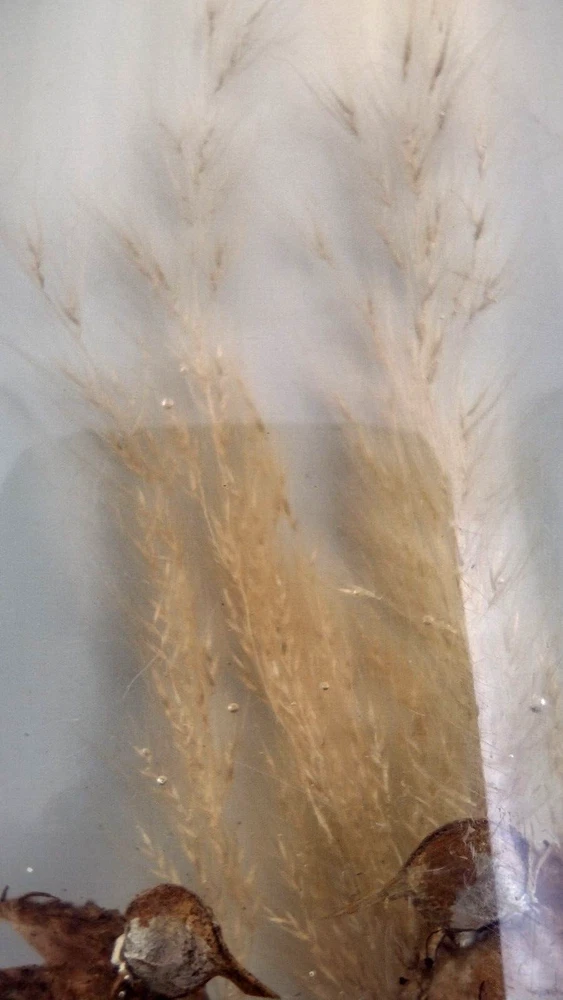 This handmade acrylic/resin paperweight measures 5.5" in height, 4" in width and its widest, and 1.5" at its thickest. It has a seed pod made into the shapes of ducks sitting on a piece of bark (log) with a 'wheat' talk in the background. Shipped with USPS Ground Mail. St