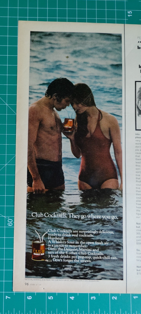 Vintage Ad Club Cocktails They Go Where You Go Whiskey Sour Daiquiri Martini For your consideration is this classic Vintage Advertisement from the 1970's. The "Date of Creation" represents the magazine issue date. NOTE: This ad is from the inside of the cover page and is printed on a heavier paper stock. "Old school" advertisements for sure! Please closely review the image for any signs of wear or damage, and, if needed, please ask for clarification prior to purchasing. All items presented for review come from a smoke free home. The Vintage Advertisement shown above is available today and is ready for immediate shipping, packaged in a sleeve between card stock stiffeners, ensuring that you receive it in an undamaged state. NOTE that any measurements listed are approximations. Be sure to visit my eBay store for other Postcards and ephemera I have to offer and follow me for access to flash discount sales - you never know when they will happen! Important note: As per eBay policy, all orders will be shipped out only to the address registered to the buyer on the account. No shipments will be made to alternate address. Terms of Sale What happens if you are not satisfied with your purchase? Well, just simply return the purchase to me within 60 calendar days from the date of the sale - IN THE SAME CONDITION AS IT WAS SHIPPED TO YOU - and I will provide you with a refund. You must start the return request process in eBay for your refund. I do not provide adjustments or partial refunds. Your return postage expense will not be reimbursed. Unfortunately, if the item is returned in a damaged state, I will not provide any refund as it cannot be resold. That said, I want you to be 100% satisfied! Shipping & Fees Prior to finalizing your purchase please review my current business and shipping policies for additional details, fees, timely updates and any recent changes. My normal order processing time is completed on the same business day IF the order is received before 1400 (2:00 PM) PST (Mon-Sat). ALL Postcard purchases are shipped via eBay Standard Envelope if they meet the following requirements: Each eBay Standard Envelope can contain a maximum of 1 postcard with a sales value equal to, or less than, $20.00 Each eBay Standard Envelope can contain a maximum of 3 postcards with a sales value equal to, or less than, $50.00 Each eBay Standard Envelope can contain maximum of 3 postcards per envelope; therefore you will receive multiple eBay Standard Envelopes if you purchase 4 or more postcards, with each eBay Standard Envelope potentially being delivered on separate dates USPS only provides tracking updates when it passes through their sorting machines AND has been scanned, not when your carrier has the item. Therefore, when the item is marked as "out for delivery / delivered" it means that it has ONLY arrived at your local sorting center and NOT actually been delivered to your address on file. It could take several days after being marked “out for delivery / delivered” for it to actually arrive at your address. Per USPS guidelines the actual delivery time can take upwards of 2 full weeks to arrive – please be patient. Postcard purchases exceeding these parameters are shipped using Calculated Shipping with the cost being determined by your delivery address All items excluding Postcards, Books & Magazines: These items are shipped using Calculated Shipping with the cost being determined by your delivery address All Books & Magazines: These items are shipped using Media Mail with the cost being determined by your delivery address