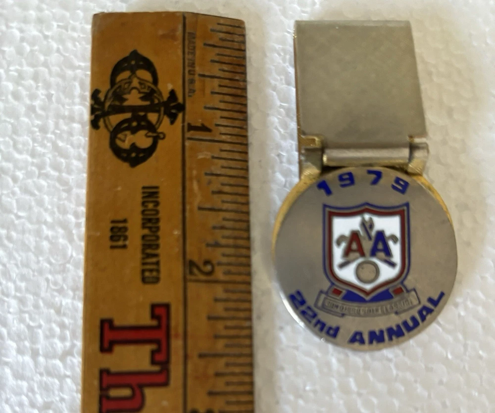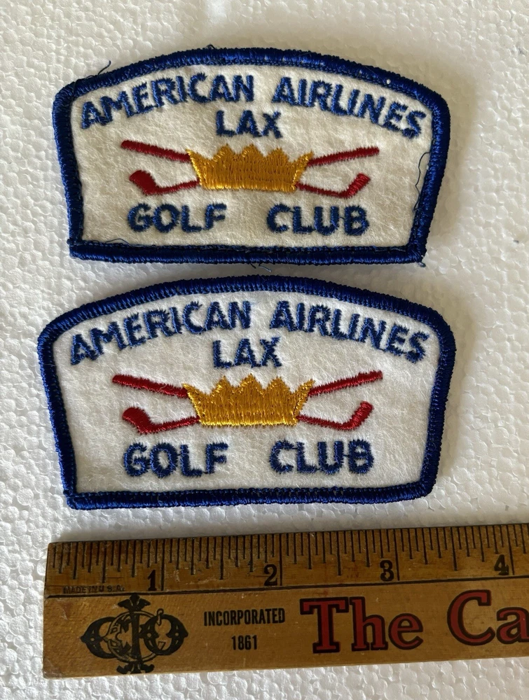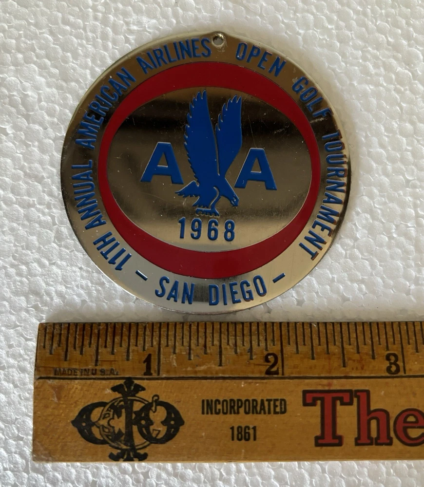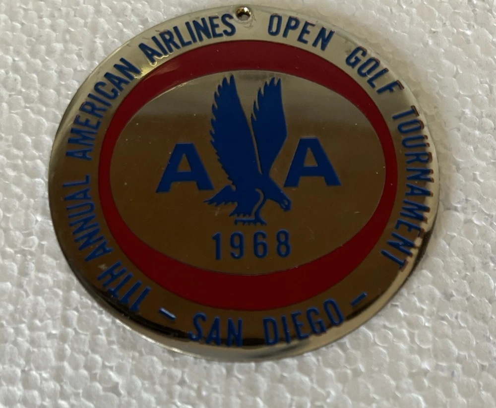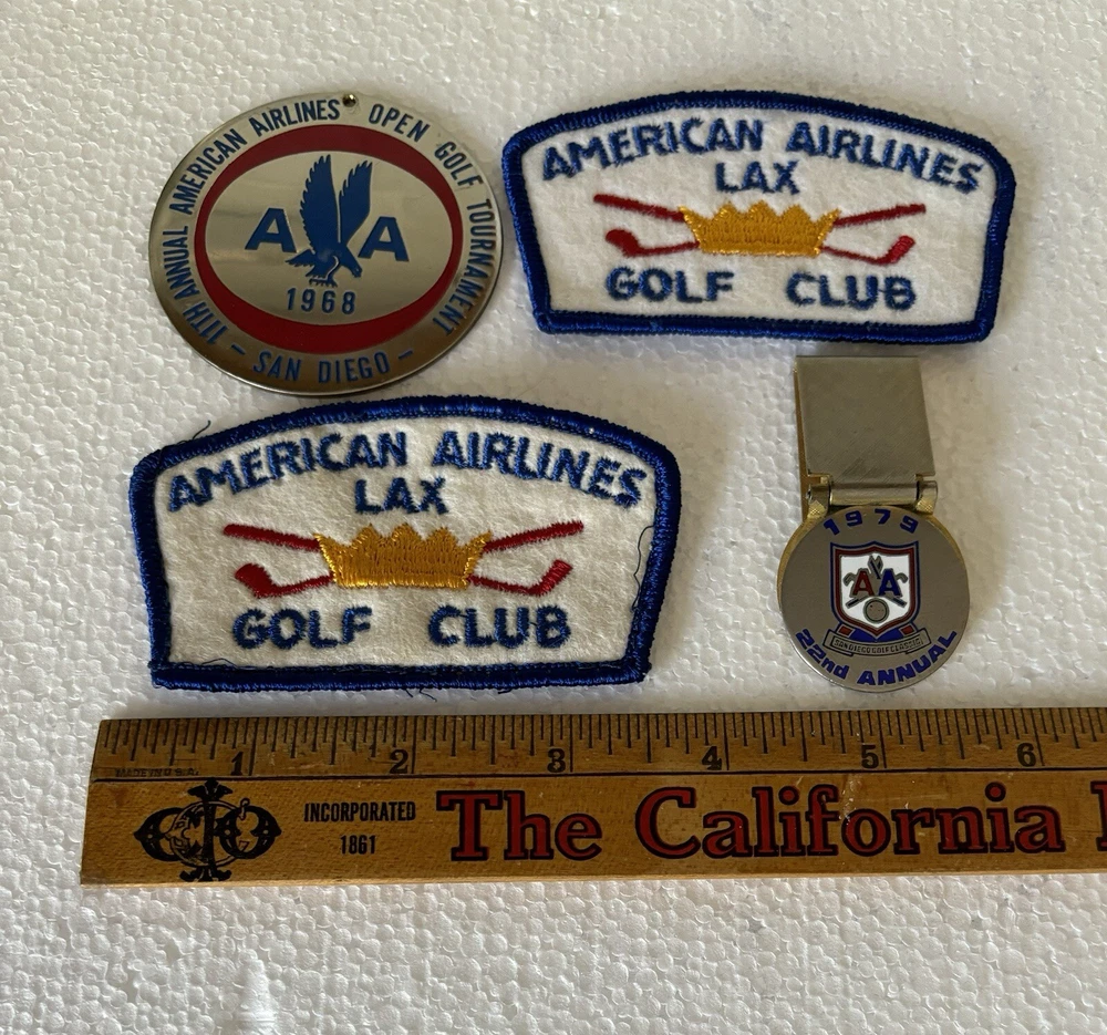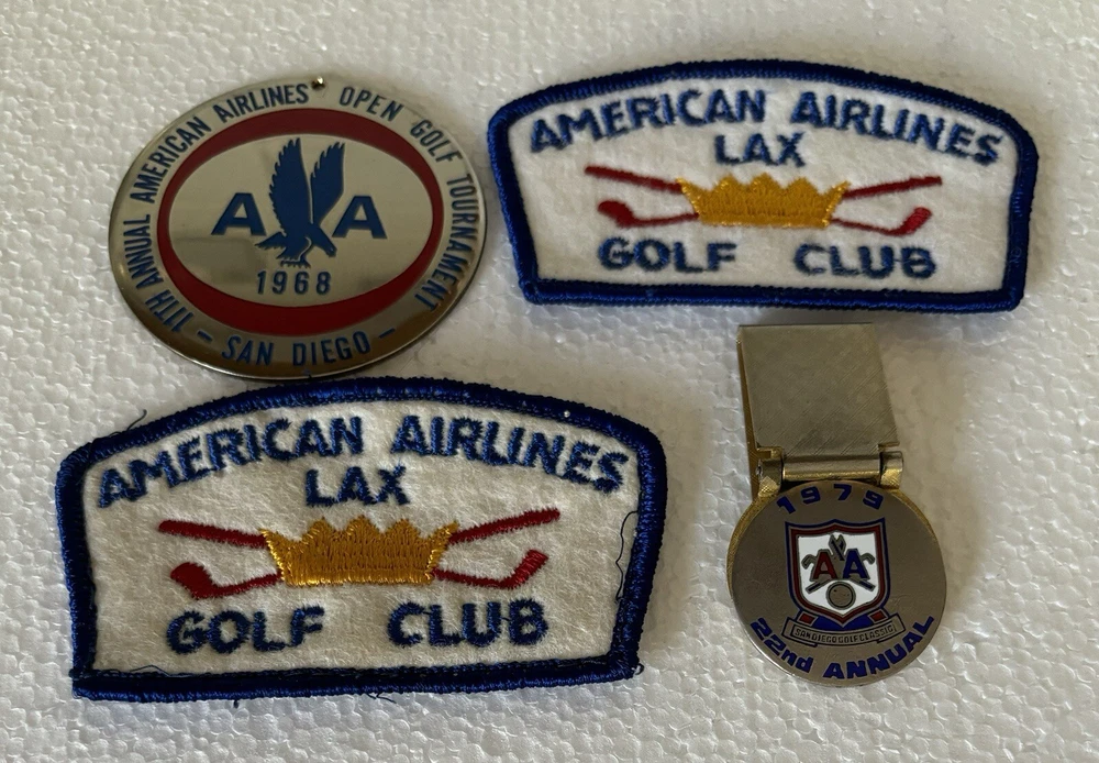 Great lot of vintage American Airlines Golf Club memorabilia. The lot includes 2 American Airlines LAX golf Club embroidered patches, 1 American Airlines 1968 Golf Tournament Medalian, and 1 1979 22nd Annual Golf Classic money clip. All items are in good condition for their age and travels but show signs of wear consistent with age. Any questions please email me. Thanks for looking.