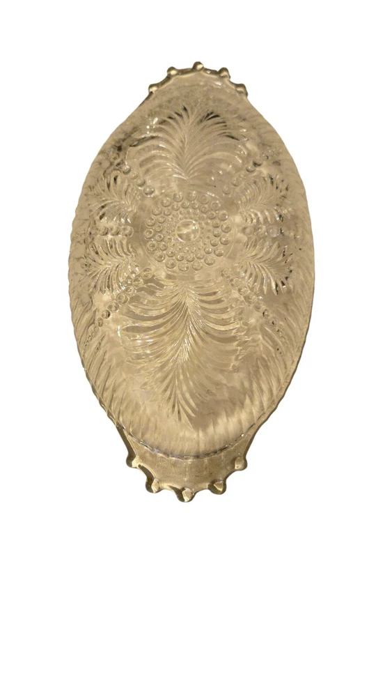 This vintage Anchor Hocking relish dish is a beautiful addition to any Mid-Century Modern collection. The oval shape and glossy finish make it a stunning piece for display or use. The dish measures 8.5 inches in length and 4.25 inches in width, with one compartment and hobnail handles for easy carrying. The clear pressed glass and feather & pearl pattern add a touch of elegance to any table setting. This piece is a true vintage original, produced in the United States in the 1940s, 1950s, and 1960s using early American prescut/EAPC production technique. Perfect for serving nut candy or other small treats, this Anchor Hocking relish dish is a must-have for any collector.