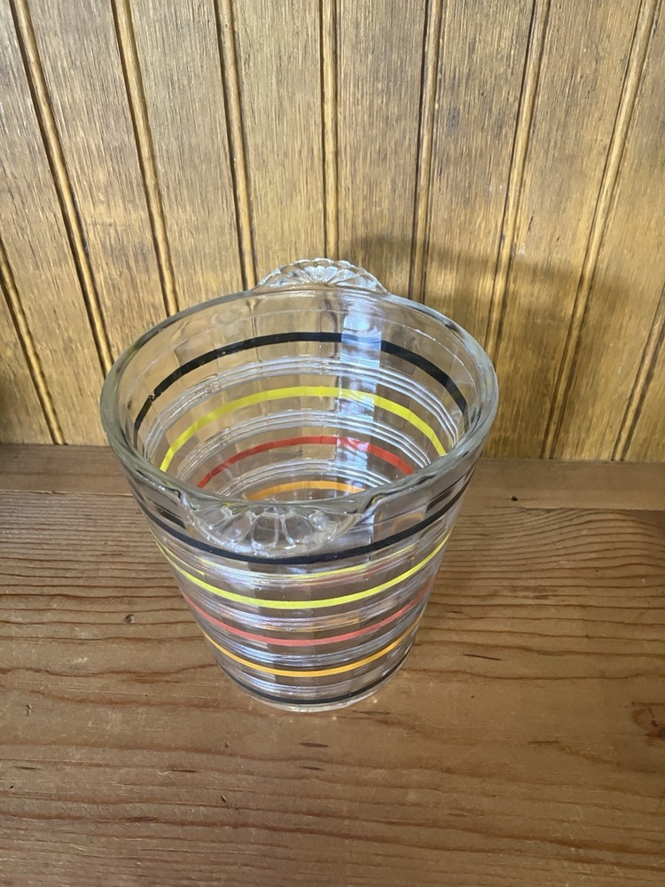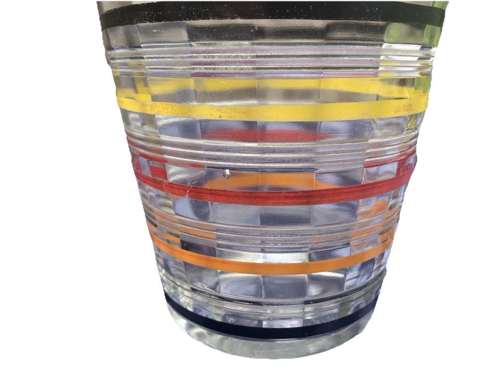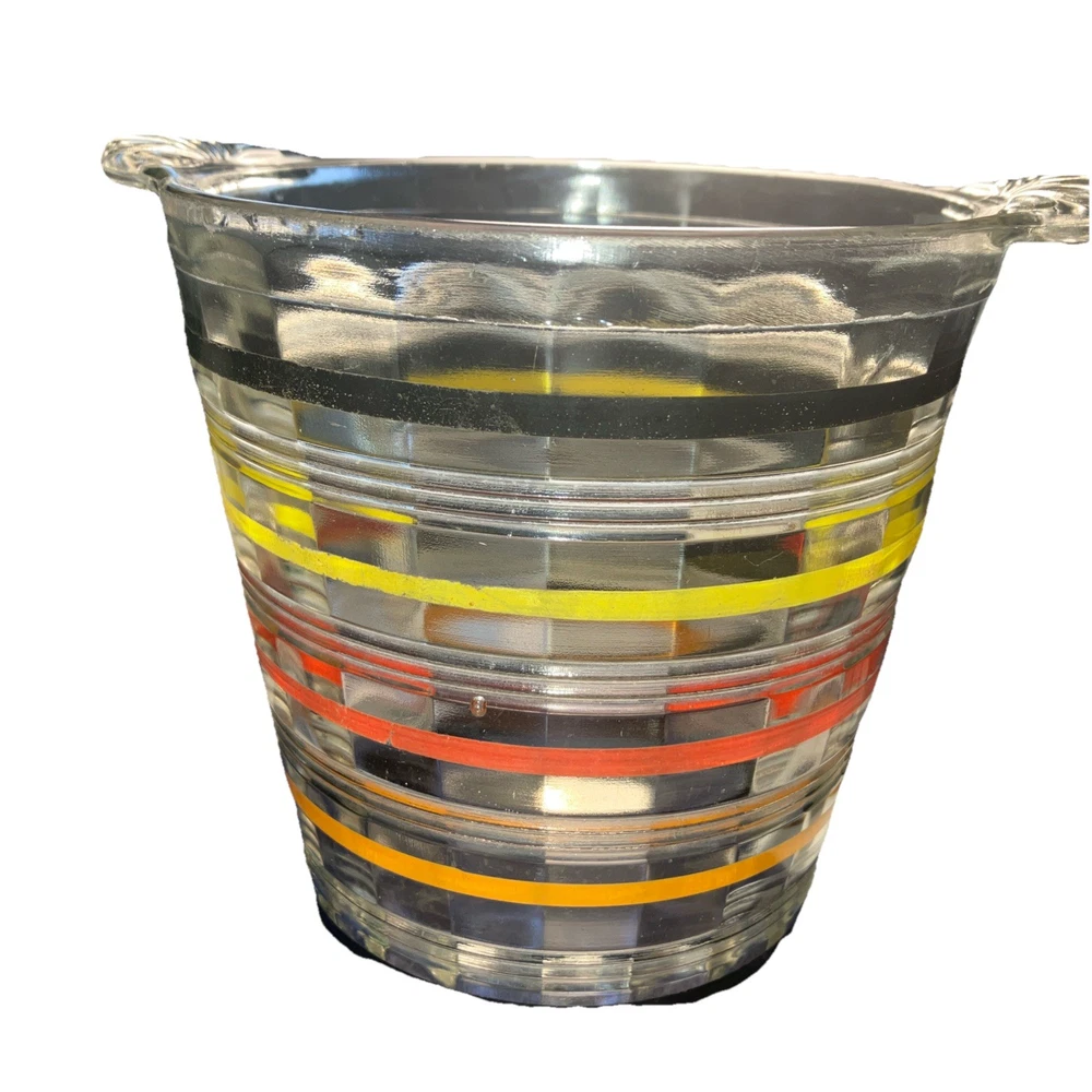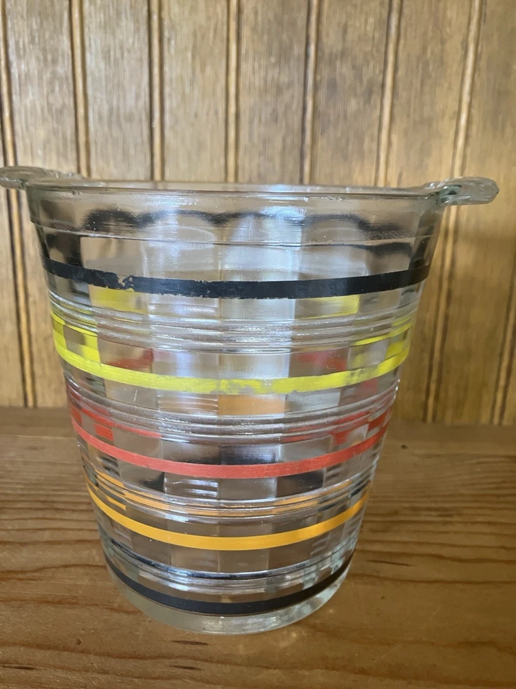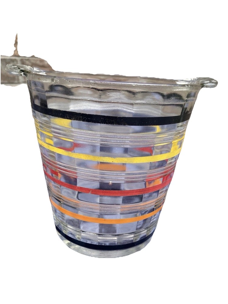 The Art Deco Anchor Hocking Color Ringed Ribbed Ice Bucket is a stunning piece of retro barware from the 1920-1949 time period. This multicolor glass ice bucket features a ribbed pattern and a handle, making it both stylish and functional. Made in the United States, this original piece showcases a unique design that adds a touch of elegance to any home or collection. With a diameter of 5 inches and a height of 5 1/2 inches, this ice bucket is perfect for all occasions and is sure to be a conversation starter in any kitchen or bar setting.
